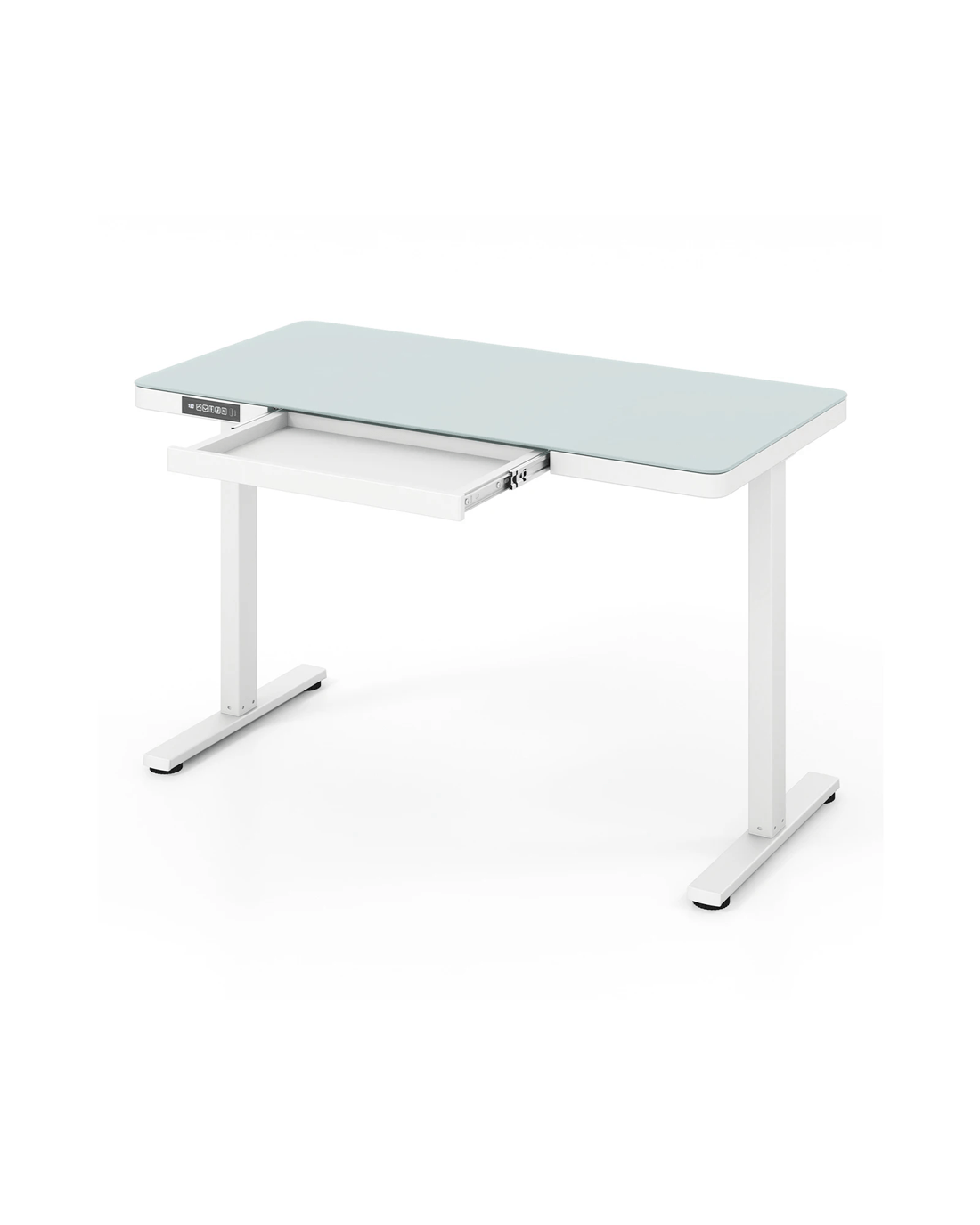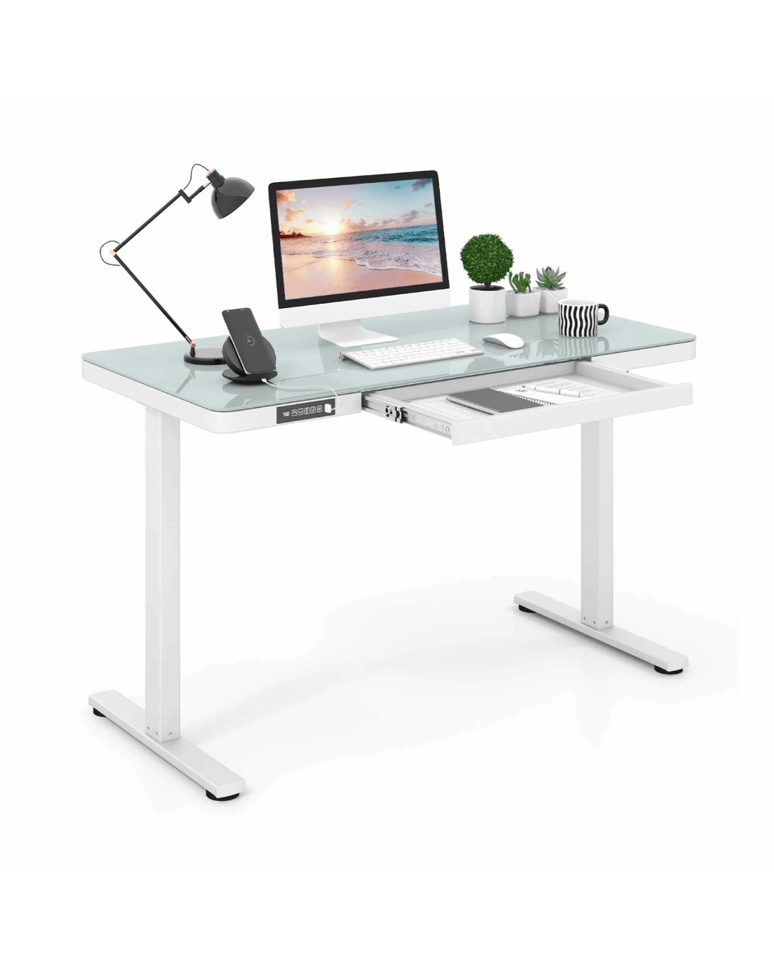 Upgrade your workspace with the cutting-edge electric standing desk. This desk features a sleek, waterproof, scratch-resistant, and writable tempered glass top that is perfect for brainstorming sessions. Easily switch from sitting to standing with adjustable height settings and a convenient control panel with a digital display. Keep your devices charged with built-in USB and Type-C ports, while staying organized with smooth, silent drawers. Say goodbye to messy cords and hello to efficiency. With an advanced anti-collision mechanism, your workspace is safe from accidental bumps. Enhance productivity and style in your office or home with this innovative desk. Activate little one Lock by holding UP & DOWN together for 5 seconds. Experience convenience and elegance like never before.