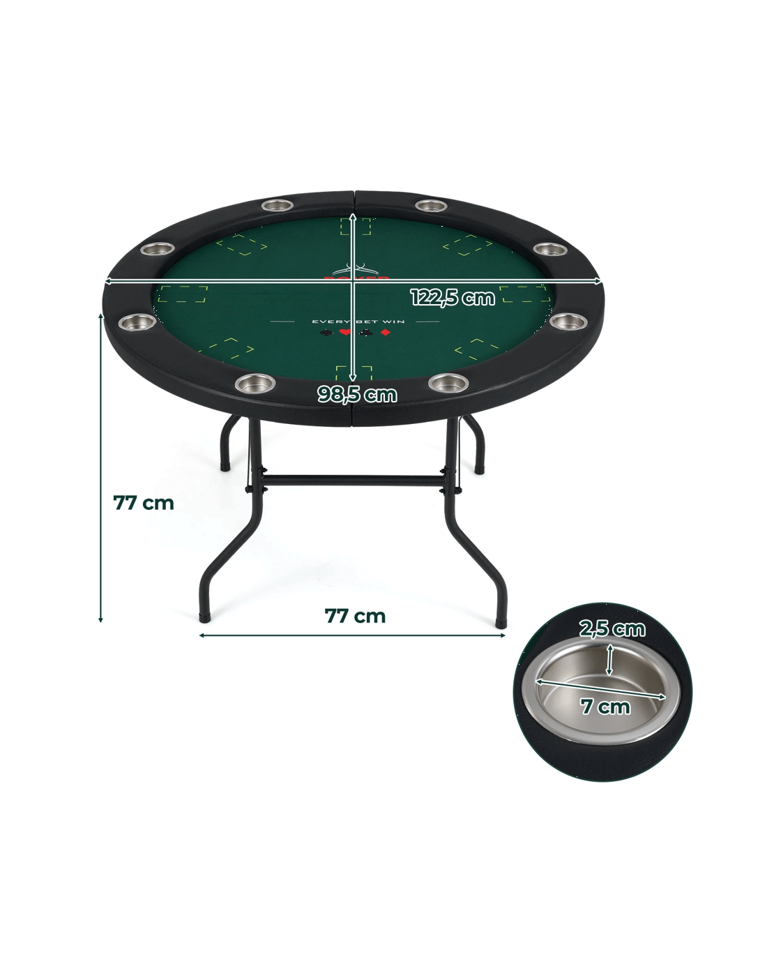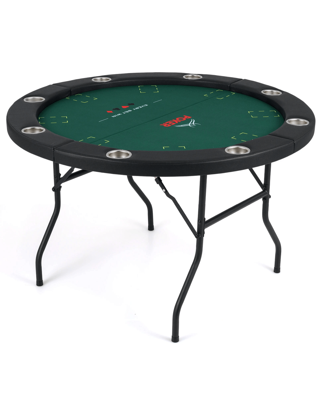 Featuring a spacious round tabletop, this card gaming table is ideal for a range of matches including Texas Hold and blackjack, offering ample room for players. The sturdy metal legs boast a quick-folding mechanism, allowing for easy setup and compact storage, while the robust triangular supports and anti-slip foot pads ensure lasting stability. The soft and wear-resistant padded armrest and smooth surface ensure comfort and professional play, making every match enjoyable. In addition, complete with 8 built-in cup holders, it keeps drinks within easy reach and adds organized style to your card nights. Whether for family gatherings, friendly tournaments, or club events, this folding casino table elevates night for all.