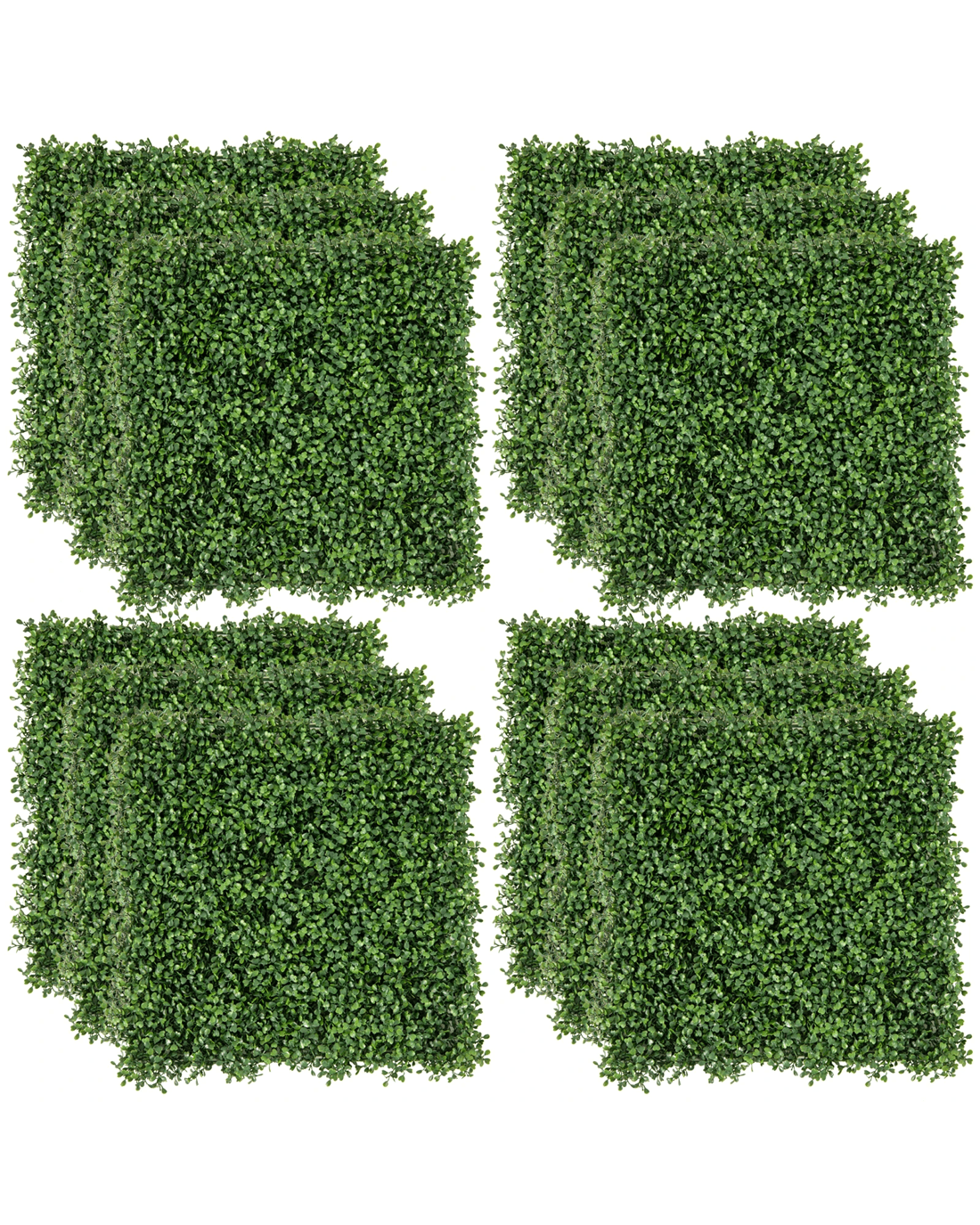 Why choose us? Made of 100% new PE, the artificial grass wall panels are anti-fading and sun-proof, ensuring long-lasting performance in outdoors. The 4 layers of dense leaves feature realistic light & dark green leaves, adding a touch of nature to any setting. In addition, the 12 pcs greenery backdrop wall panels are evergreen in all seasons without constant upkeep. With interlocking connectors and cuttable design, the privacy hedge screen is easy to setup and DIY cutting shape. Furthermore, the faux grass panels allow for zip tie fixation(not included) on fence or railing and nail fixation(not included) on wall. Therefore, the fence covering privacy can be widely applied to garden, shop, wedding, home or balcony. How many sets you need?