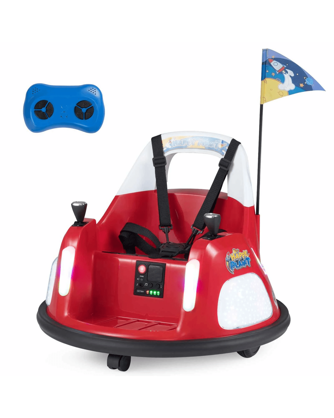 This ride on car delivers thrilling fun with an innovative security design for bumper car adventures. Equipped with a vibrant control panel, it plays lively music and showcases 5 lighting modes, while wireless connectivity lets little ones jam to their favorite tunes. A one-button start makes driving simple and hassle-free. Security shines with a secure 5-point security belt, shock-absorbing bumper, and a steady pace powered by dual 15W motors and a 12V 1.2-2 km/h battery. Young drivers can steer independently using dual joysticks, or parents can seamlessly take charge with a remote to control speed, direction, and braking. Thanks to its smooth 360° spinning and ability to conquer different surfaces like wood, brick, rubber, and asphalt, little ones can race and twirl both indoors and outdoors. With well-made details and adorned with a charming flag, this ride on car stands out from others and makes an unforgettable gift for birthdays and special celebrations.