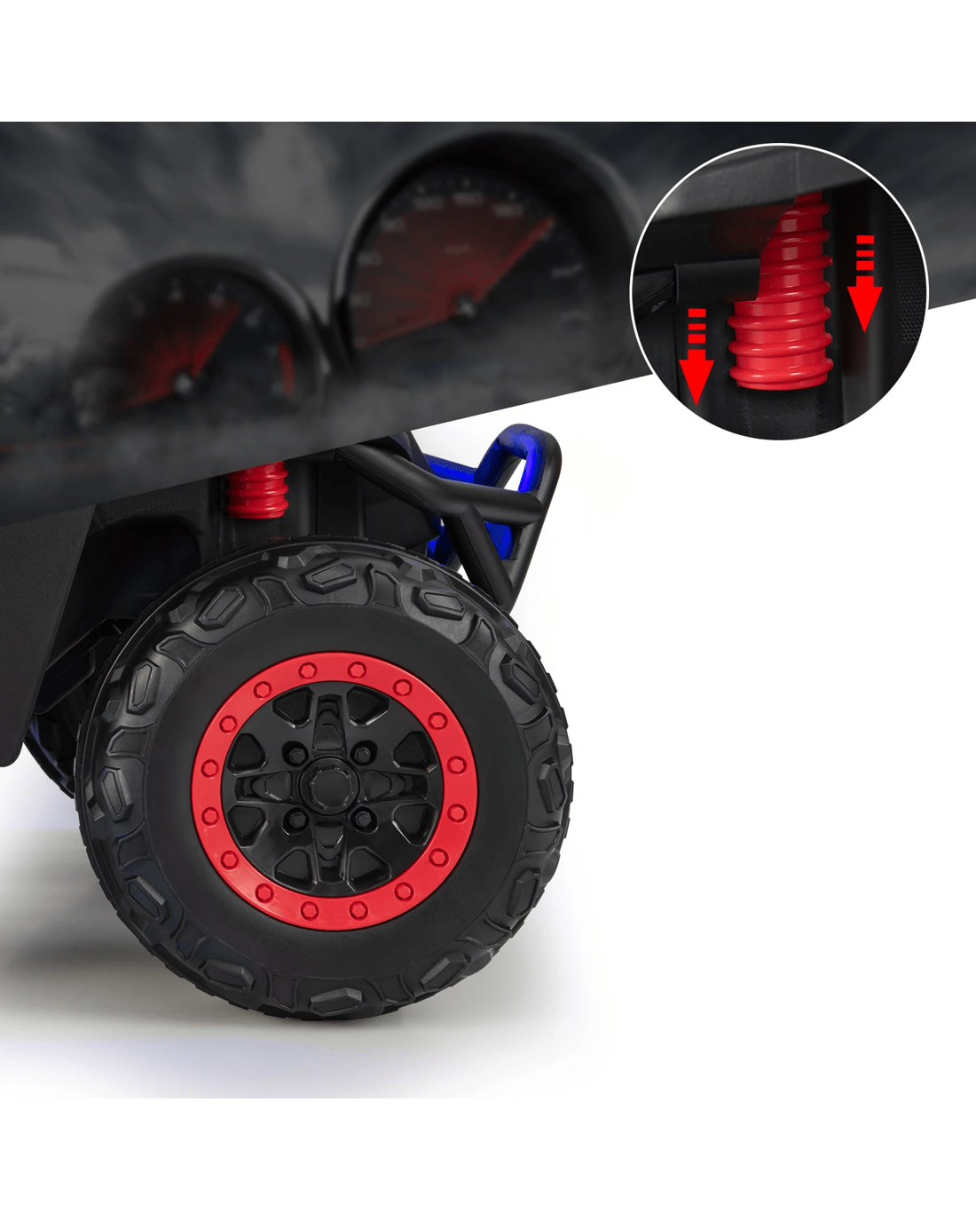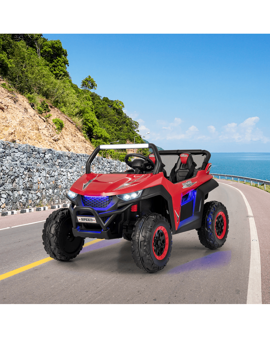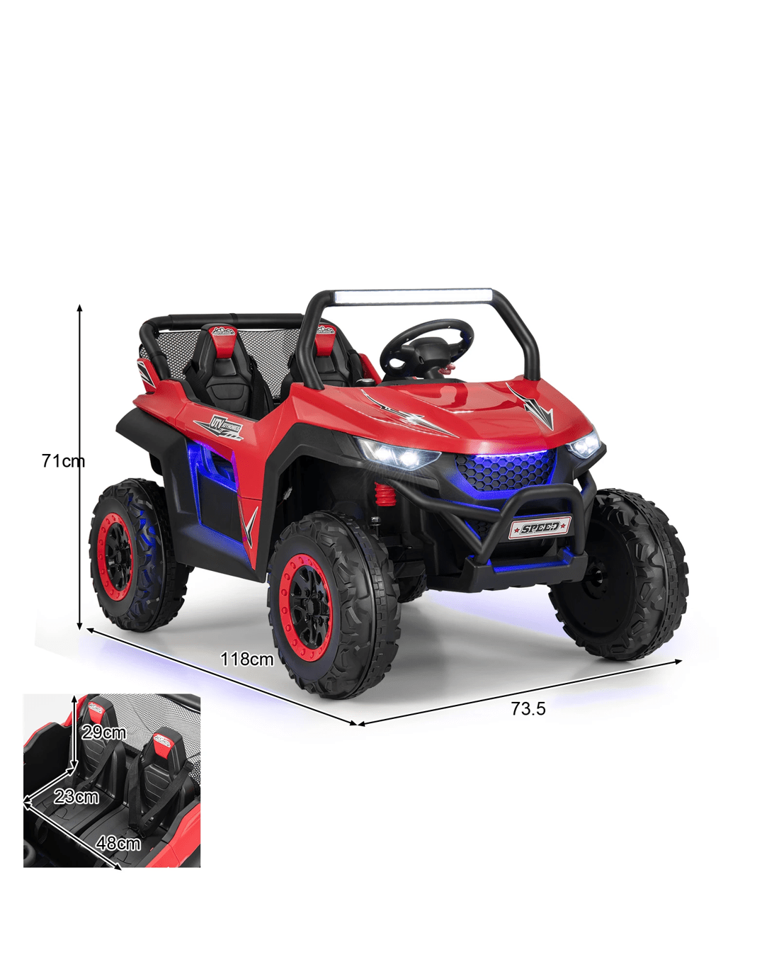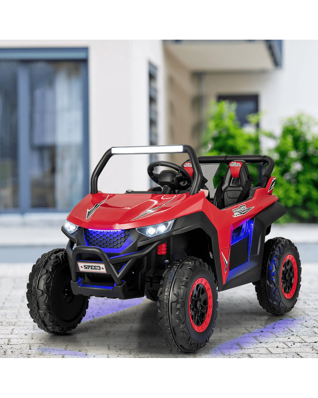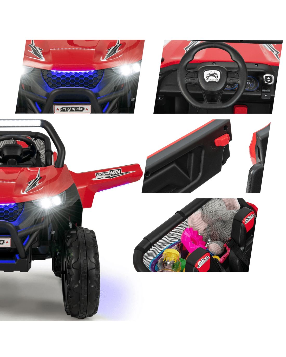 The bright headlights paired with astonishing ambiance lights create an eye-catching UTV and there's no doubt that your little ones will be fond of it. The wide 2-seater design allows 2 little ones to enjoy driving together. What little ones need to do is to turn on the power switch, choose the high / low speed as well as forward / reverse direction, and then press the foot pedal. The slow start technology and wear-resistant wheels with spring suspension ensure smooth and steady driving on various terrains. In addition, the built-in music and vivid horn sound won't let your little ones feel bored while driving. You can also insert your own USB, connect the car with your mobile phone to play music, and press the FM button to listen to the radio. If you're worried that your little one is too young to drive independently, you can easily control the electric vehicle with the 2.4G remote control.