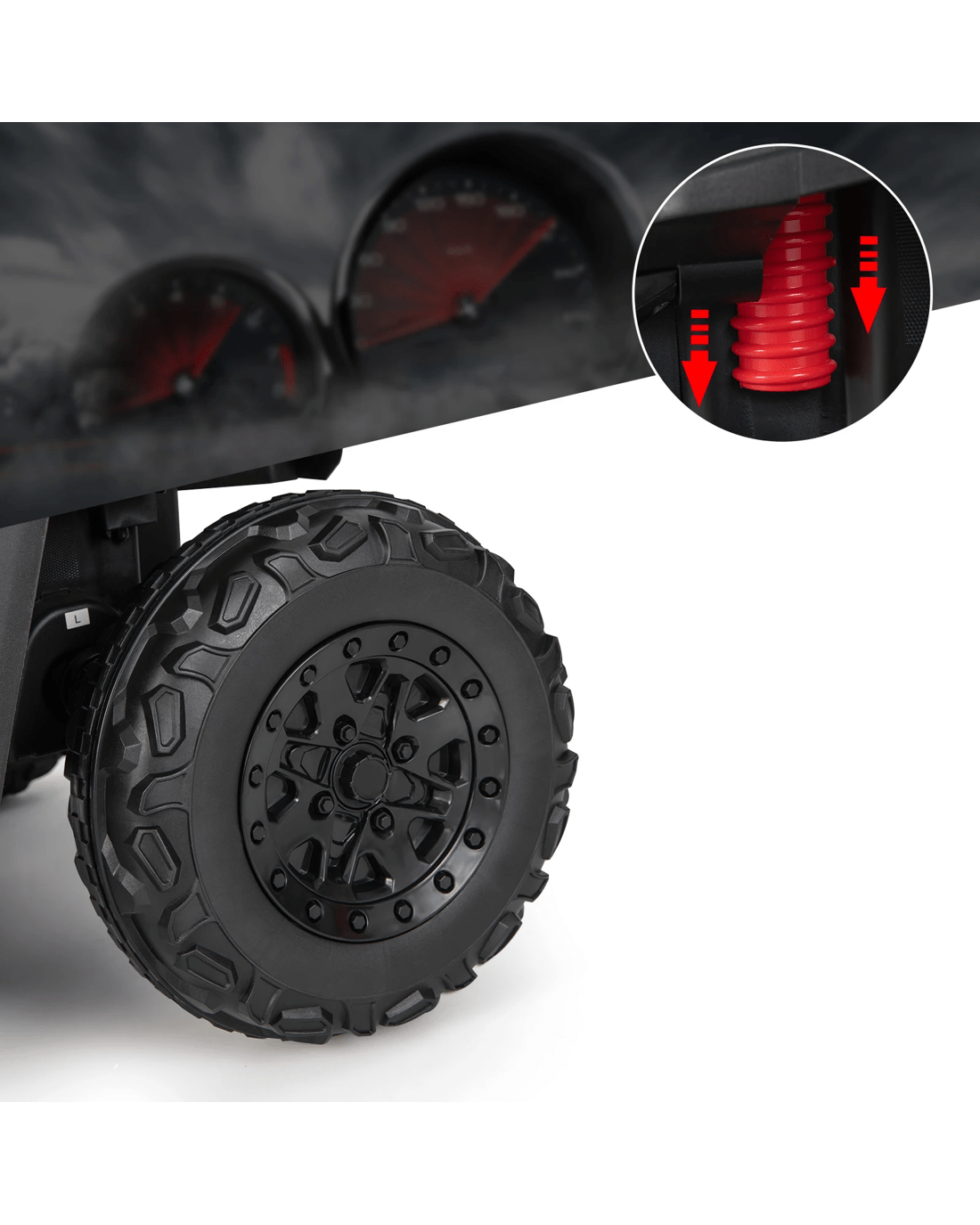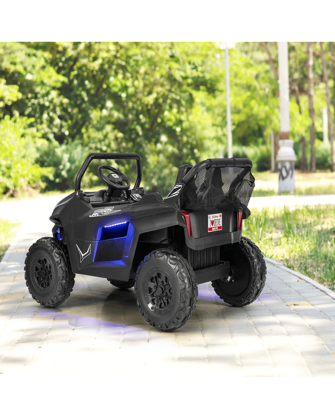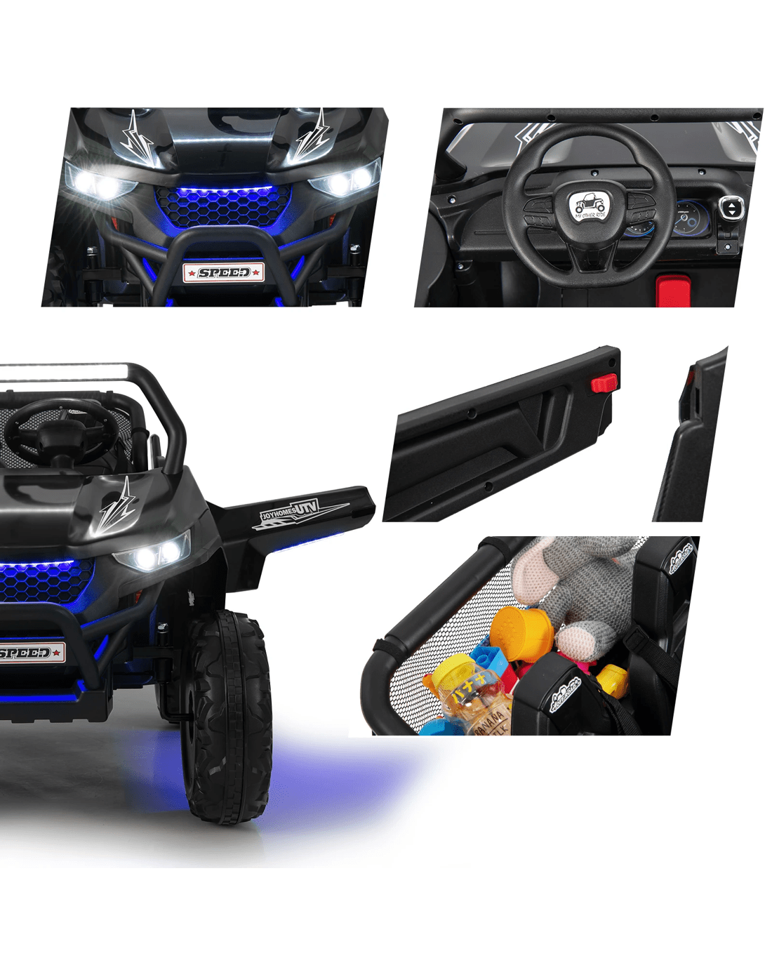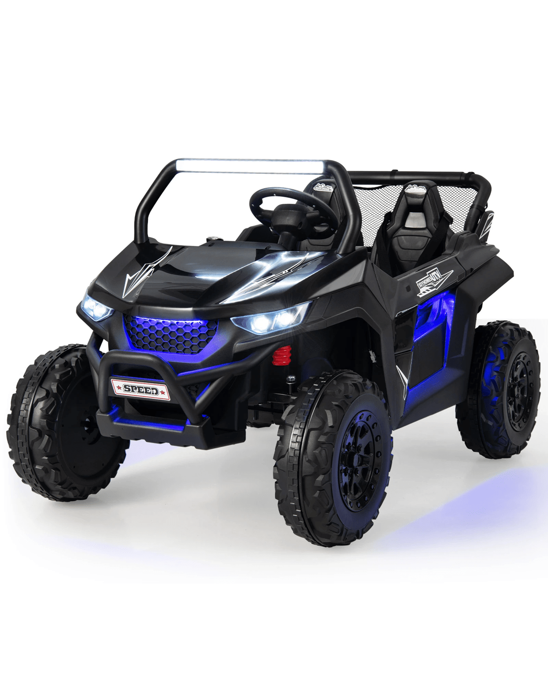 Are you looking for a fantastic gift to surprise your little ones? Our 12V ride on truck won't let you down!The bright headlights paired with astonishing ambiance light s create an eye-catching UTV and there's no doubt that your little ones will be fond of it. The wide 2-seater design allows 2 little ones to enjoy driving together. What little ones need to do is to turn on the power switch, choose the high / low speed as well as forward / reverse direction, and then press the foot pedal. The slow start technology and wear-resistant wheels with spring suspension ensure smooth and steady driving on various terrains. In addition, the built-in music and vivid horn sound won't let your little ones feel bored while driving. You can also insert your own USB, connect the car with your mobile phone to play music, and press the FM button to listen to the radio. If you're worried that your little one is too young to drive independently, you can easily control the electric vehicle with the 2.4G remote control.
