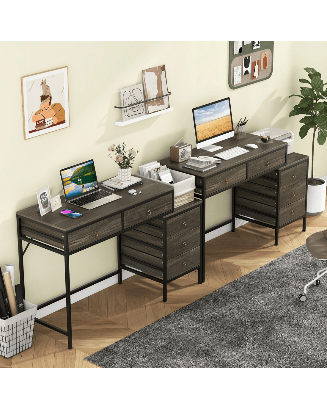 Upgrade your home office with our innovative desk that features a dual desktop design, providing ample space for monitors, keyboards, coffee mugs, printers, and folders. The side cabinet offers additional storage with three drawers, while the desktop itself includes two convenient drawers for organization. The sturdy powder-coated metal frame ensures durability and stability, supporting a weight capacity of up to 172 kg. User-friendly details showcase the better workmanship: the adjustable foot pads and thickened boards enable a reliable and secure workspace. The desk boasts a modern design with a beautifully finished wood grain and black metal frame, elevating your office aesthetics. Whether you're studying, working, or enjoying leisure activities, this versatile desk accommodates all needs. The desk's easy-to-clean surface is smooth and waterproof, which simplifies maintenance. With a perfect balance of style and function, this industrial desk is a must-have addition to any home office setting.