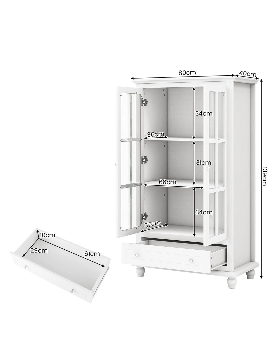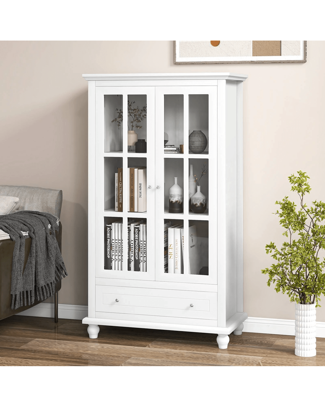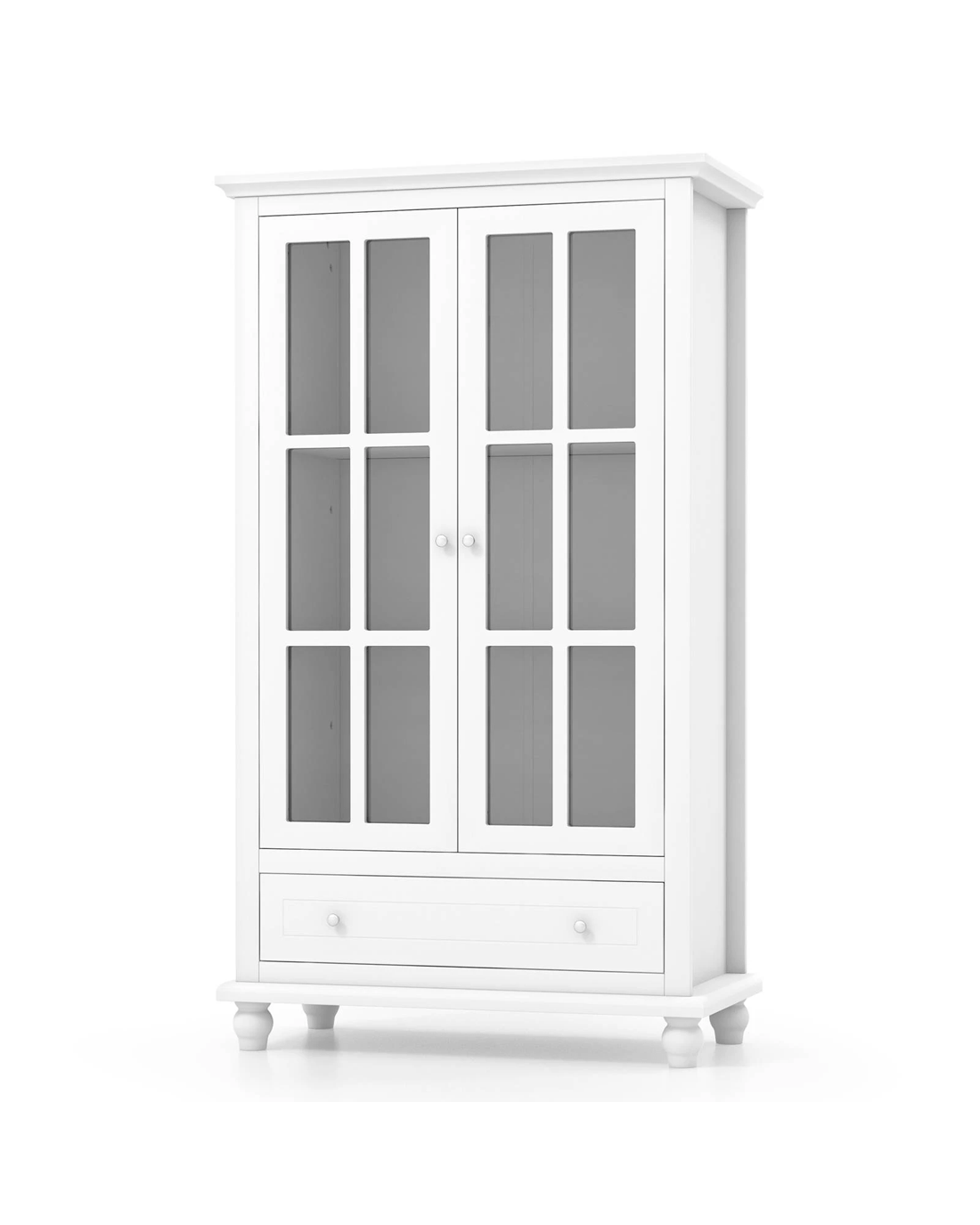 The bookshelf cabinet offers large storage to transform your living space. With a 2-door cabinet & a deep drawer, the storage cabinet can keep your belongings in order. A 3-level adjustable shelf (3.5 cm/per gear) is included to allow for free space arrangement. 2 tempered glass doors ensure perfect displaying of decorations. Security is paramount. With anti-tipping kits & solid wood legs, the bookcase cabinet is fairly stable. Metal hinges & drawer slides will make opening smoother & noises lower. As needed, the bookshelf is applicable to home, office, school, and more. Please notice that the storage cabinet will be shipped in 2 boxes & hardware is included in the 2nd package.