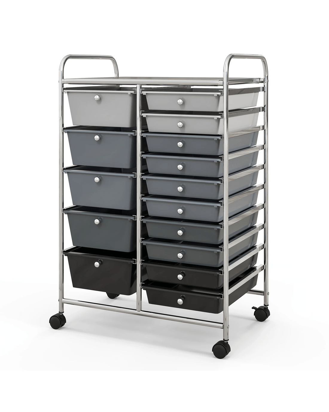 Get organized in style with our sleek and spacious rolling storage cart! Featuring 15 removable drawers, 5 of which are large and 10 are medium-sized, this cart offers plenty of storage options. The galvanized/baked painting metal frame and durable PP drawers ensure long-lasting use, while the 4 universal casters (2 of which are lockable) make it easy to move around. With user-friendly features such as sleek handles and convenient knobs, this cart is perfect for living room storage, playroom storage, salon/barbershop use, or craft & sewing storage. Measuring 25" x 14.5" x 34.5" (L x W x H), the utility cart saves floor space. Make clutter a thing of the past - order now!