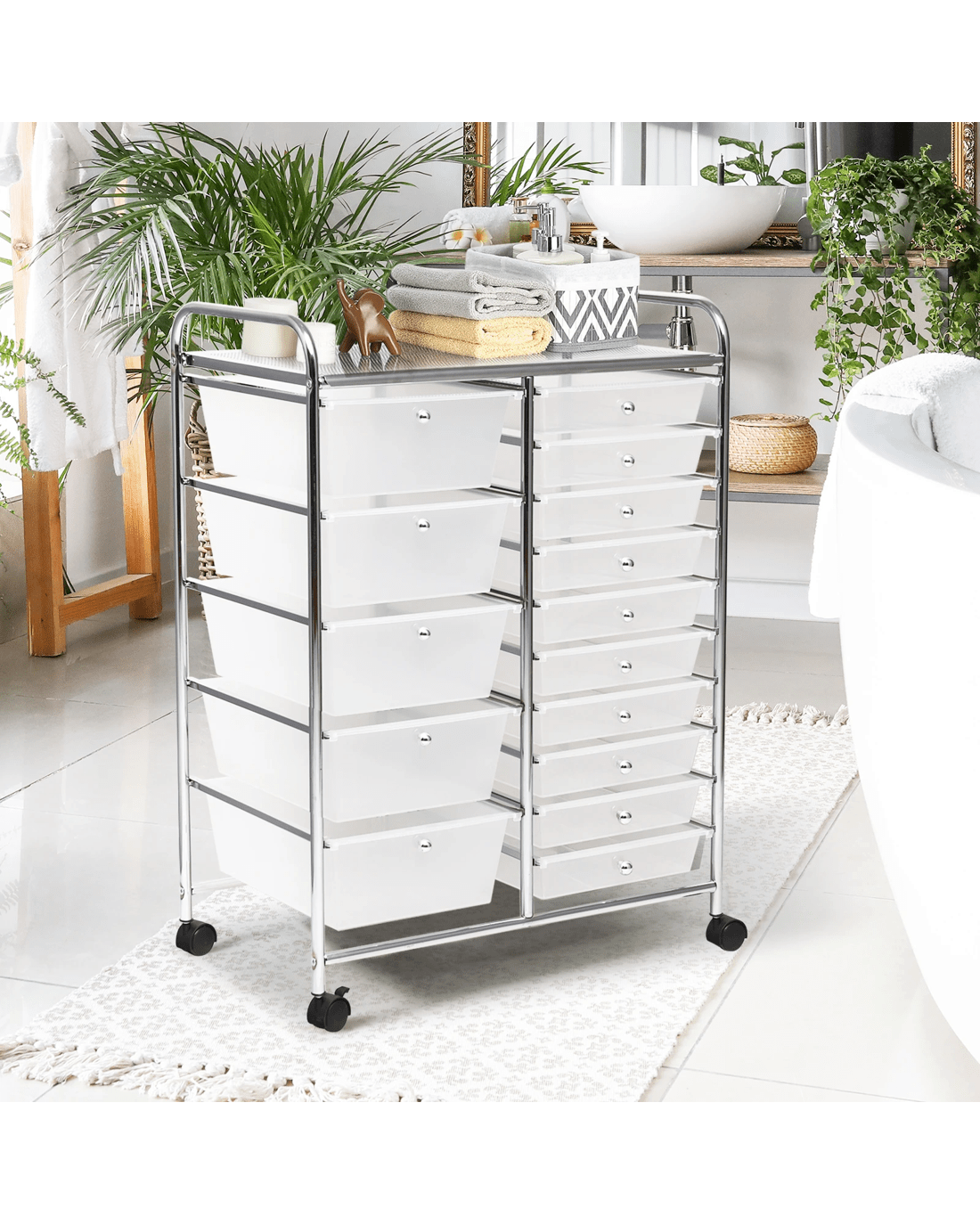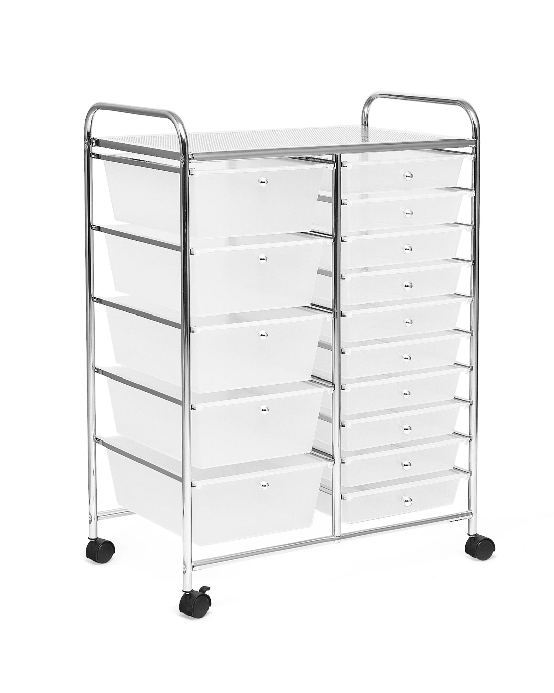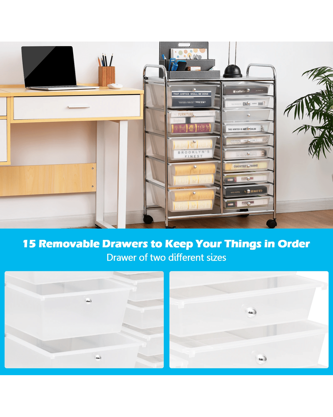Our 15-drawer rolling storage cart will provide enough storage space for you. It is great for paper, tools, accessories, crafting, scrapbooking or home office, helping you to organize and make your tools in order. Constructed of industrial-strength metal tubes and finished in chrome, the drawer cart is sturdy to serve you for a long time. Equipped with easy-to-grab handles and 4 universal wheels, it is easy to move the lightweight cart. And 2 of the wheels have a simple lock for easy stopping. With our utility storage organizer, you can store various things from art and office supplies to cleaning or kitchen essentials. It is ideal to arrange your different stuff at the office, home, school and garage or just about anywhere organization is needed.