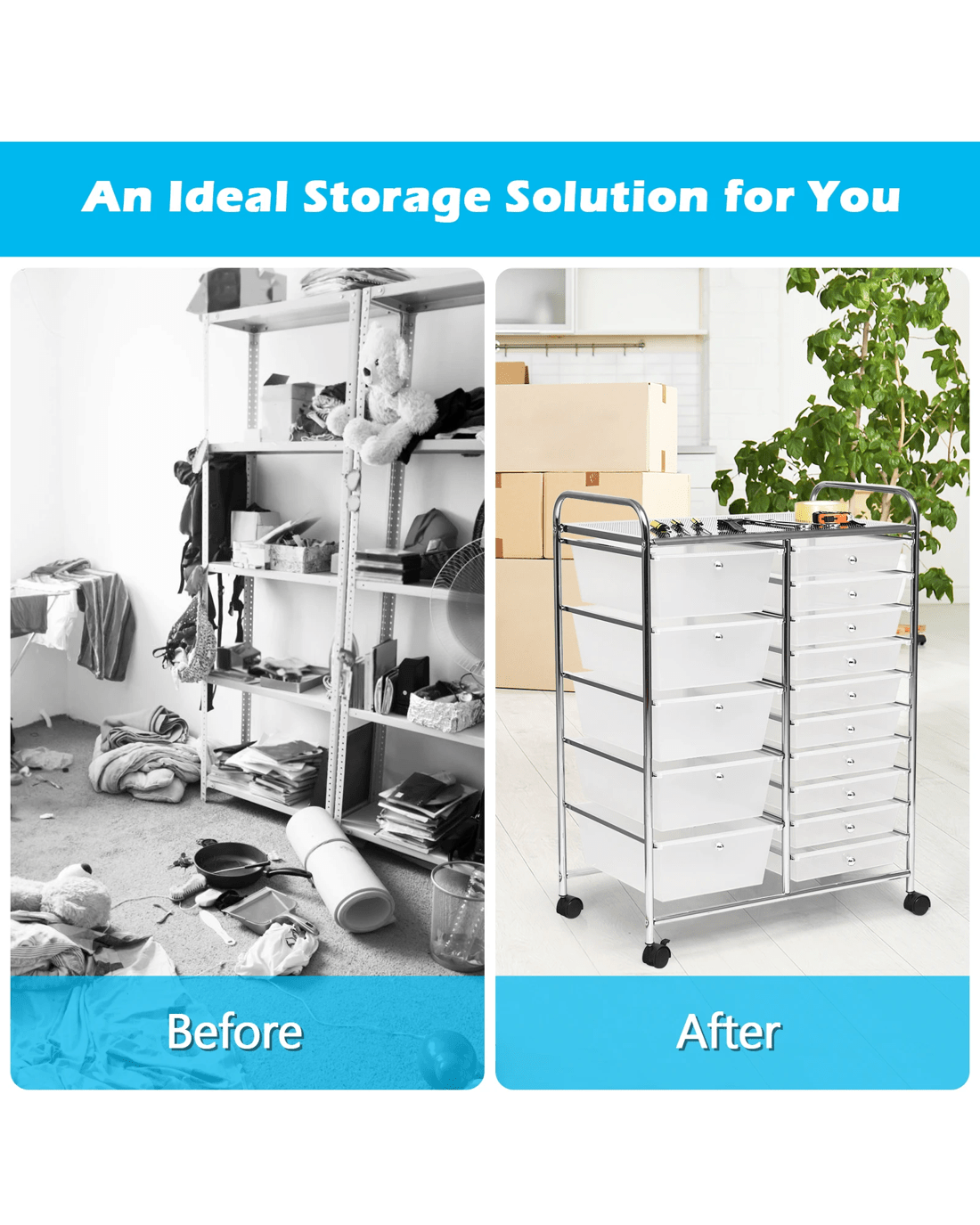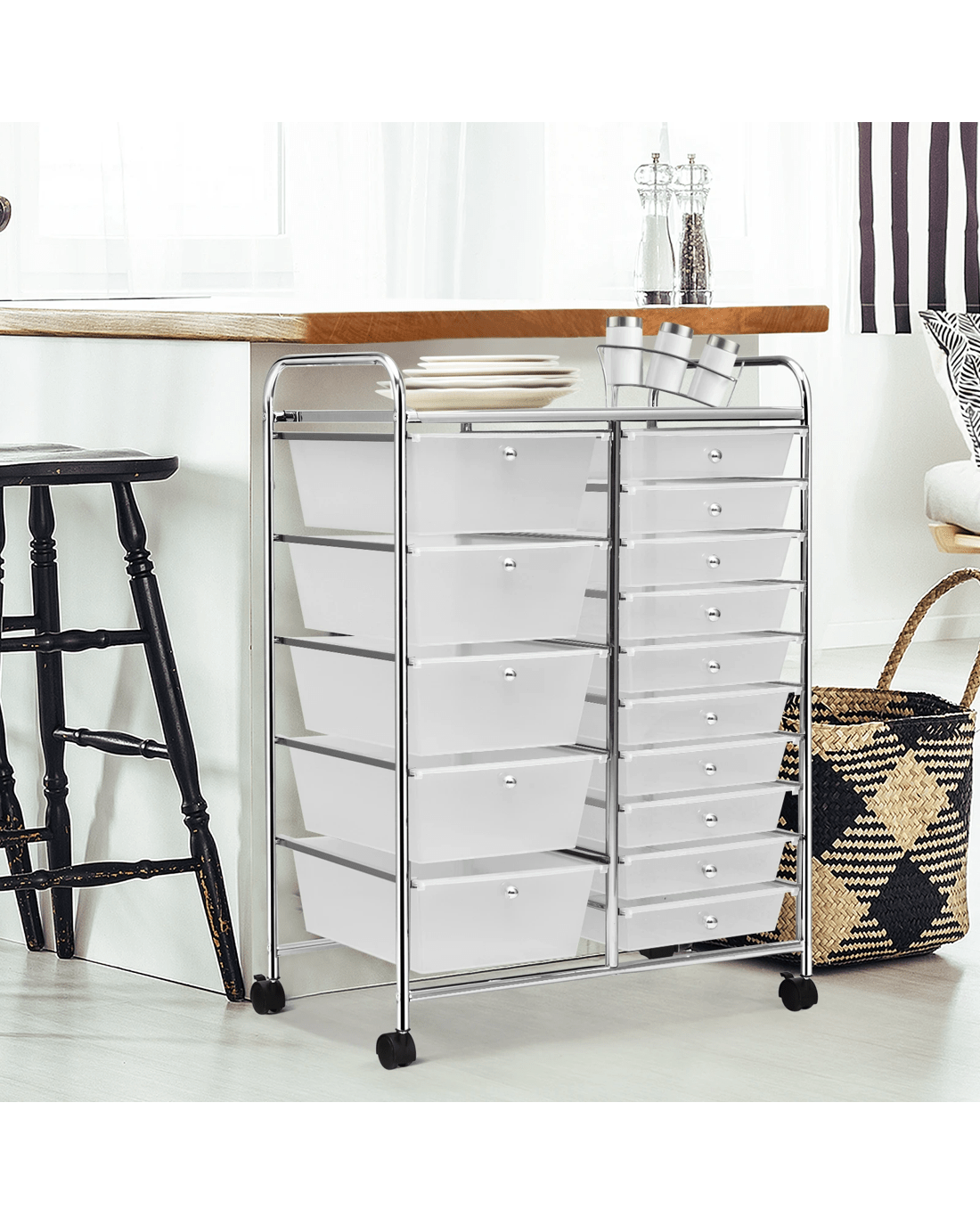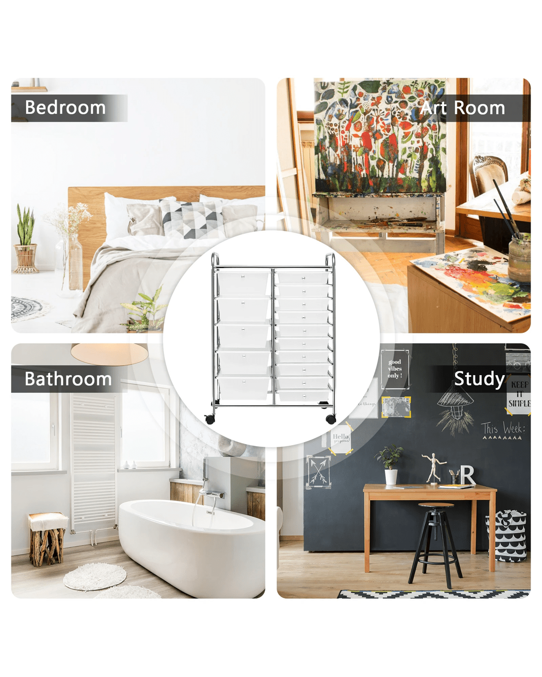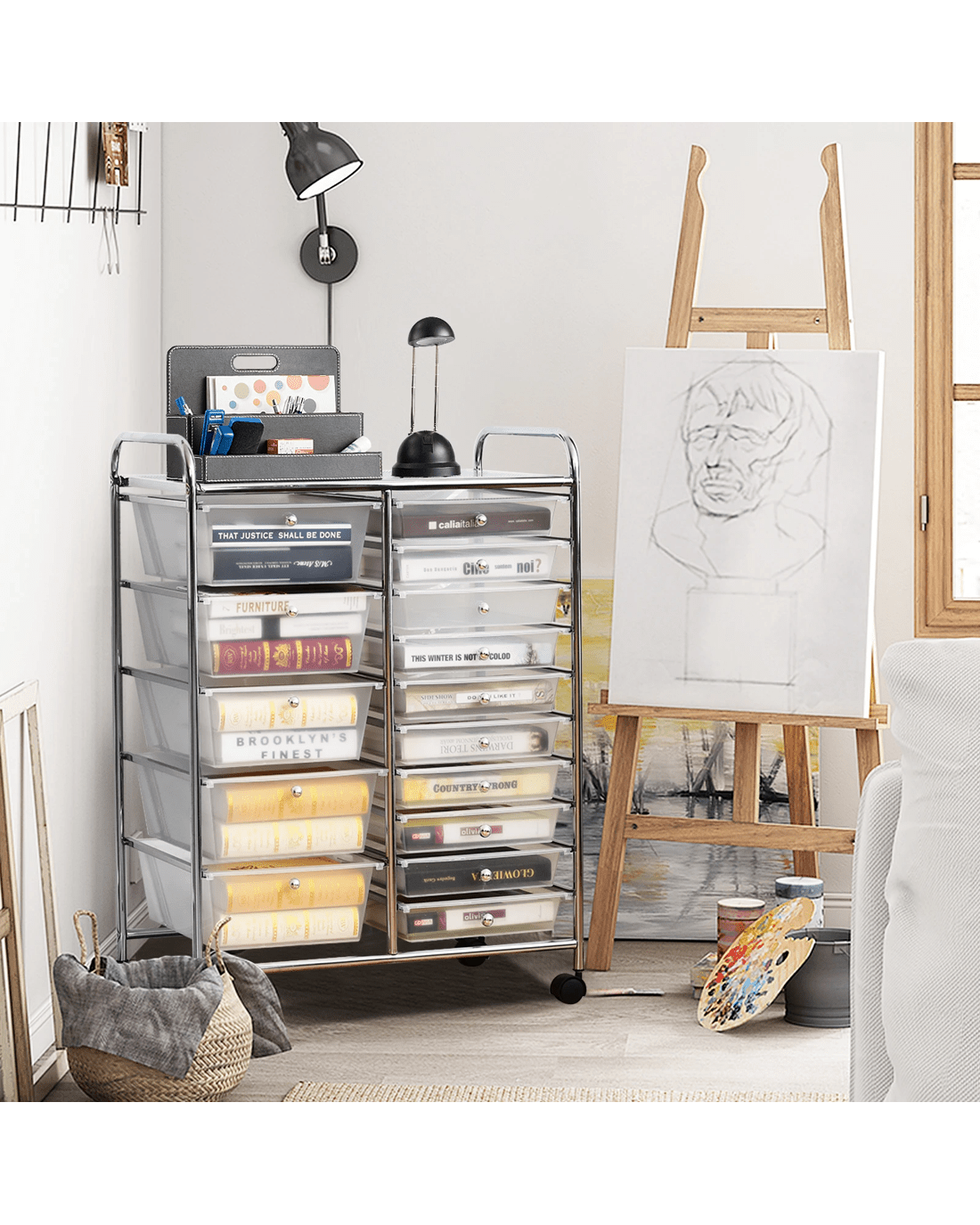 Our 15-drawer rolling storage cart will provide enough storage space for you. It is great for paper, tools, accessories, crafting, scrapbooking or home office, helping you to organize and make your tools in order. Constructed of industrial-strength metal tubes and finished in chrome, the drawer cart is sturdy to serve you for a long time. Equipped with easy-to-grab handles and 4 universal wheels, it is easy to move the lightweight cart. And 2 of the wheels have a simple lock for easy stopping. With our utility storage organizer, you can store various things from art and office supplies to cleaning or kitchen essentials. It is ideal to arrange your different stuff at the office, home, school and garage or just about anywhere organization is needed.