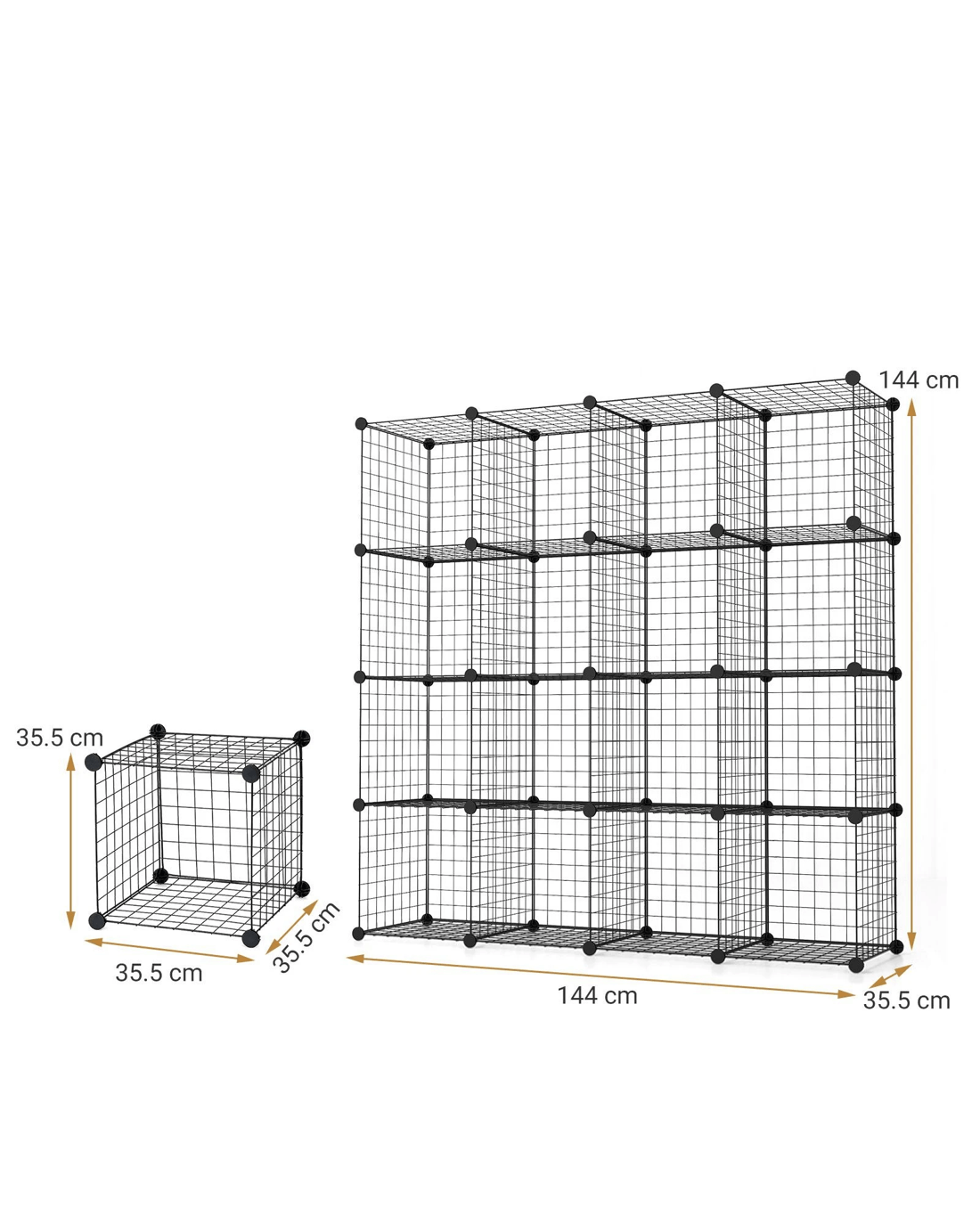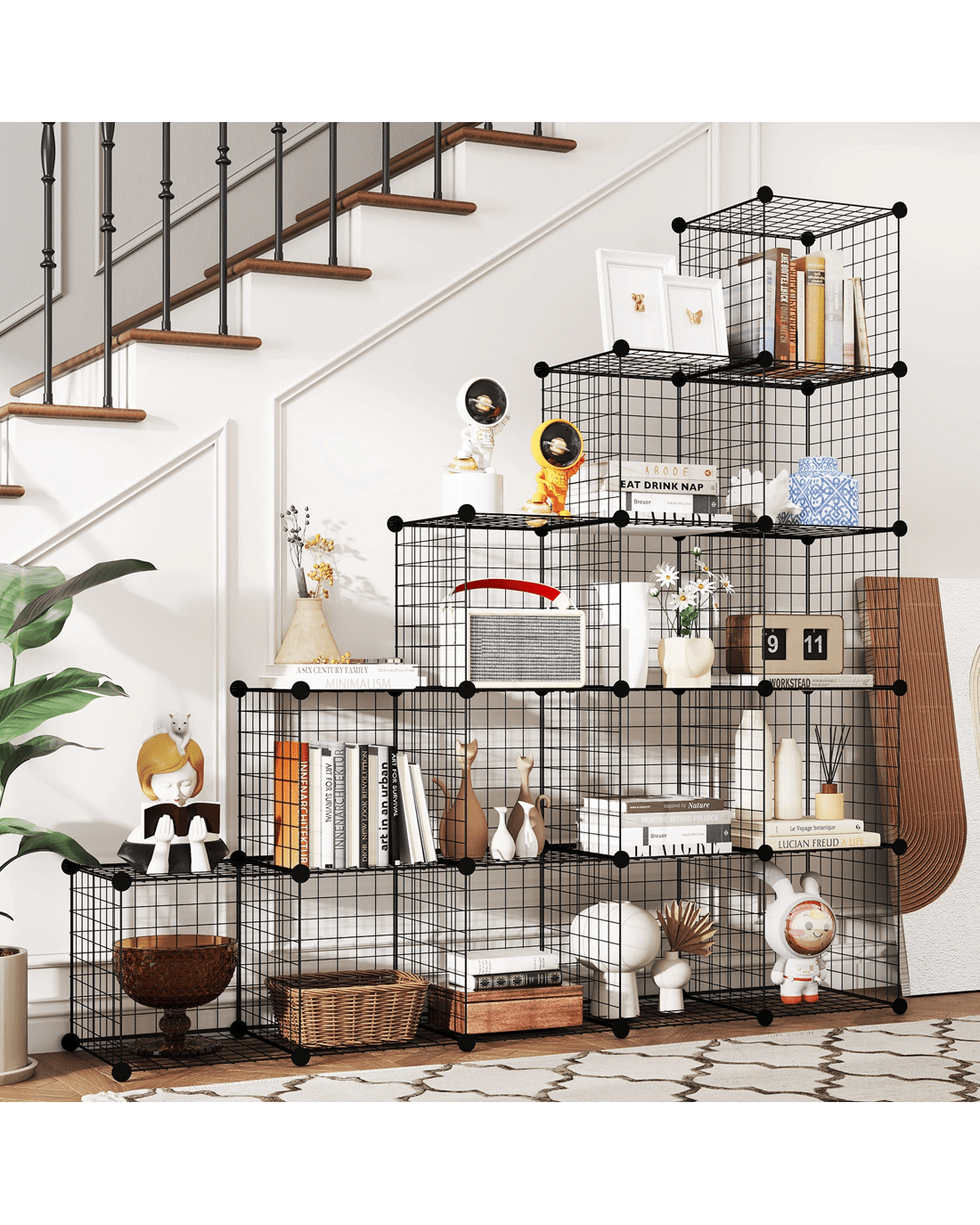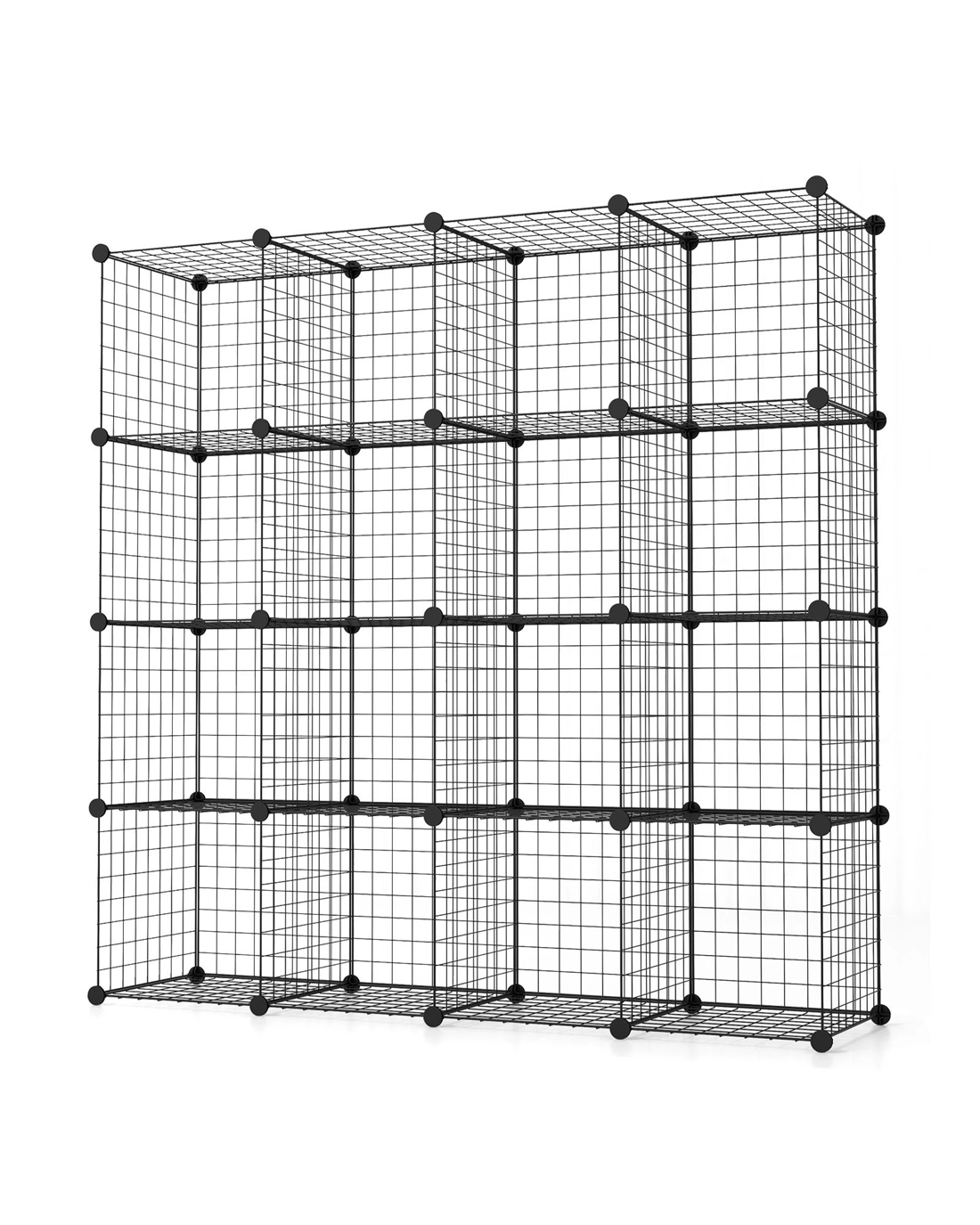 Easy to assemble and flexible combination for your great convenience!This multifunctional organizer serves as a bookshelf, shoe rack, or closet organizer, catering to your storage needs with style and efficiency. Its unique feature of interlocking and stackable cubes provides the freedom to create customized shapes based on your preferences and room layout, ensuring a perfect fit even in limited spaces. With 16 spacious cubes offering ample storage capacity, you can neatly store a variety of items including books, clothes, shoes, bags, toys, decorations, and more. The durable construction of powder-coated metal wire panels prevents rust and wear. Sturdy ABS plastic connectors secure the entire structure firmly, providing stability for each cube with a weight capacity of up to 10 kg. The hassle-free installation process is made simple with the included mallet and detailed instructions, allowing you to effortlessly assemble and disassemble the organizer to fit your space and storage needs.