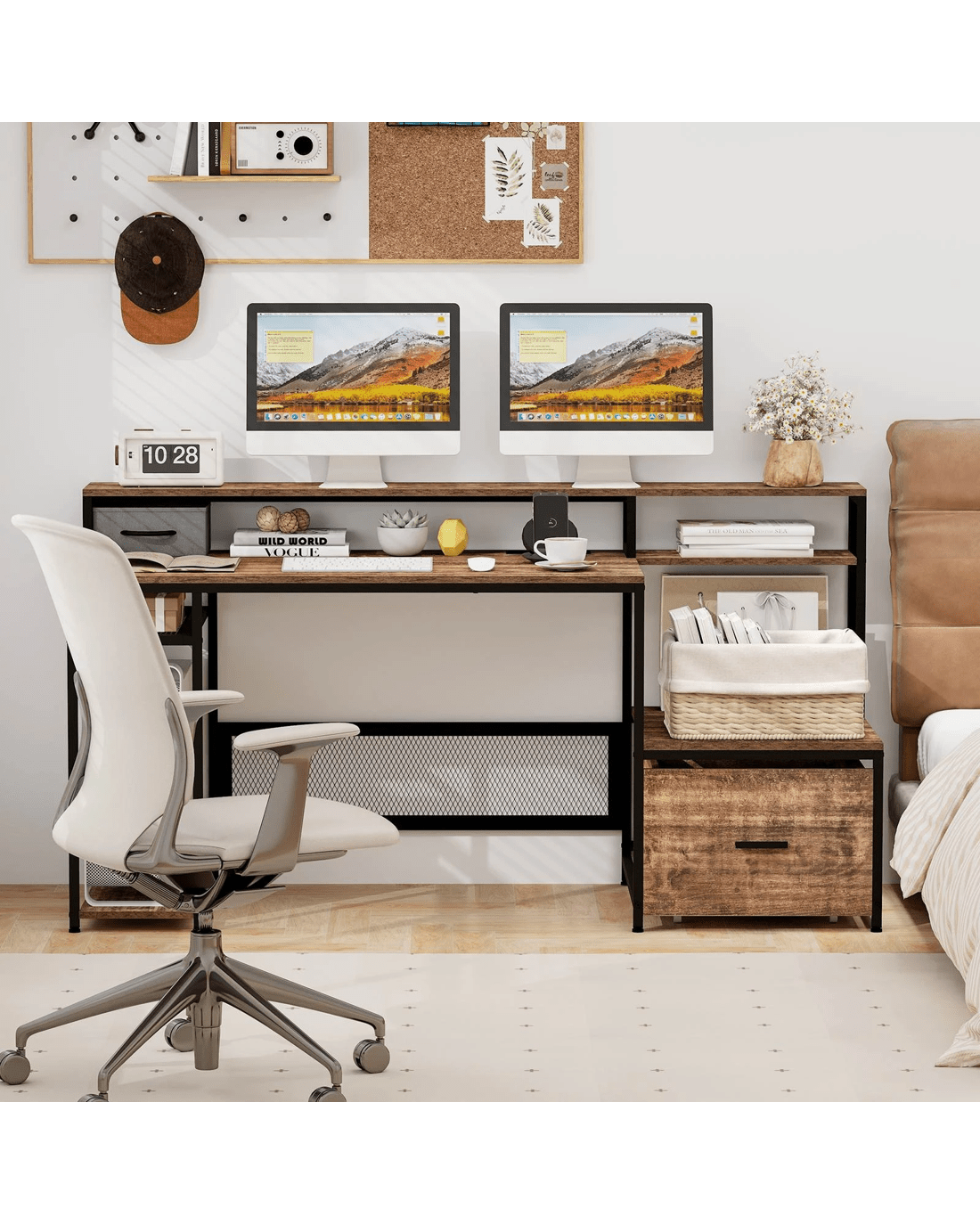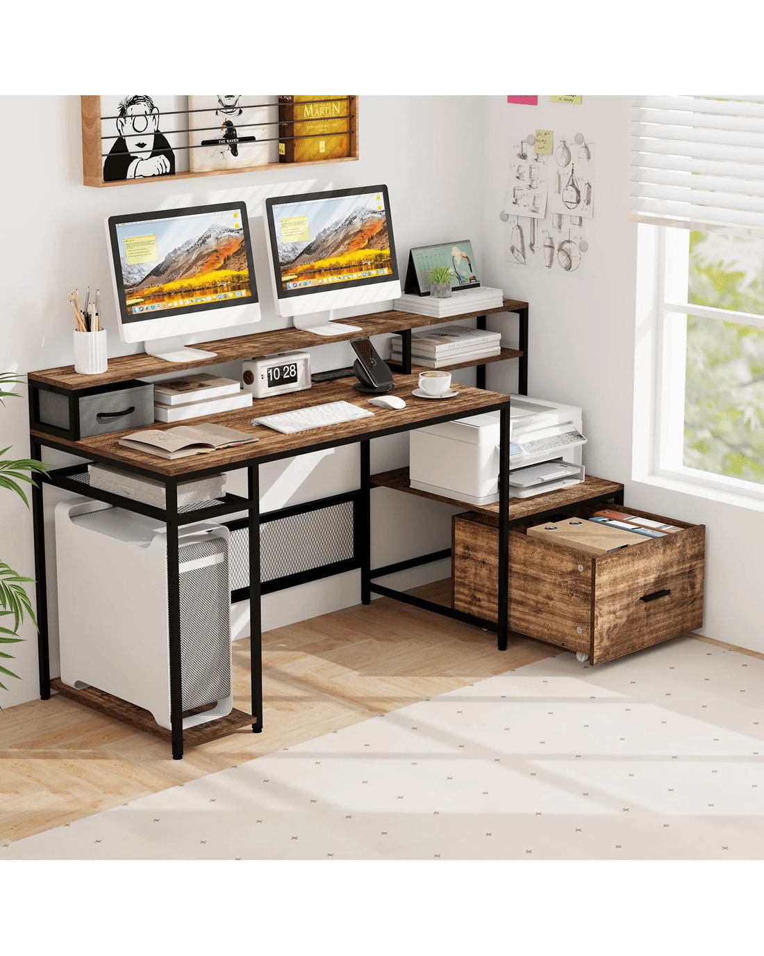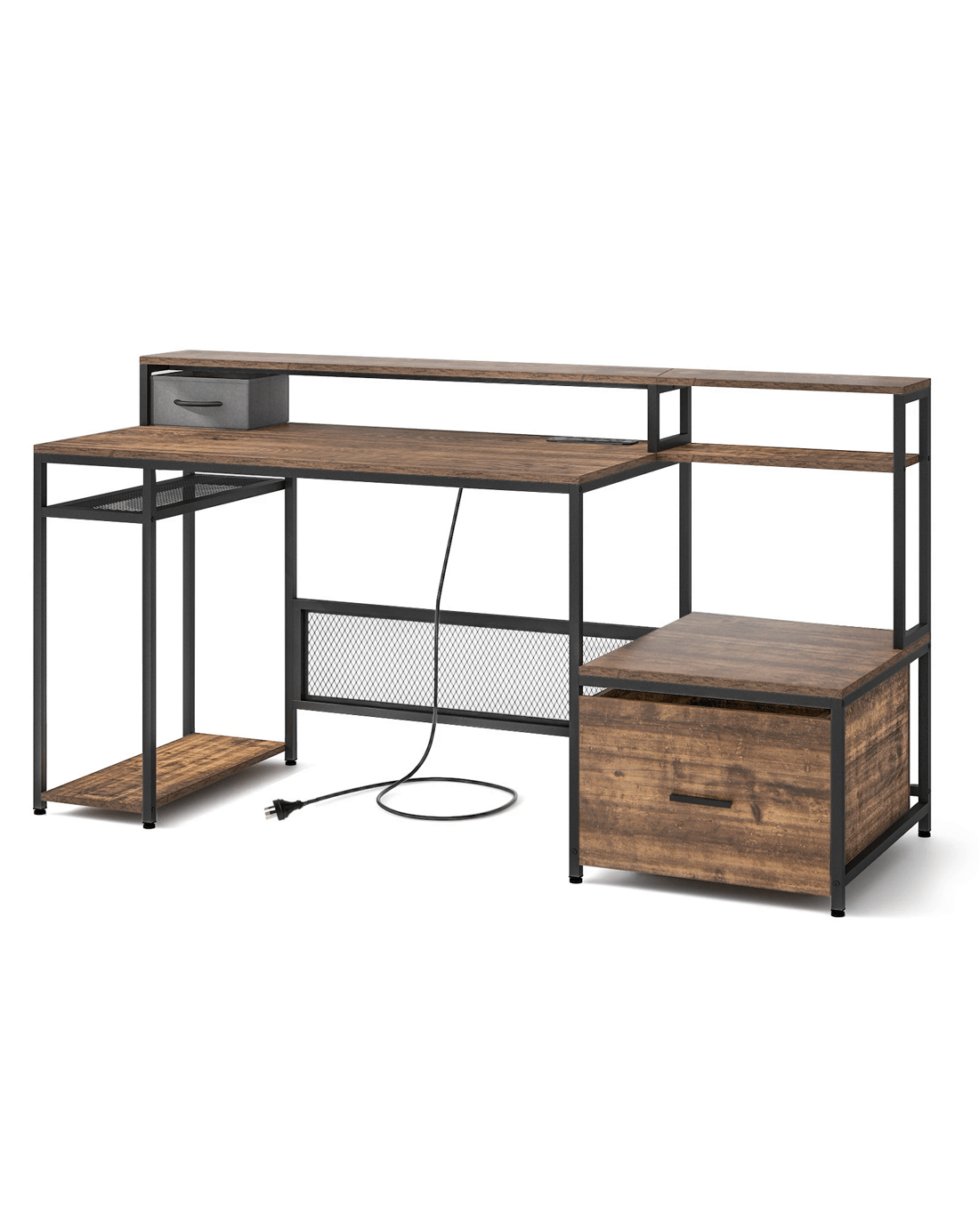 Equipped with built-in power outlets and USB ports, charging multiple devices while working is a breeze. The spacious computer workstation comfortably accommodates monitors and office equipment, while the ergonomic monitor stand promotes proper viewing angles to reduce strain on the neck and eyes. Keep your papers, printer, and folders neatly stored and easily accessible with the file drawer and various storage shelves. The included CPU holder provides a dedicated space for your computer host. With a sturdy metal frame and adjustable foot pads, this computer desk offers stability and reliability. This industrial-style work table is a versatile addition to any home or office, combining strength, stability, and durability.