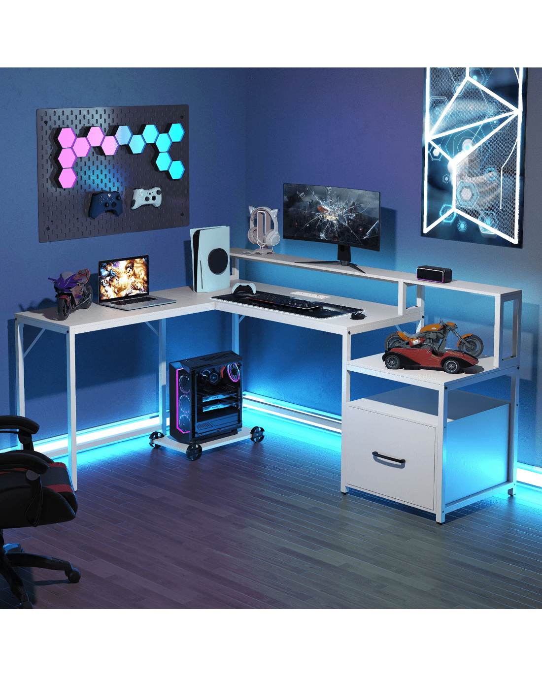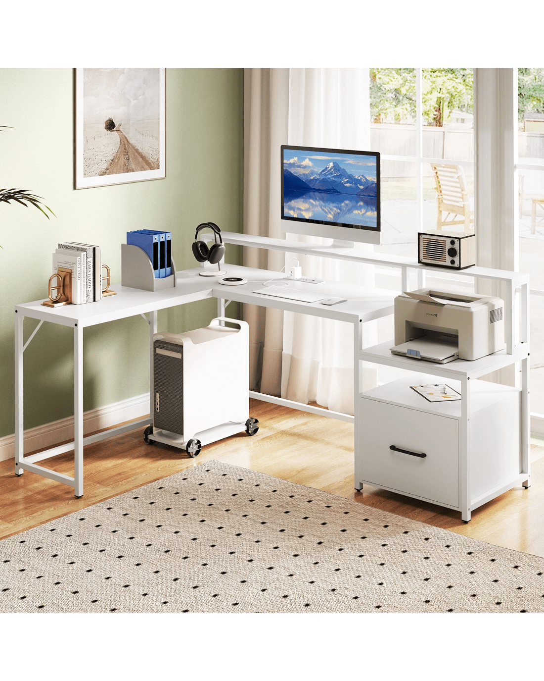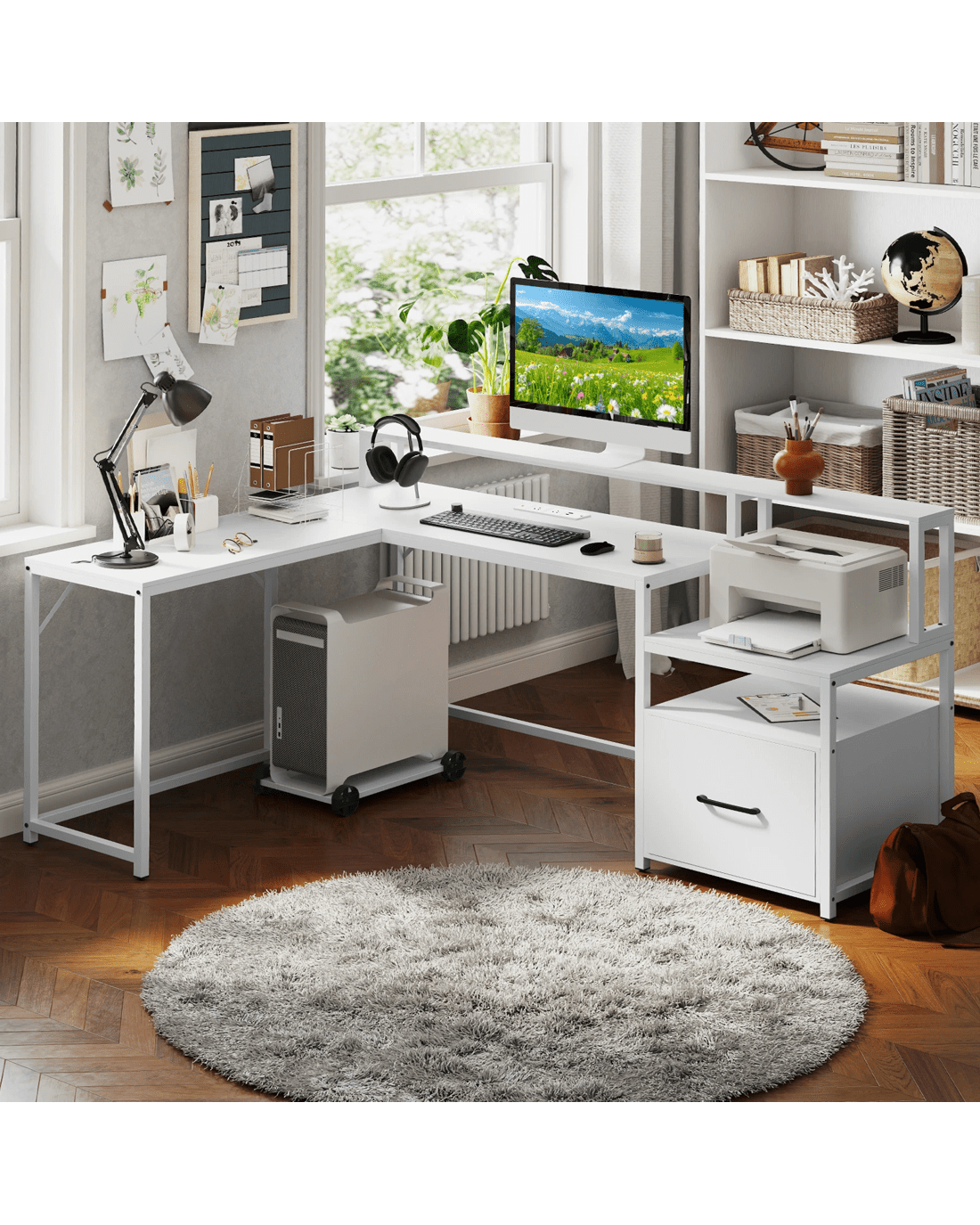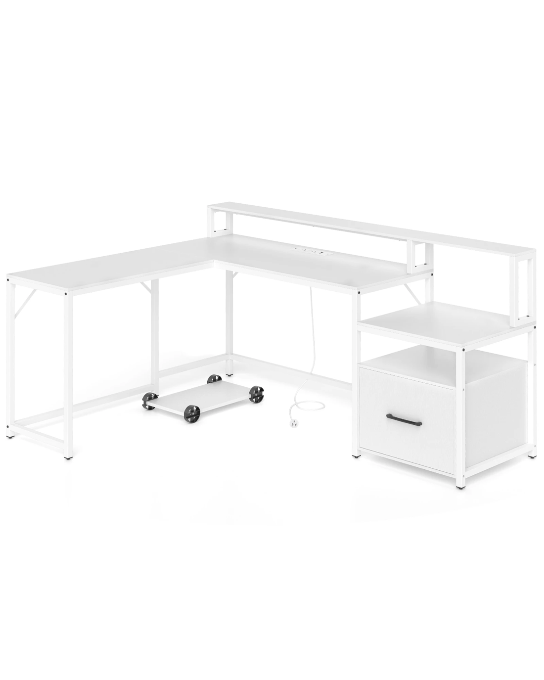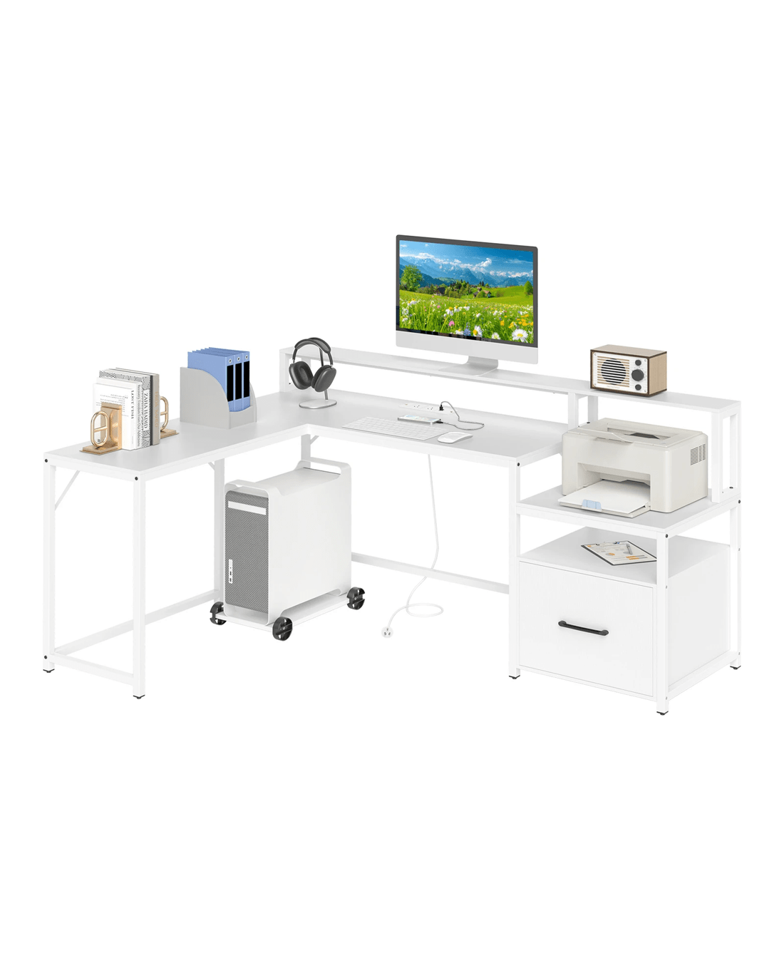 Revolutionize your office setup with this sleek, ultra-functional L-shaped computer desk! Say goodbye to cord chaos with the handy charging station featuring 2 AC outlets, a USB port, and a Type-C port designed to keep your tech at full power. Wave goodbye to clutter with ingenious storage options, including a printer stand and adjustable file cabinet fit for all your documents. Experience unmatched viewing comfort thanks to a cleverly elevated monitor stand that helps to protect your posture. Built to last with a sturdy metal frame and expertly engineered for rock-solid stability, this home office desk fits perfectly into any corner. It’s not just a desk—it’s your new command center for work, gaming, and everything in between. Upgrade your work or play space—transform your productivity and comfort now!