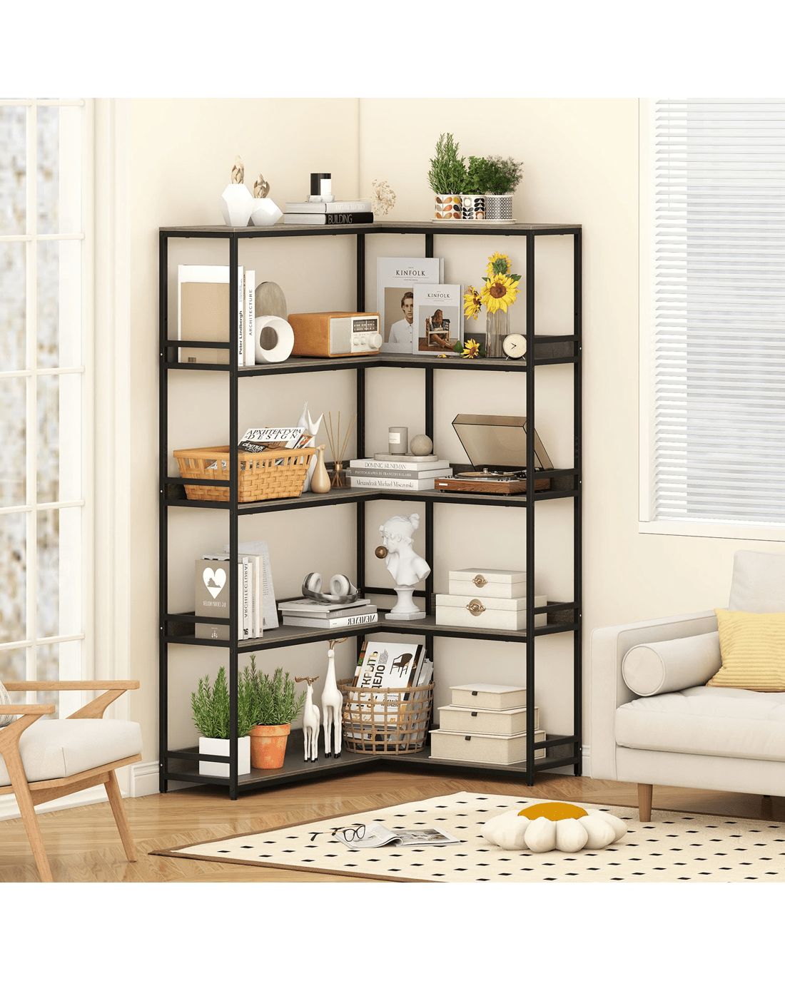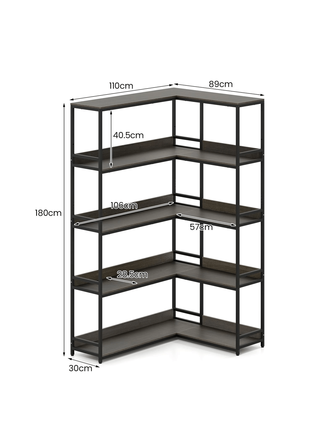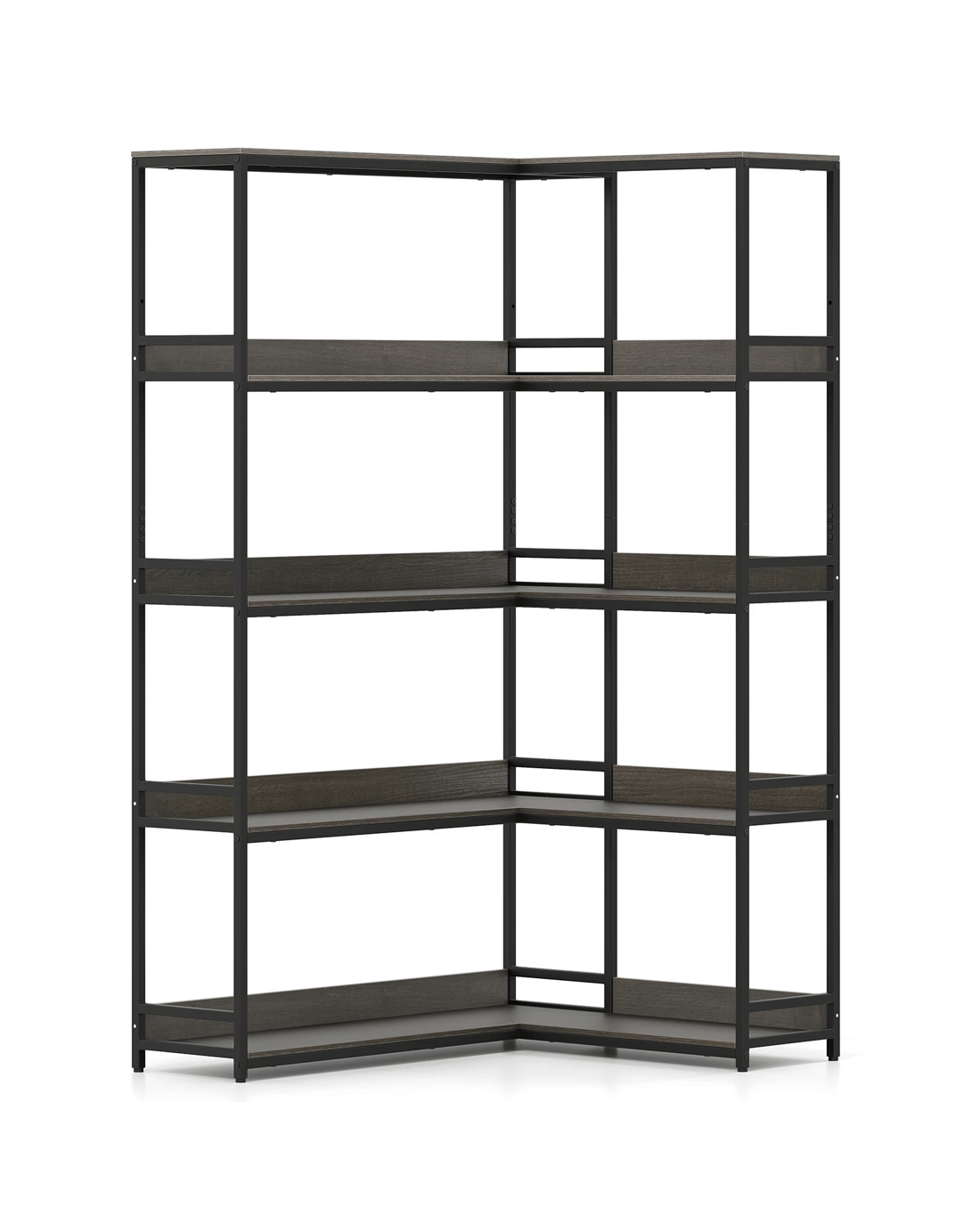Costway 180CM Corner Bookshelf 5-Tier L-Shaped Utility Shelves Metal Frame Bookcase