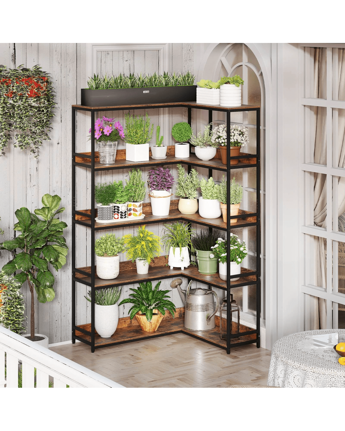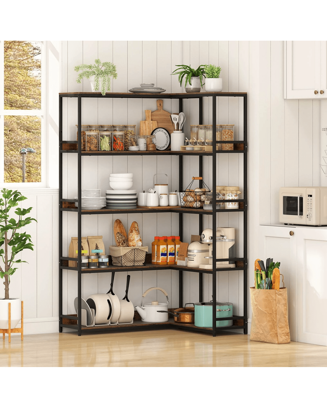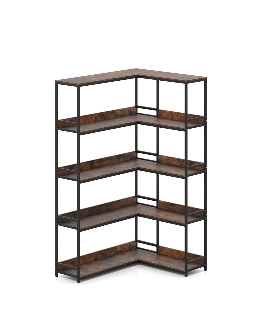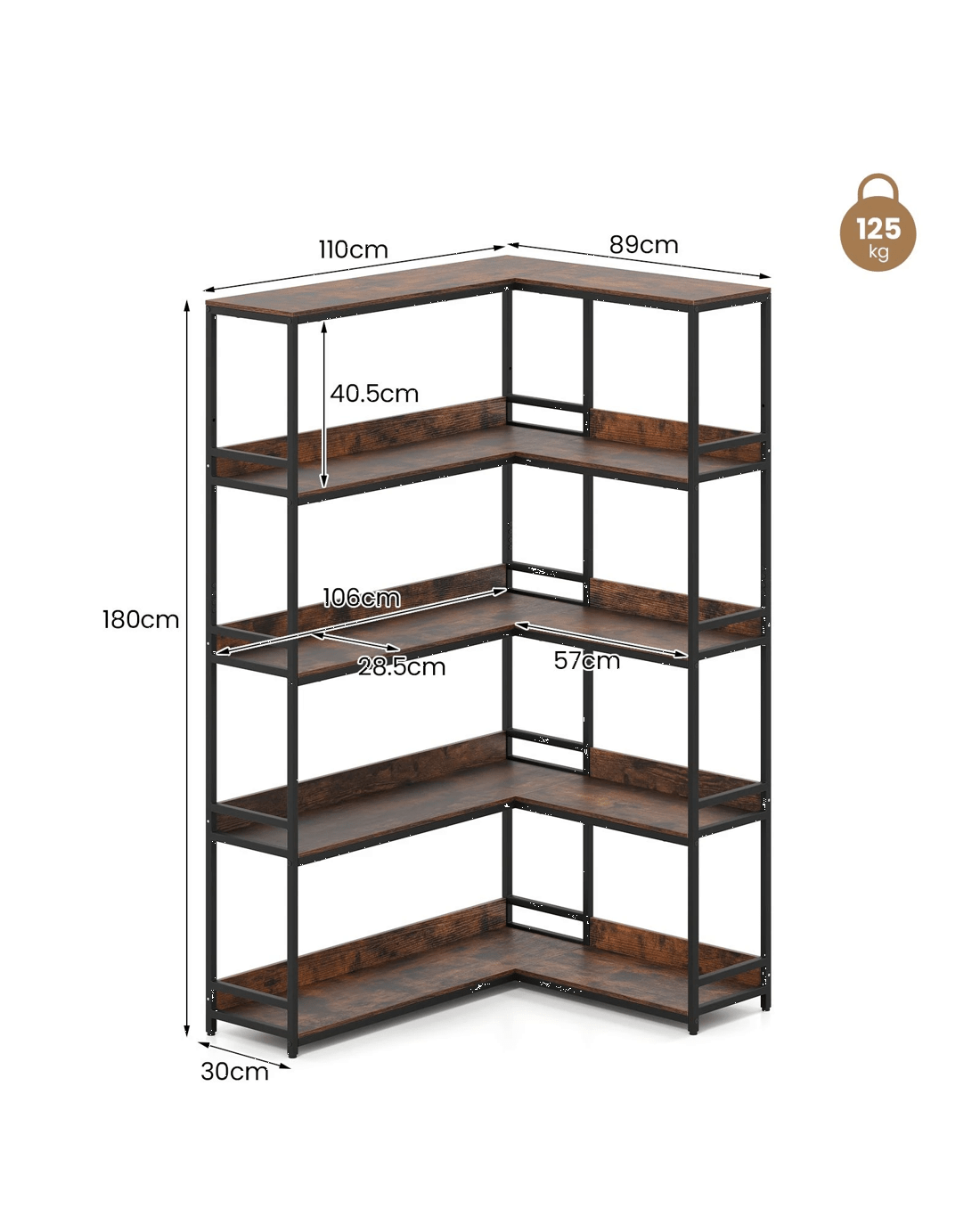 Costway 180CM Corner Bookshelf 5-Tier L-Shaped Utility Shelves Metal Frame Bookcase - Brown