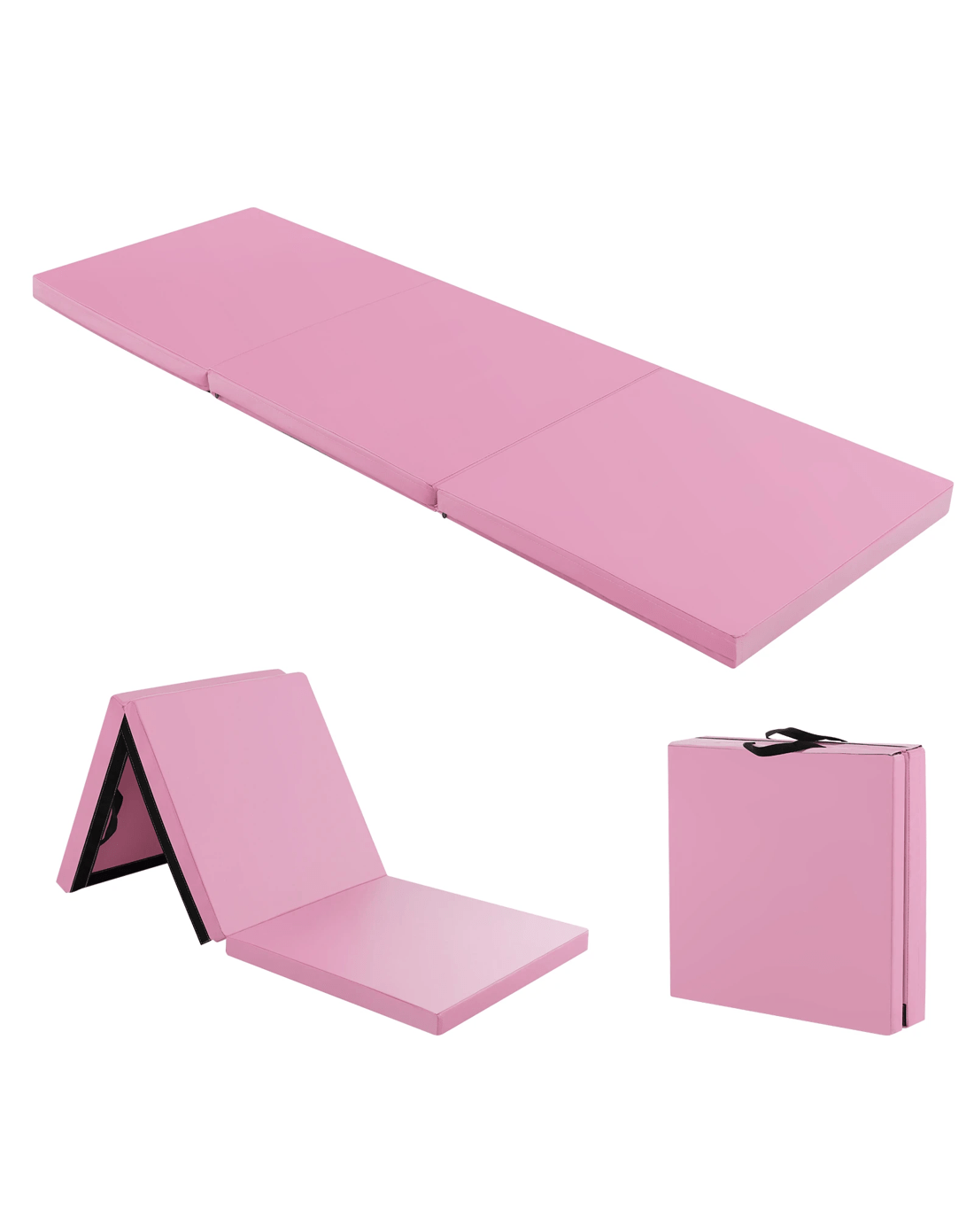 Costway 180x60cm Tri-Fold Gymnastics Mat PU Leather Floor Exercise Yoga Tumbling Mat w/Carry Strap - Pink
