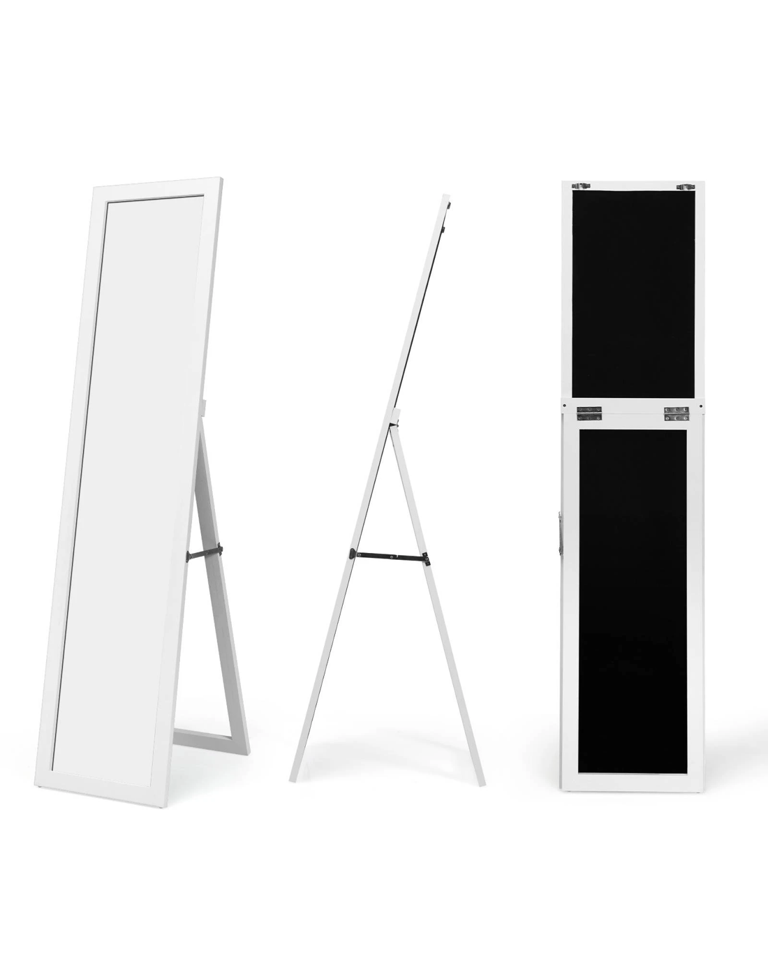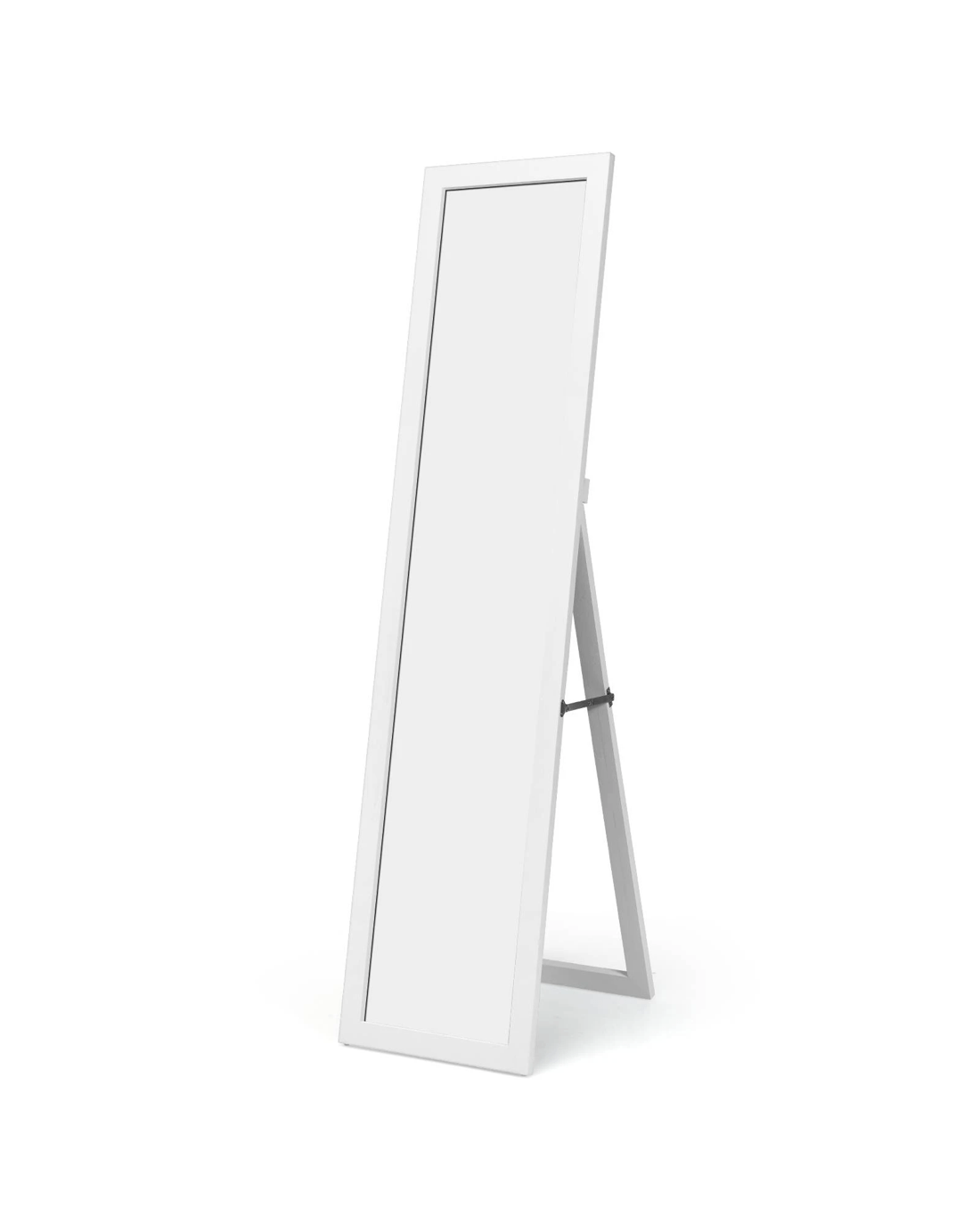 This is our standing / wall mirror. This full-length mirror is made of high-quality MDF panels, and it is therefore very wear-resistant. Thanks to the protective film, its glass is not fragile, which makes the mirror very safe. Due to the triangular structure, this cloakroom mirror is very stable. The surface of this mirror is also large so that it can reflect your outfits from head to toe. In addition, the placement angle of the cloakroom mirror can be adjusted. Due to the simple design, this dressing mirror is suitable for many areas of application, such as in the bedroom, in cloakrooms, clothing stores, etc.
