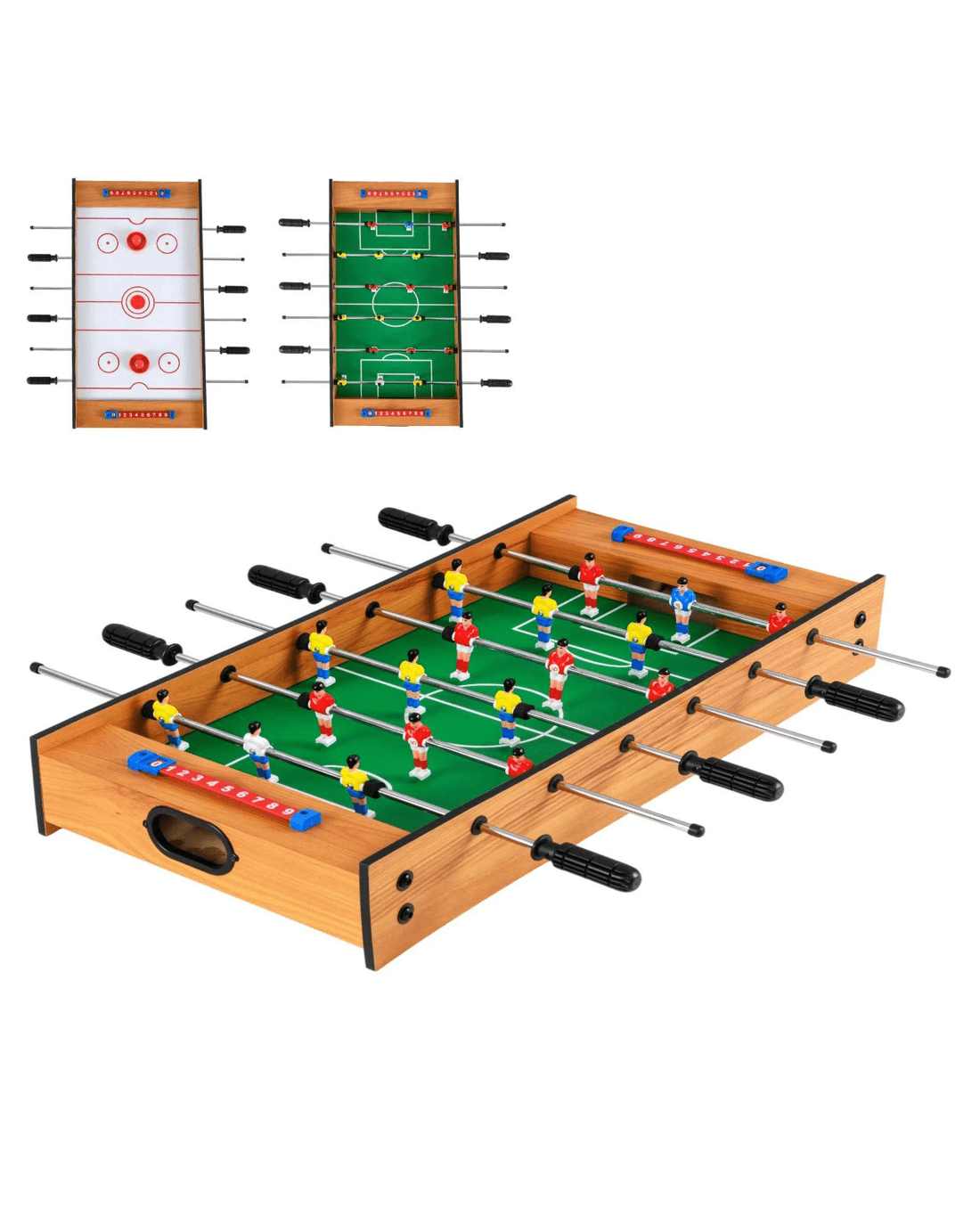 This 2 in 1 tabletop game table allows you to quickly switch between foosball and hockey, making it an excellent choice for versatile gaming action. Measuring 69 cm, it is compact enough to fit into any space while being light enough to move easily. This complete combo game set including 2 soccer balls, 2 pushers and 2 pucks is crafted to engage players of all ages. Whether you're hosting a party, spending a family night at home or having a break at the office, this combo game table is a fabulous addition.