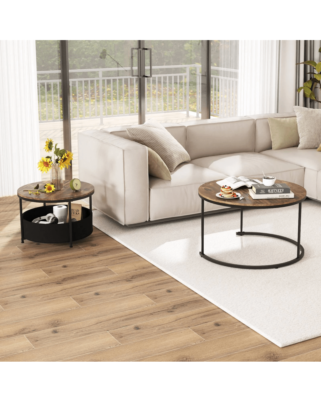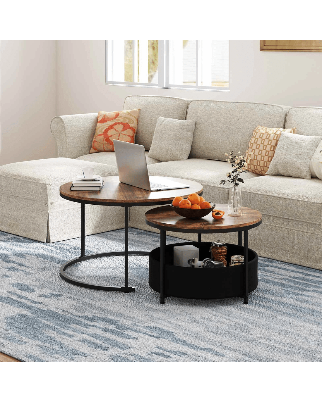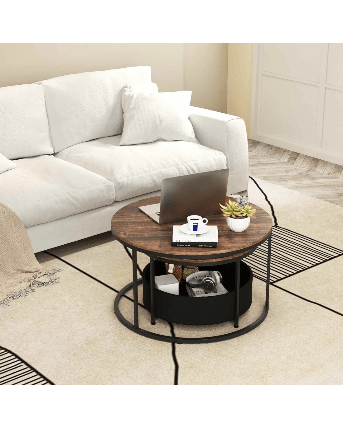 This versatile coffee table set of 2 features a 80cm and a 60cm table, both supported by robust metal tubes. The smaller side table’s X-shaped base further reinforces the frame. Premium details for stability, both end tables come with adjustable foot pads. With dual tabletops and a removable storage basket, these cocktail tables provide ample storage for items like magazines and blankets. The nesting design allows for space-saving options, making them ideal for different living spaces. Easy maintenance is ensured with the open base and smooth surfaces, allowing for convenient cleaning.