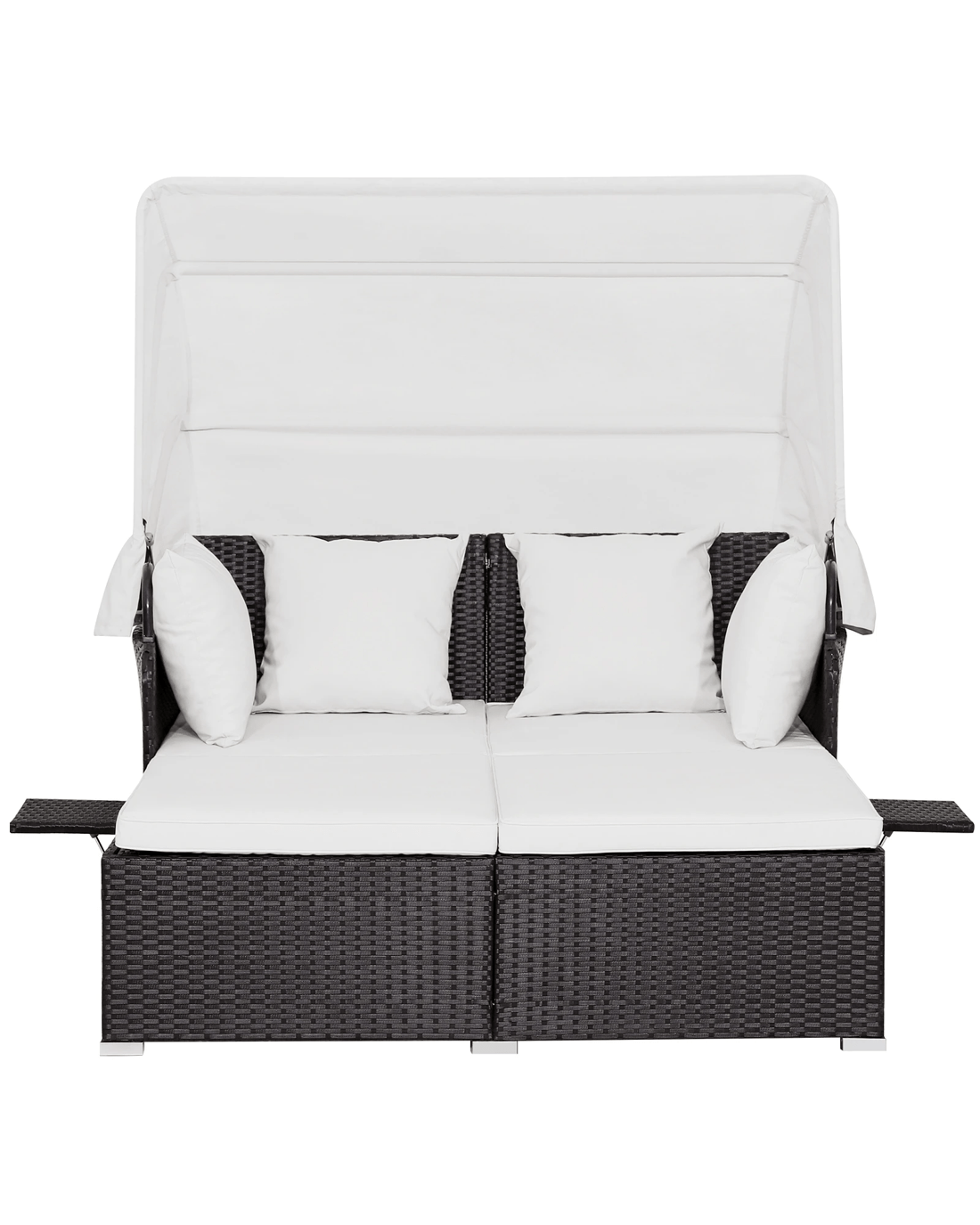 Our outdoor rattan daybed measures 153 x 123 x 70 cm (L x W x H) (the height does not include the canopy's height) and loads up to 360 kg, which is roomy enough for 2 persons, allowing you to chat and enjoy beautiful outdoor scenery with your friend or family when lying down. It also features a retractable canopy that can be easily opened to hide from the burning sun or closed to enjoy the warm sunshine and feel the cool breeze. More than that, our patio wicker furniture is composed of a solid steel frame and all-weather rattan, which can resist fading, wear, or tear in any season while providing enough support and ensuring long-lasting durability. Besides, there exist 2 thick cushions and 4 soft pillows with ultra-soft sponge filling, allowing you to fully relax your body for ultimate comfort. And it has 2 foldable side trays for placing drinks and food within reach. Our versatile outdoor daybed would make every moment of your leisure time spent outdoors memorable.
