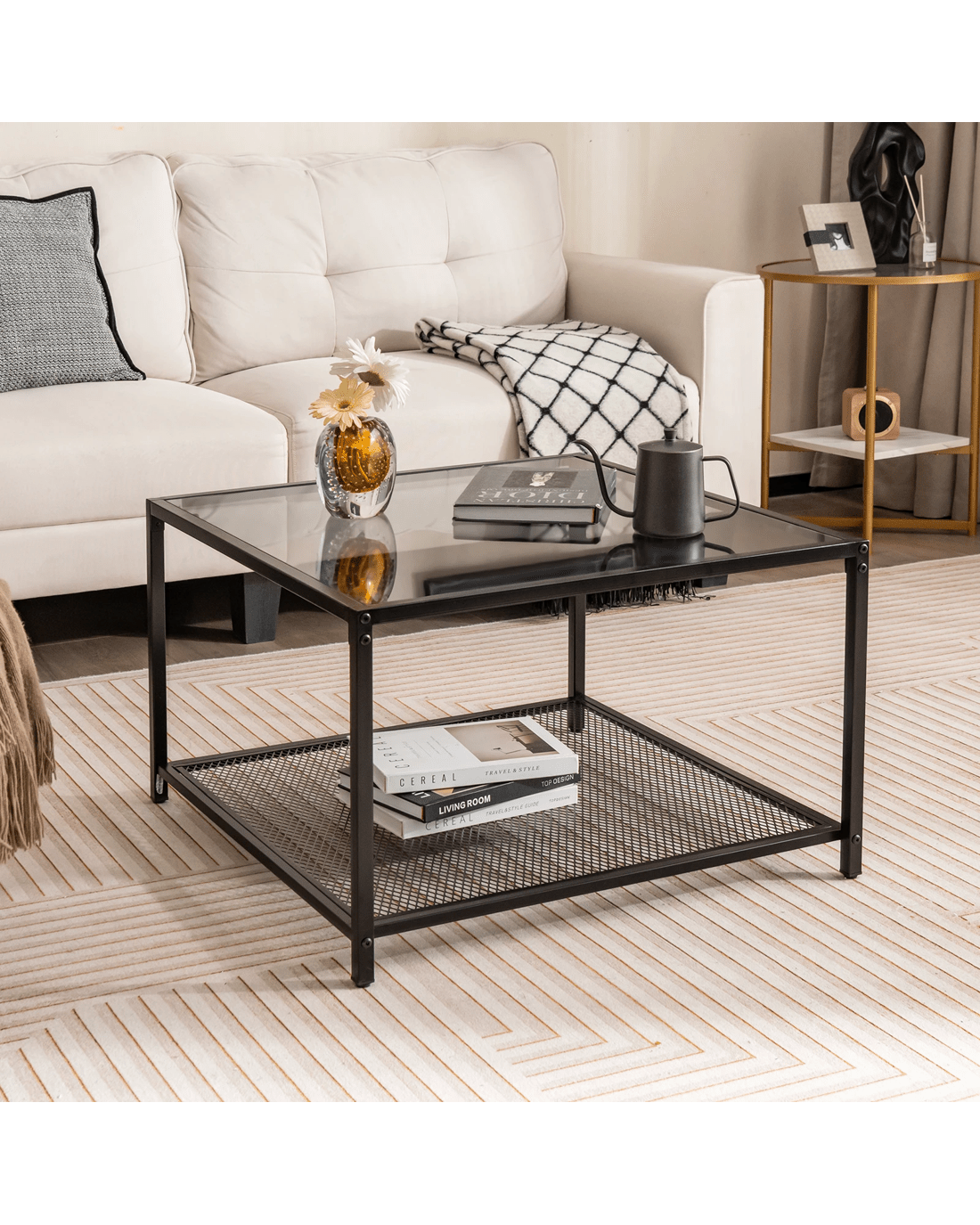 Costway 2-Tier Coffee Table Square Side Table Glass Tabletop w/Mesh Shelf