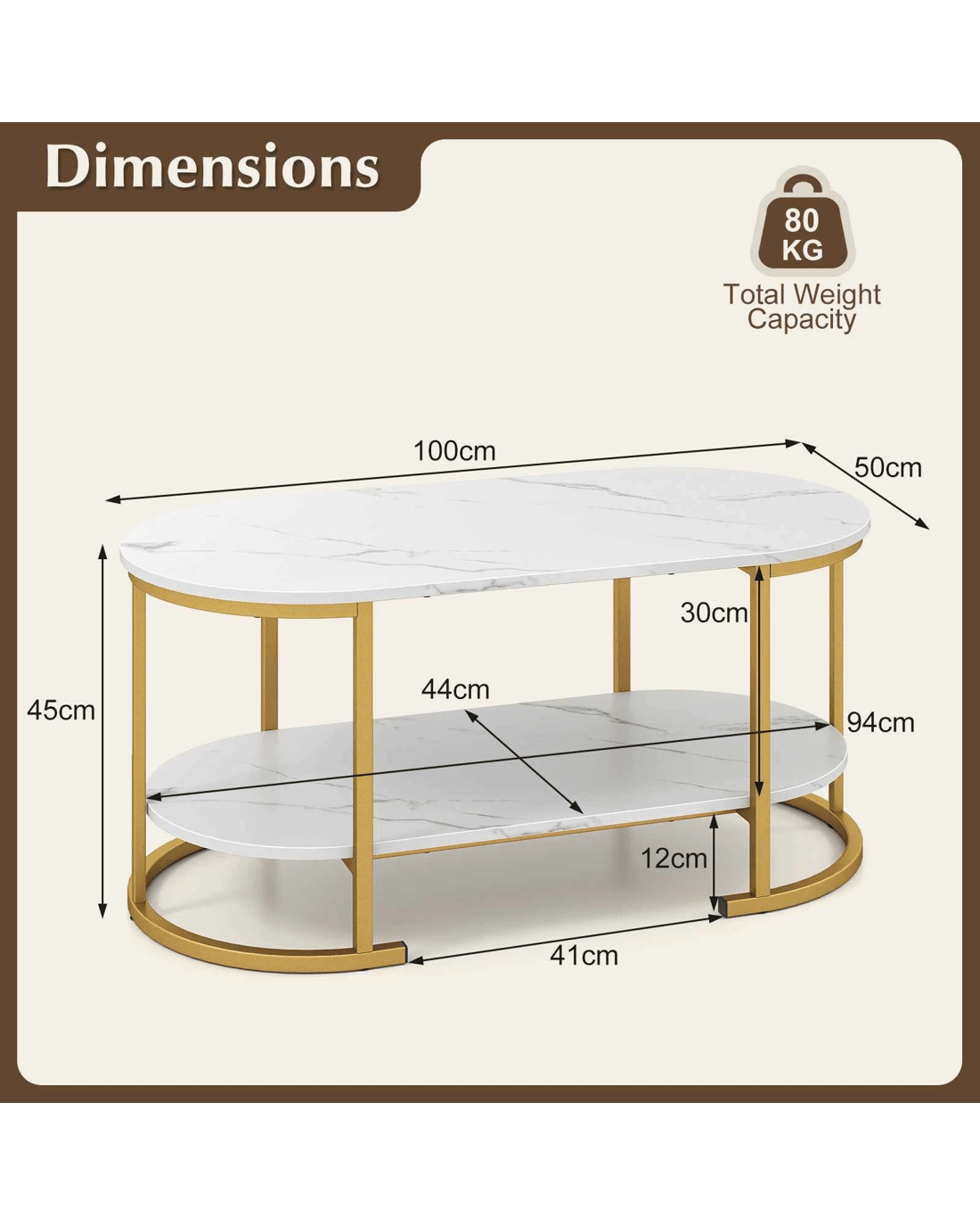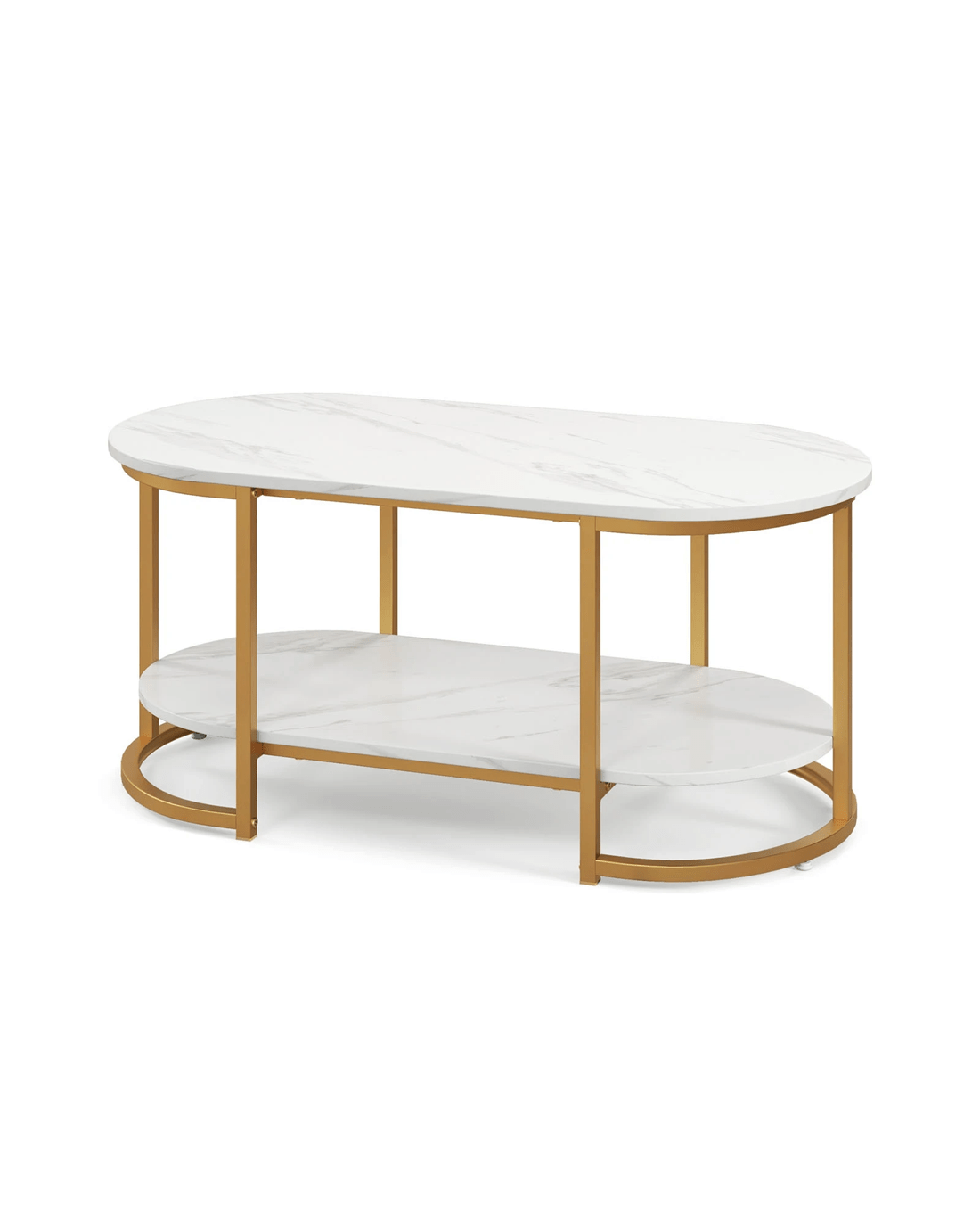 Not only does this coffee table offers display storage on its tabletop, but it also provides bottom shelf for storing daily items. In addition to golden metal frame, this faux marble coffee table adds a stylish element to your home. Crafted with sturdy metal frame, the center table offers exceptional durability and stability. Whether used for home or office, the cocktail table will be an eye-catching piece that can fit into both modern and contemporary homes alike.