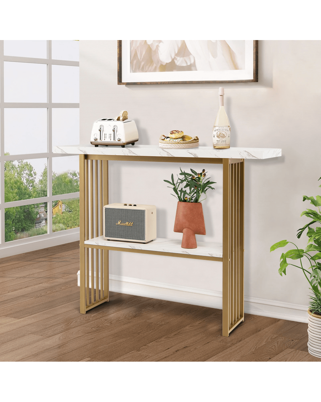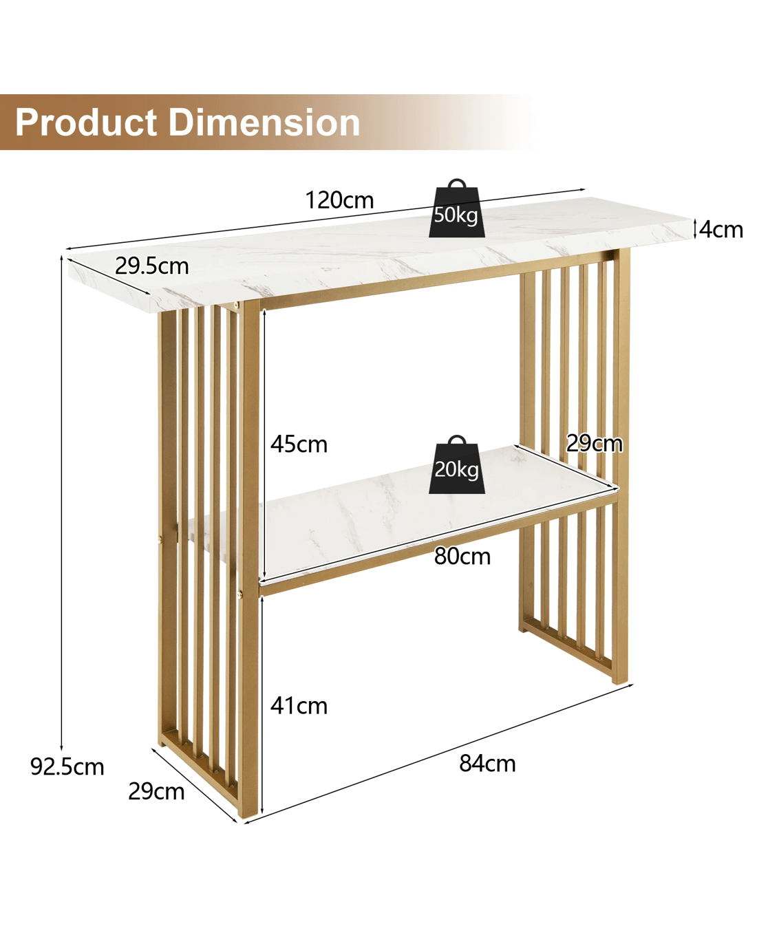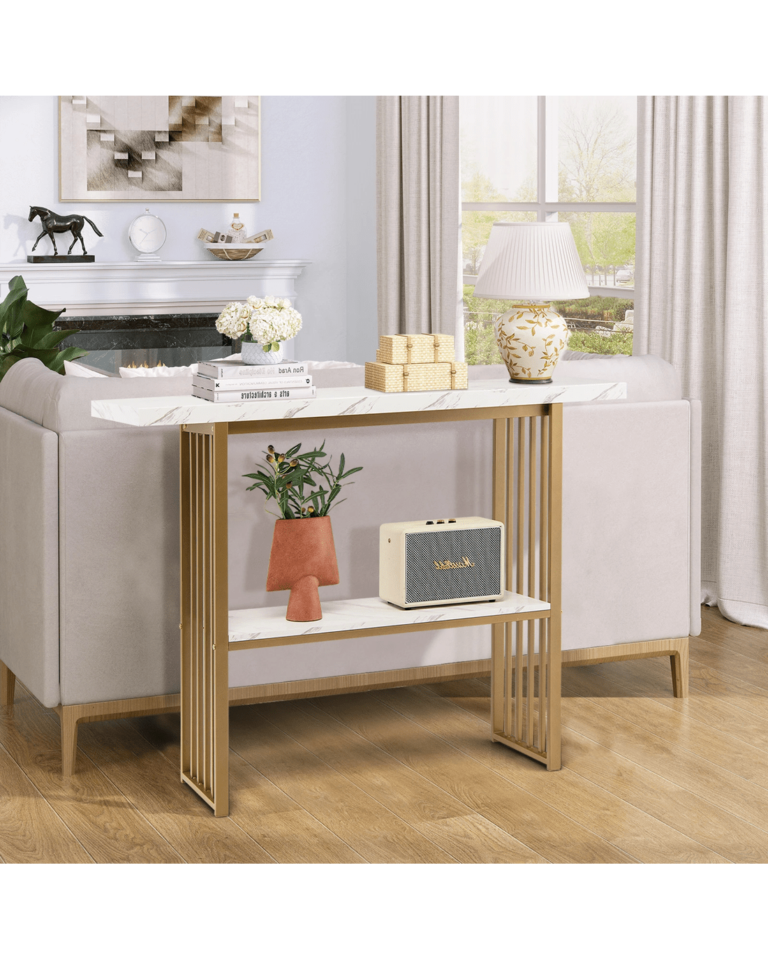 Its gold frame is composed of thicken steel tubes which is not only rustproof for durability but also sturdy for a strong load capacity. More, two faux marble shelves are made of P2 MDF presenting an extended service life. What’s more, the console table is fitted with an anti-toppling device to avoid sudden tipping, which is very suitable for family with little ones. The anti-slip pads highly avoid scratches on the floor. Depending on your needs, the 120 x 29.5 x 92.5cm console table can work well as a sofa side table, an entryway table, a dining room shelf or a kitchen shelf.