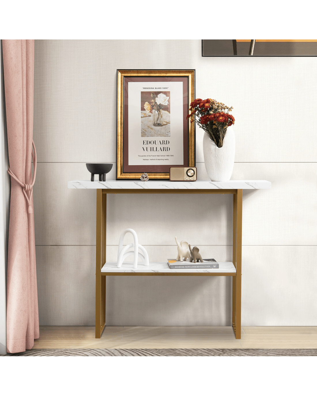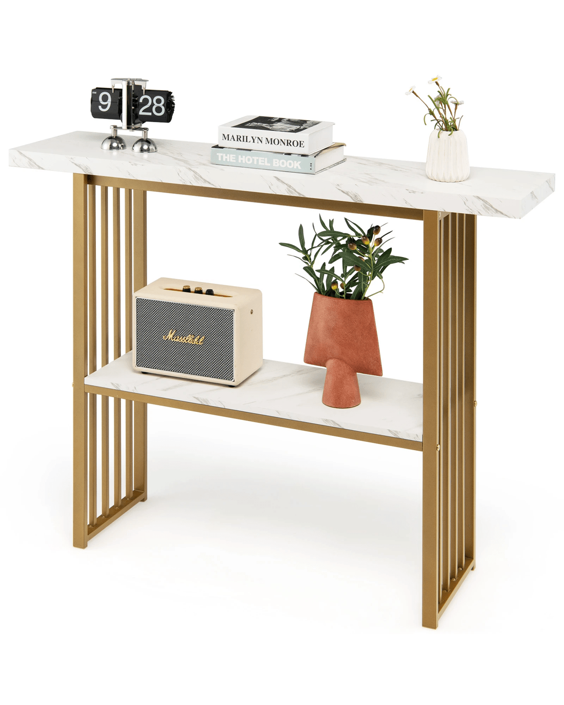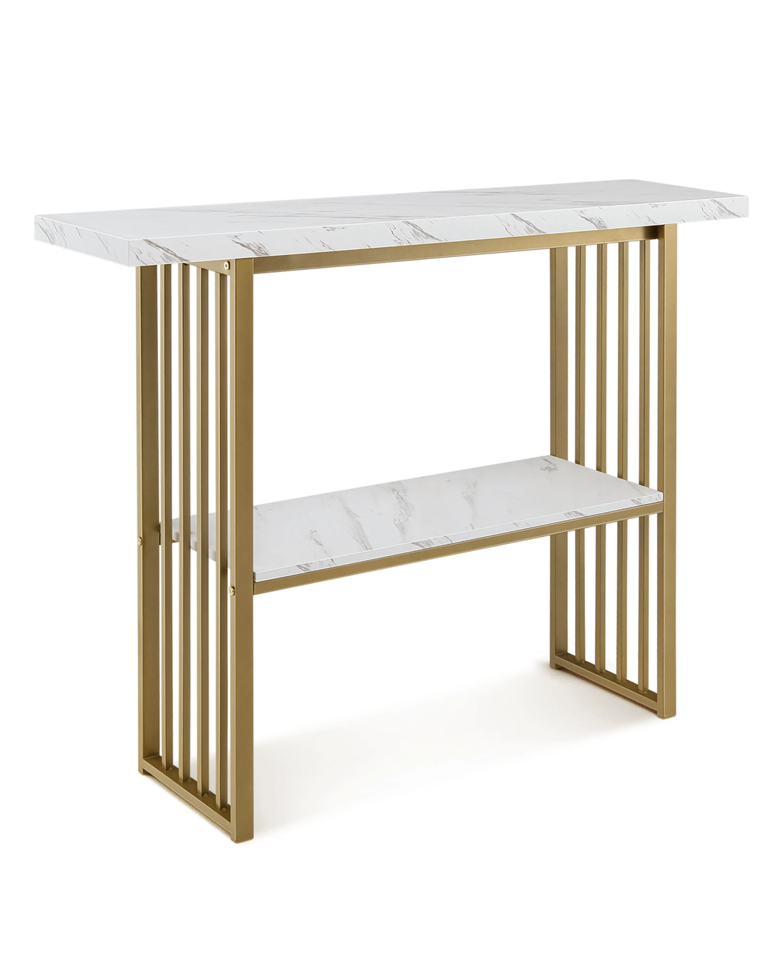 Its gold frame is composed of thicken steel tubes which is not only rustproof for durability but also sturdy for a strong load capacity. More, two faux marble shelves are made of P2 MDF presenting an extended service life. What’s more, the console table is fitted with an anti-toppling device to avoid sudden tipping, which is very suitable for family with little ones. The anti-slip pads highly avoid scratches on the floor. Depending on your needs, the 120 x 29.5 x 92.5cm console table can work well as a sofa side table, an entryway table, a dining room shelf or a kitchen shelf.