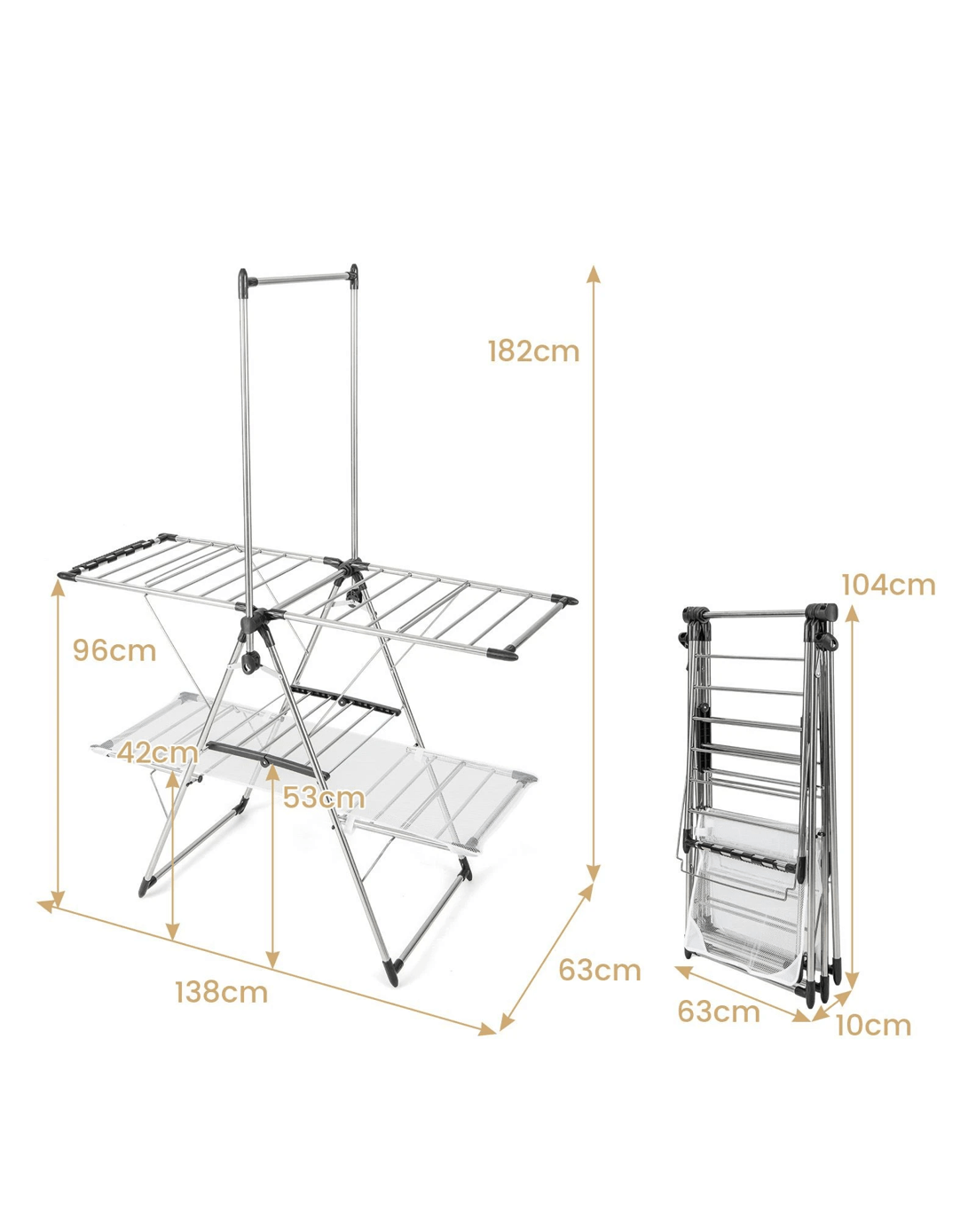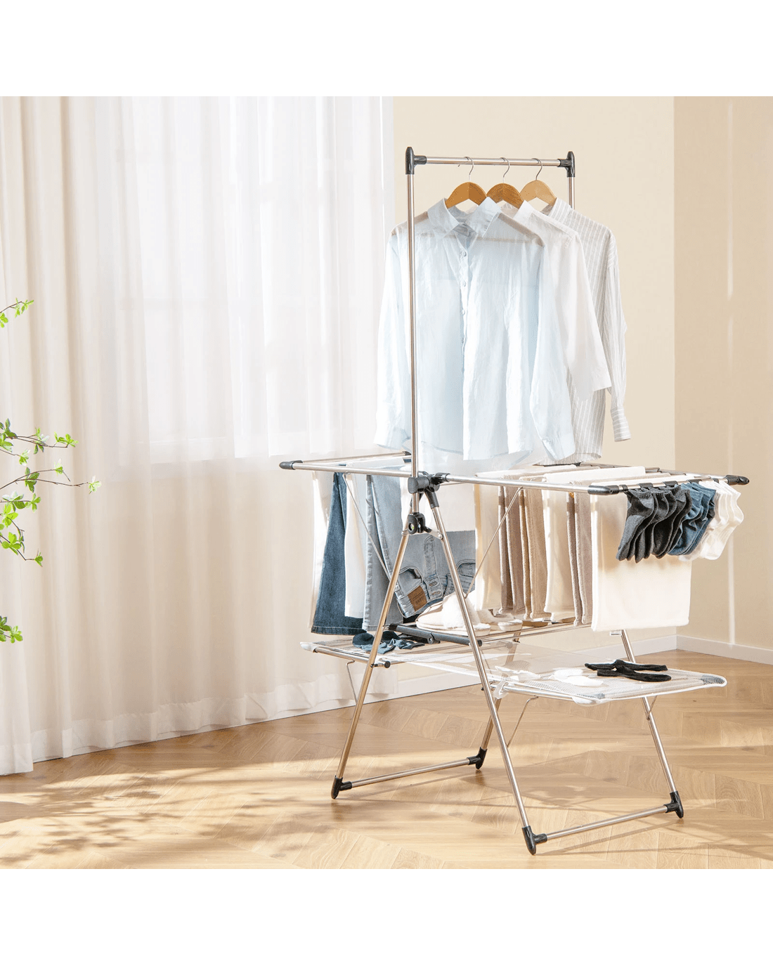 This folding laundry drying rack consists of a detachable top hanging bar and multiple drying shelves, offering large space for drying various clothing. There are also sock clips and a shoe hook for more storage. Moreover, both the upper and lower wings can be adjusted to adapt to clothes of different lengths. Made of superior stainless steel, this folding laundry drying rack features great durability. The golden triangular structures and strong connections provide steadiness, while the anti-slip foot pads enhance stability. Additionally, the lightweight and foldable design allows for easy storage and transportation, giving you the flexibility to use this laundry drying rack indoors or outdoors. Best of all, no assembly is needed for convenient use.