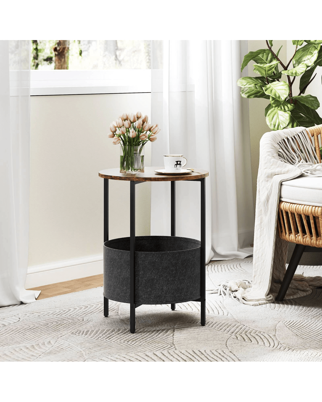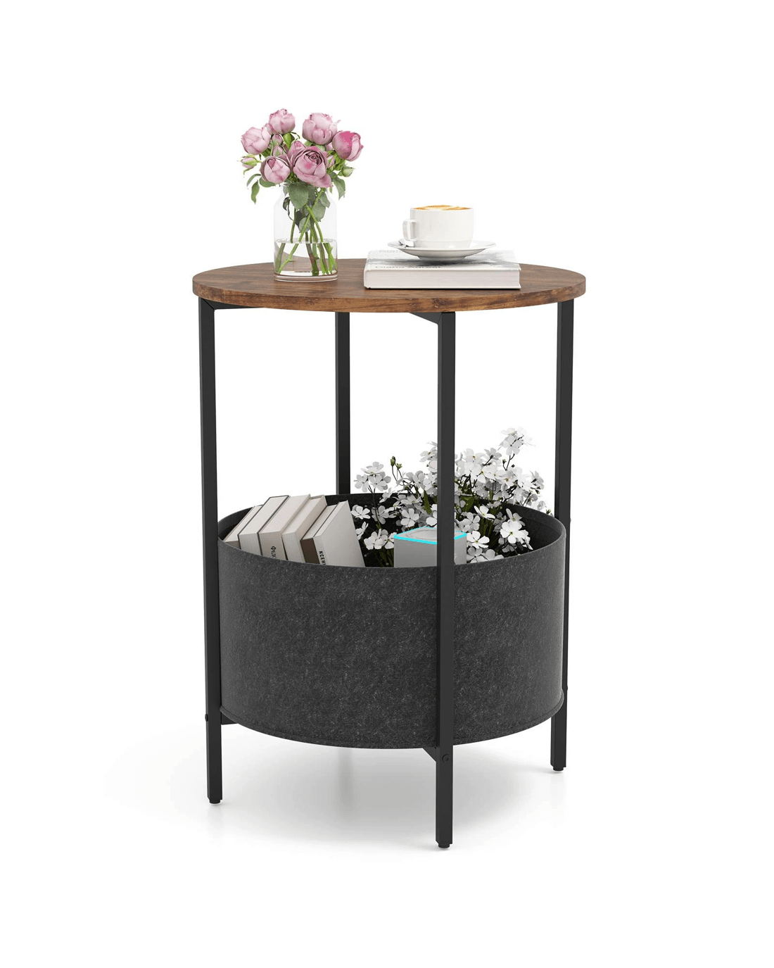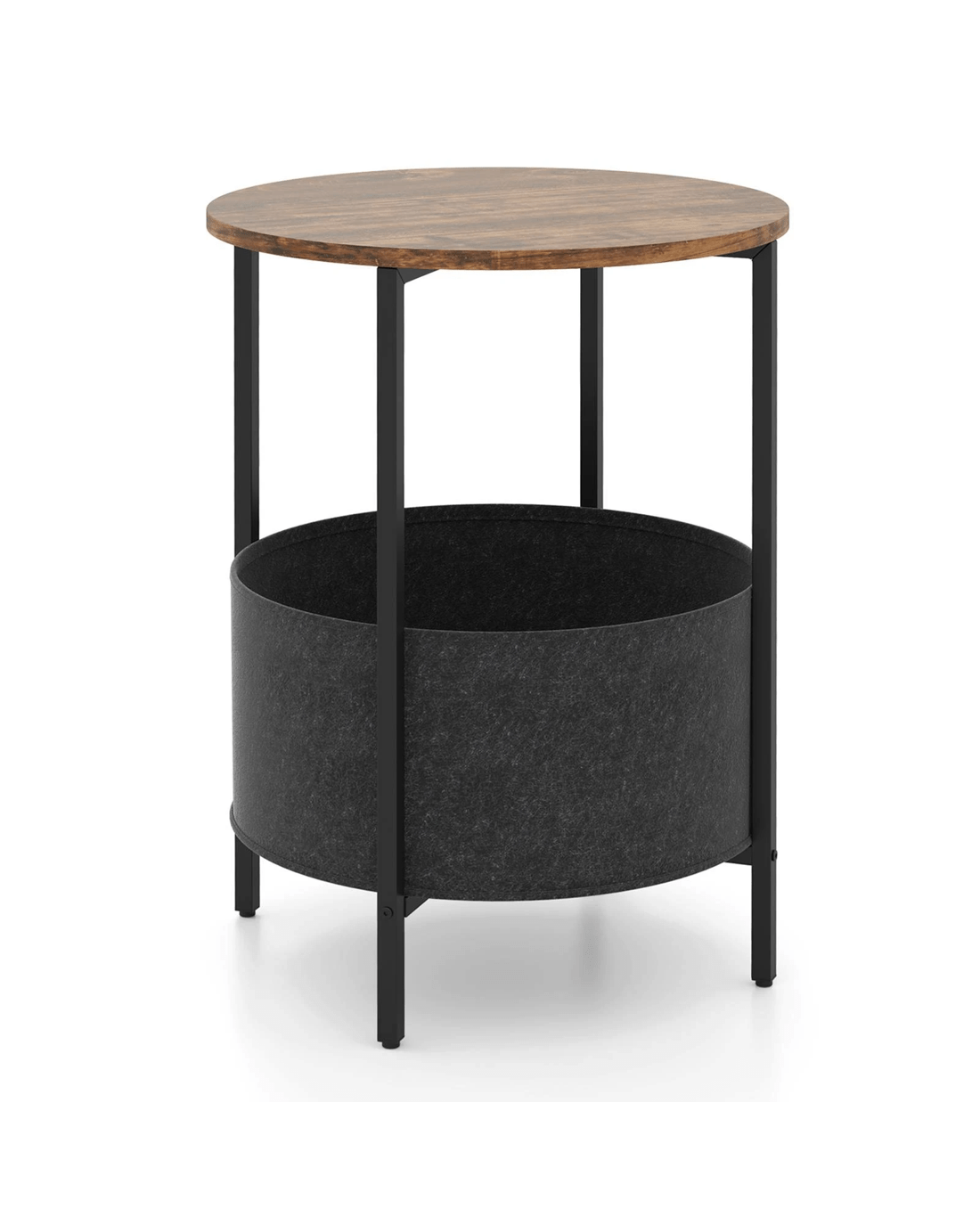 This side table features a spacious round tabletop, providing ample space for placing beverages or books. The detachable felt basket underneath will further keep your space organized and clutter-free. Supported by a sturdy metal structure, the end table is built to last. The X-shaped base not only adds to its modern appeal but also provides excellent stability. With adjustable foot pads, the bedside table ensures reliable support for your items. With its multifunctional design, the side table can serve various purposes in your home. Whether you need an end table, nightstand, or decorative piece, this versatile furniture piece has you covered. Furthermore, the sleek and space-saving build of this table allows it to seamlessly blend into any room setting, making it ideal for small spaces such as living rooms, bedrooms, or studies.