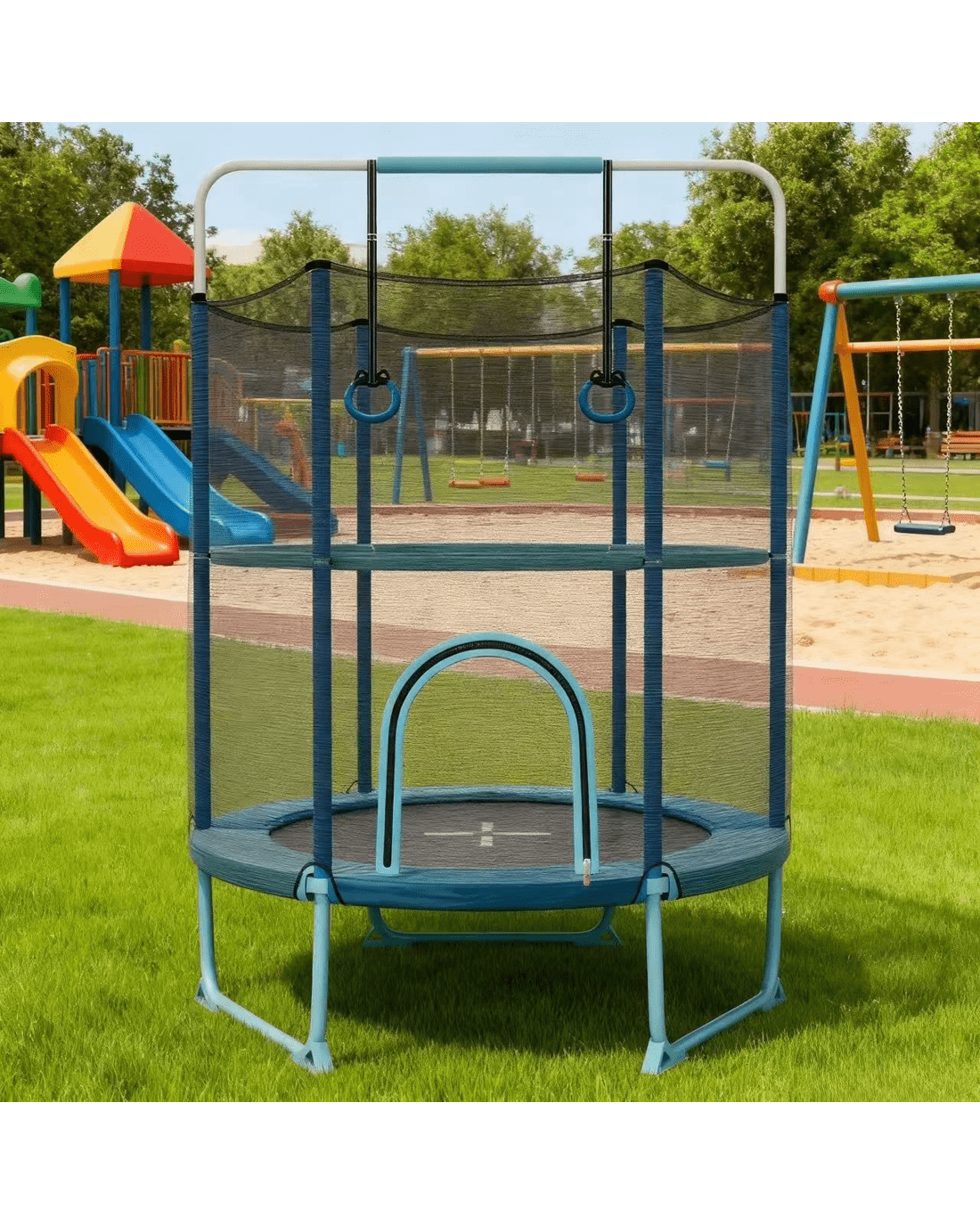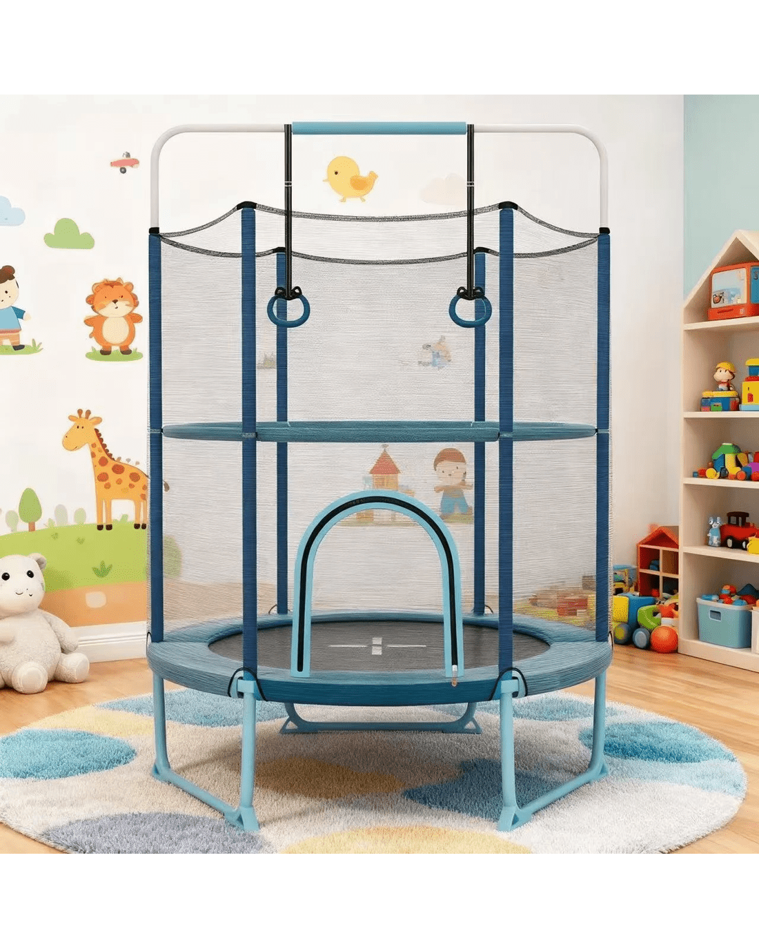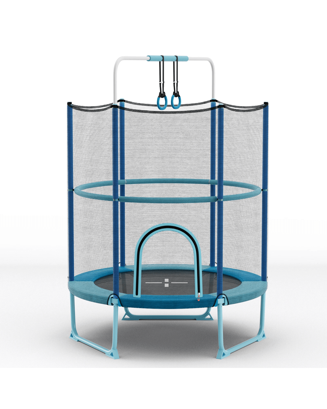 Allow your little ones to jump happily and safely with our 5 ft little ones trampoline!Compared with other trampolines with 115 cm security enclosure net, our 155 cm one is safer for little ones to play. Moreover, the trampoline comes with detachable gymnastic bar and rings, making it a 3-in-1 multipurpose design that offers little ones various options and fun. The large zipper door enables little ones to get in and out easily. And little ones are able to play safely with the soft and cozy handrail and rings. More importantly, the 3 U-shaped frames disperse pressure and enhance stability. Each leg is equipped with 2 widened non-slip foot pads for increased steadiness. Furthermore, the anti-rust galvanized springs are covered with 3-layer security pad, which is friendly to little ones. With the elastic jumping mat, little ones can have an unforgettable jumping experience to release their energy and improve their motor skills.