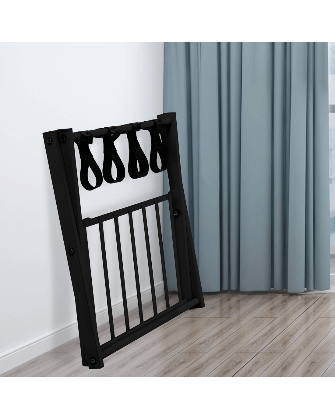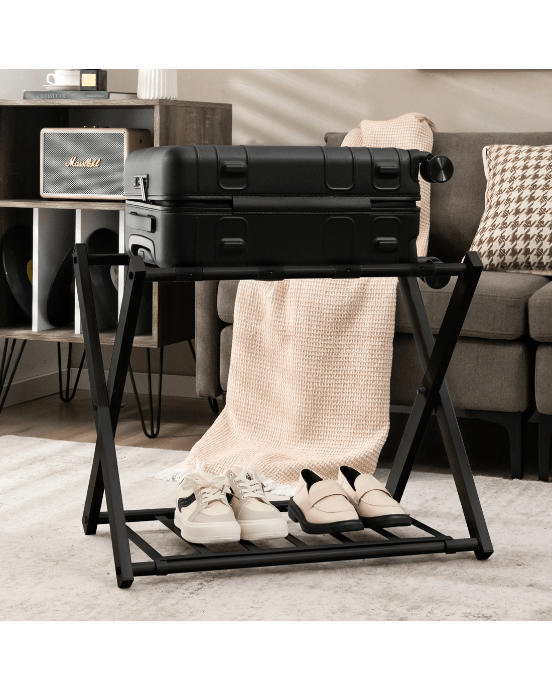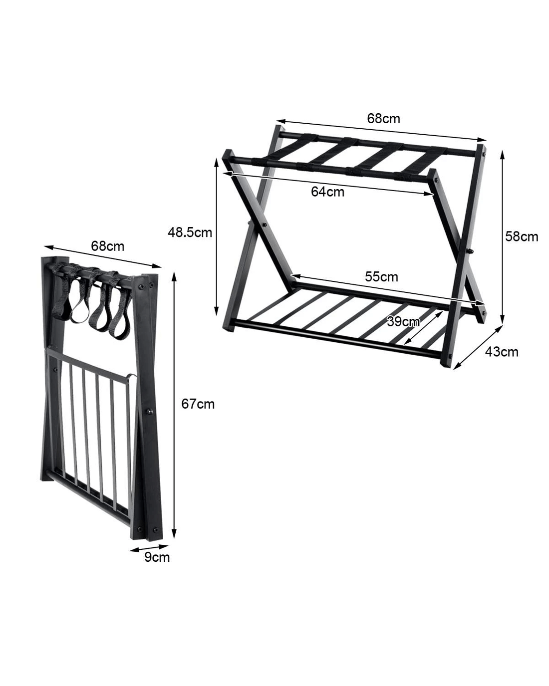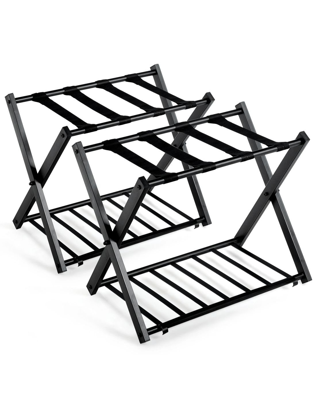 This two-layer luggage rack is perfect for your bedroom, hotel or guest room. Made of durable black iron tubing and sturdy black fabric strips for heavy luggage. In addition to the luggage rack, the luggage compartment can also be used to store shoes, bags and other items for multiple purposes. With a foldable structure, it can be stored in a corner or the garage when not in use, taking up little space and for portability wherever you need it. The Stylish design to functionally compliment any home décor, not only for home but also for business. Don't hesitate, come buy it!