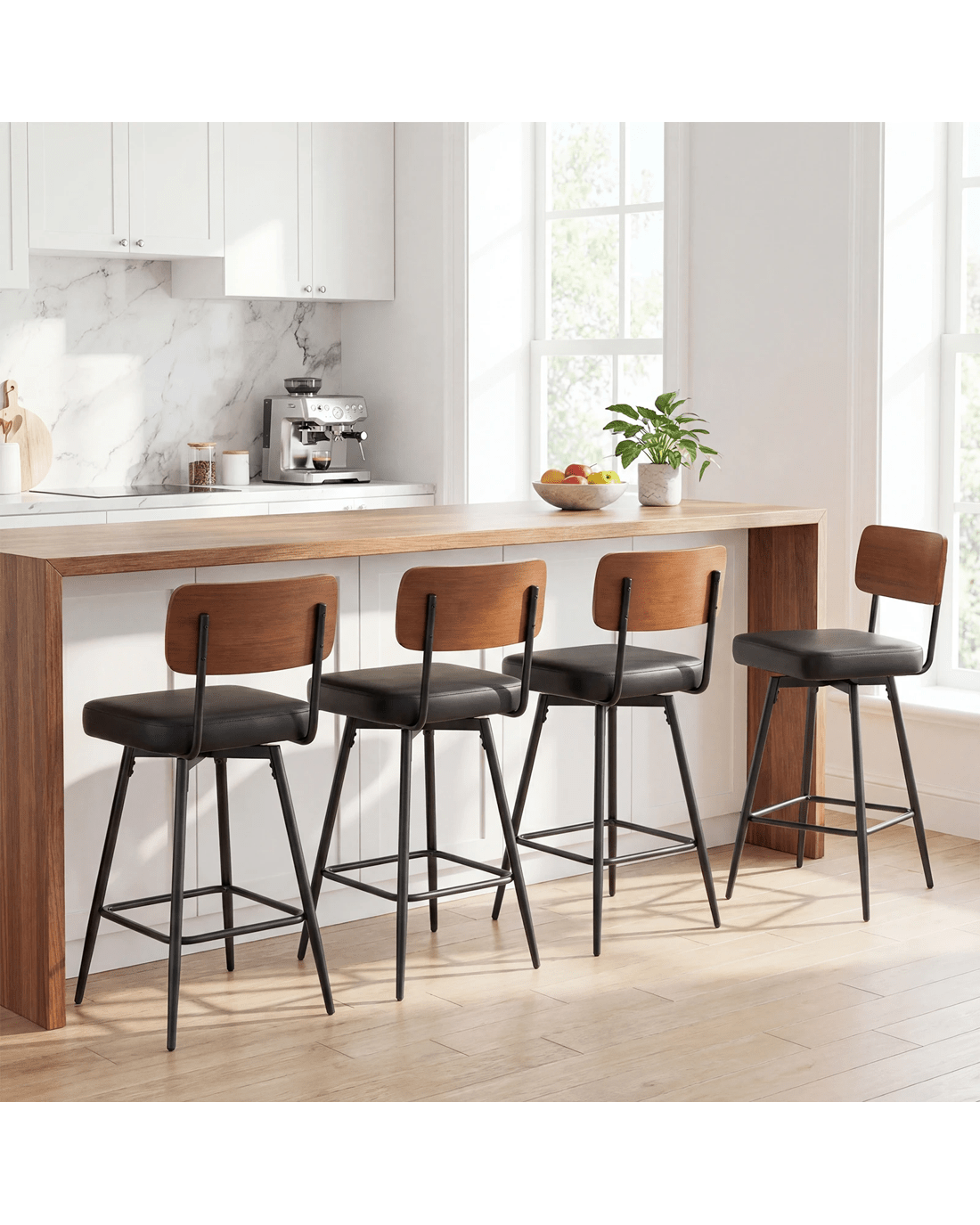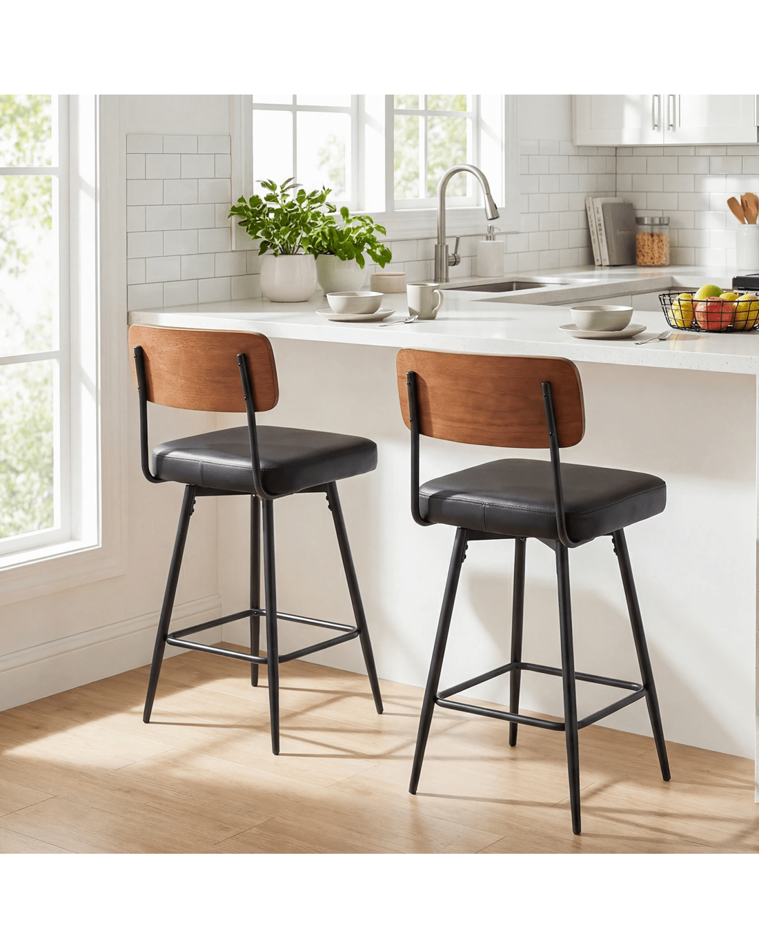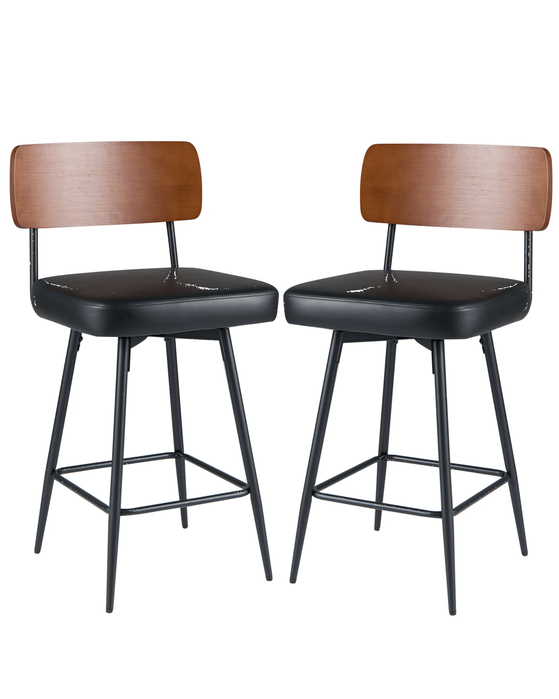 Featuring premium waterproof PU leather and thick sponge padding, the barstools provide lasting comfort and effortless maintenance. The sturdy metal frame with adjustable foot pads ensures stability and reliability, while the curved backrest and large seat offer comfy and sturdy support and relieve your fatigue. Moreover, the 360°swiveling design allows you to easily turn and engage with your surroundings without standing up. Perfectly sized for tables 89 to 99 cm high, this set of 2 stools, with its timeless style and reliable durability, suits dining rooms, kitchen islands, and home bars. Experience seating designed to keep up with your life.