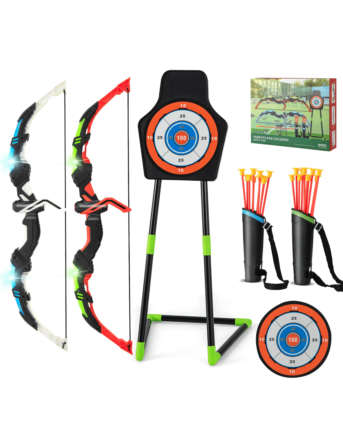 Enjoy fun activity time with our LED light archery toy set for little ones! Made from ABS material, this colorful set is perfect for stimulating unlimited potential and enhancing various skills such as balance, concentration, hand-eye coordination, and motor skills. Not only is this set fun, but it is also convenient to carry. The bows can be easily assembled and disassembled, making it portable for outdoor adventures. Moreover, includes two bows, 20 premium arrows, two arrow bags, and one target, this bow set can meet your little ones' indoor or outdoor play need. Additionally, feature two light parts on each side, the bow can enhance the overall playing experience. Don't miss out on this exciting opportunity to ignite your little one's imagination and encourage outdoor play!