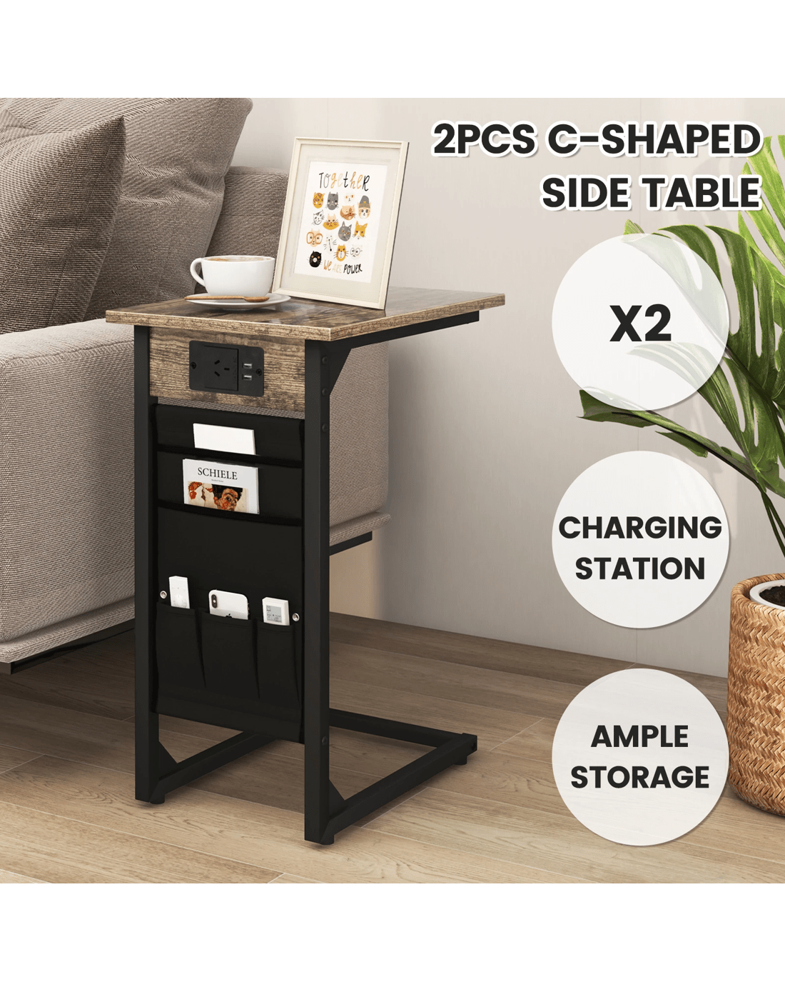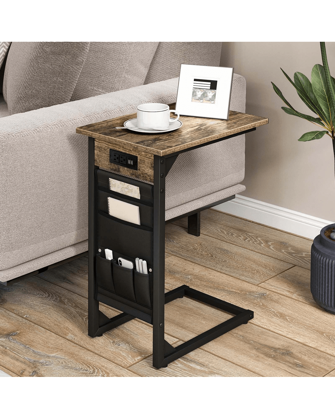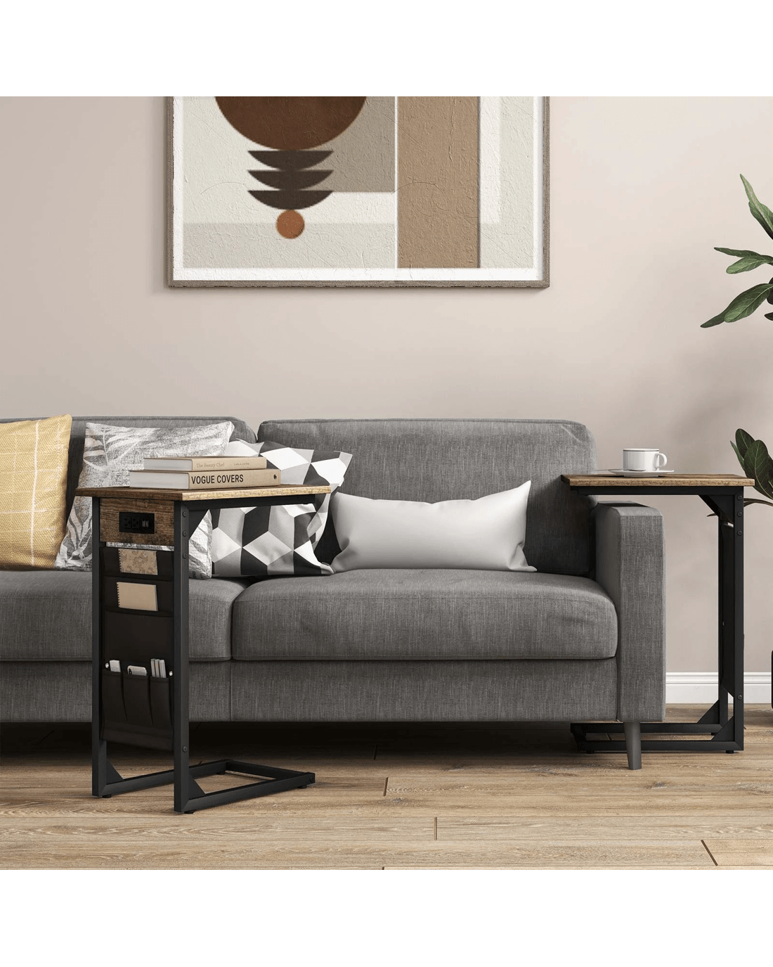 The side table with a 200cm power cord comes with a convenient charging station that can charge all your electronic devices, including 240V 10A outlet x 1 & 5V 2.1A USB port x 2. But that's not all - it also has a large side storage bag. You can put your phone, charger, or remote control in one long bag or three small bags. The C-shaped design facilitates sliding on the sofa or under the bed, allowing you to quickly access commonly used items while saving more space. According to your preferences, it can be used as a TV tray, snack table, or bedside table to increase convenience. In addition, with a metal frame and adjustable foot pads, you can ensure that the end table remains stable at all times. Finally, installation is an easy and detailed manual.