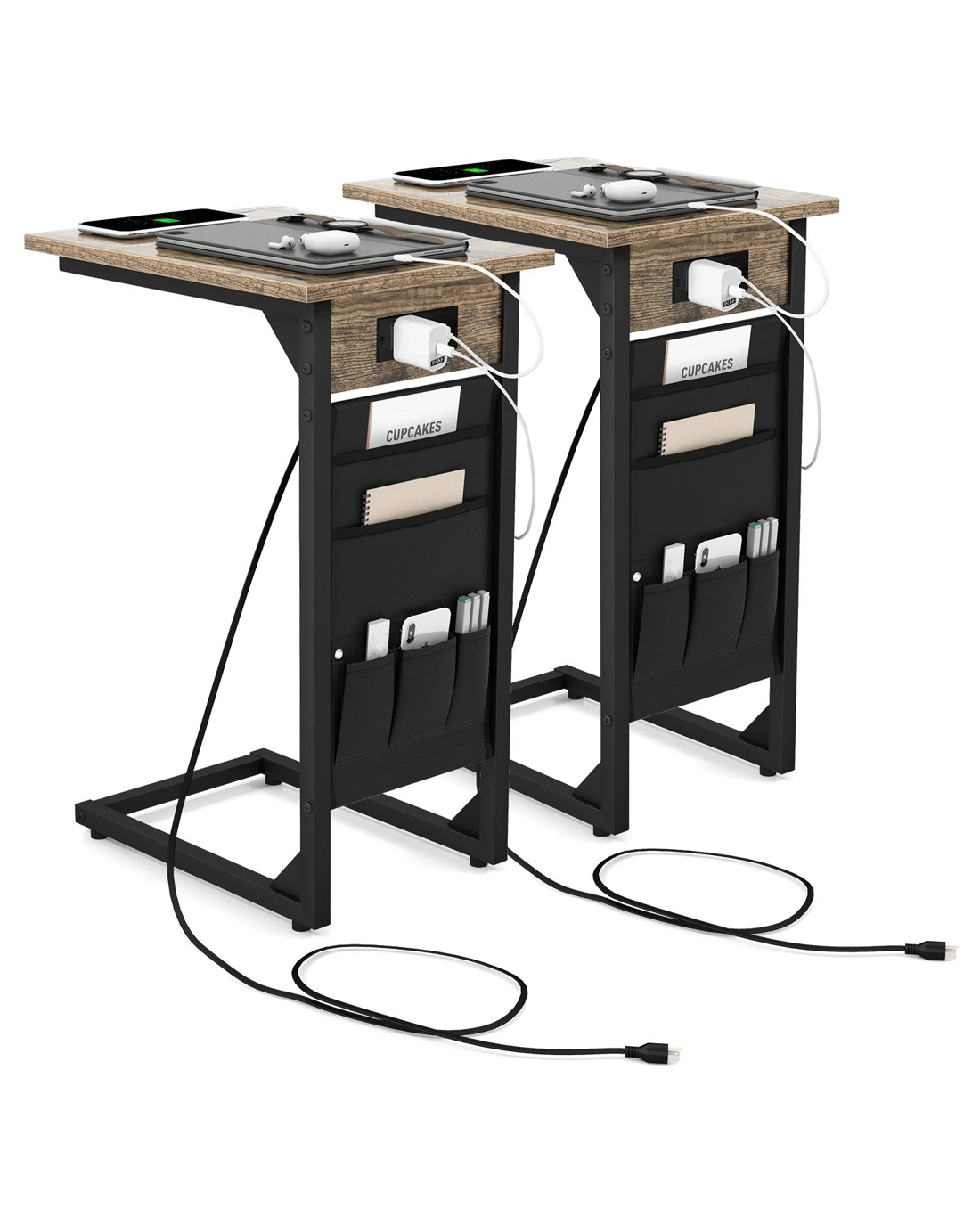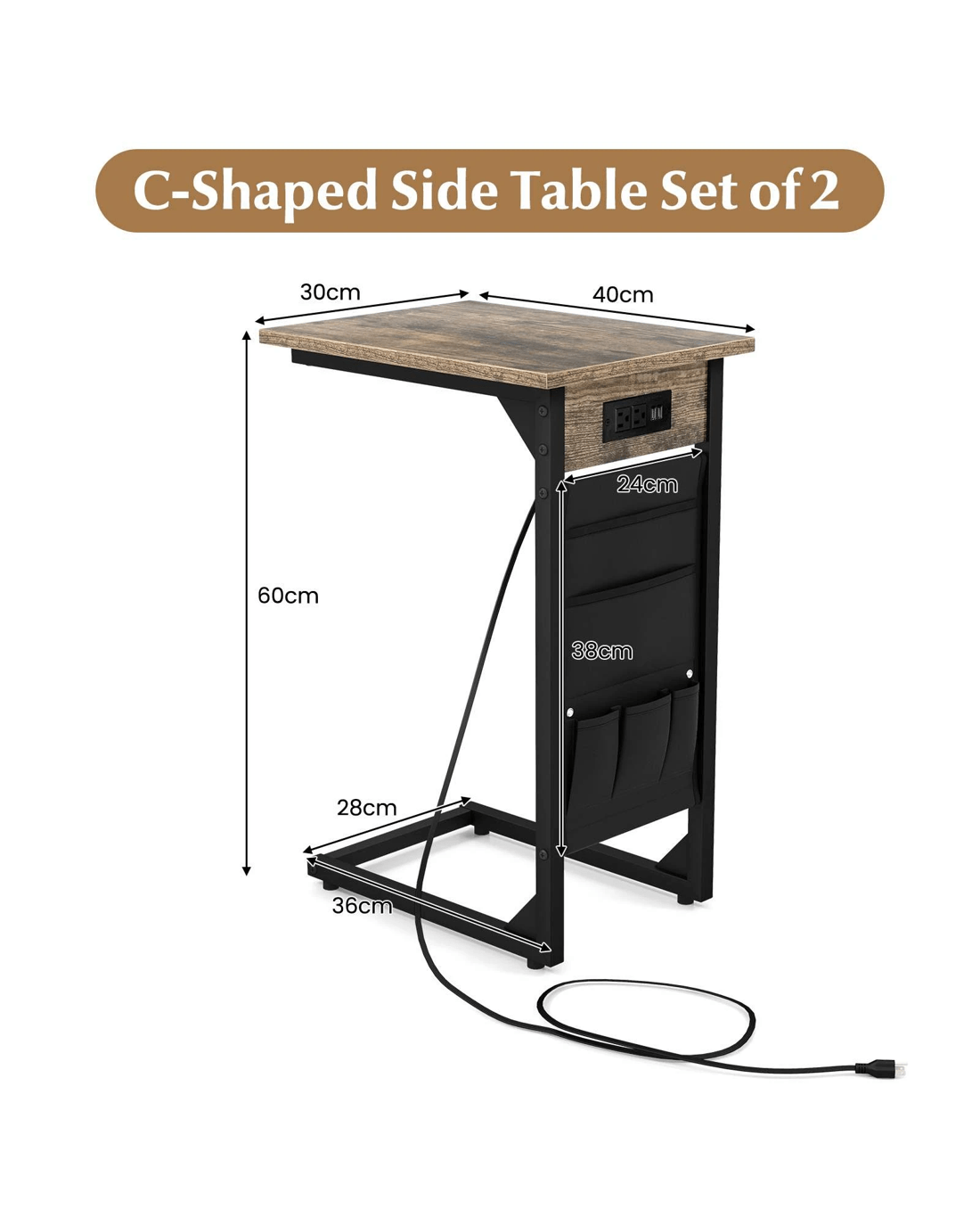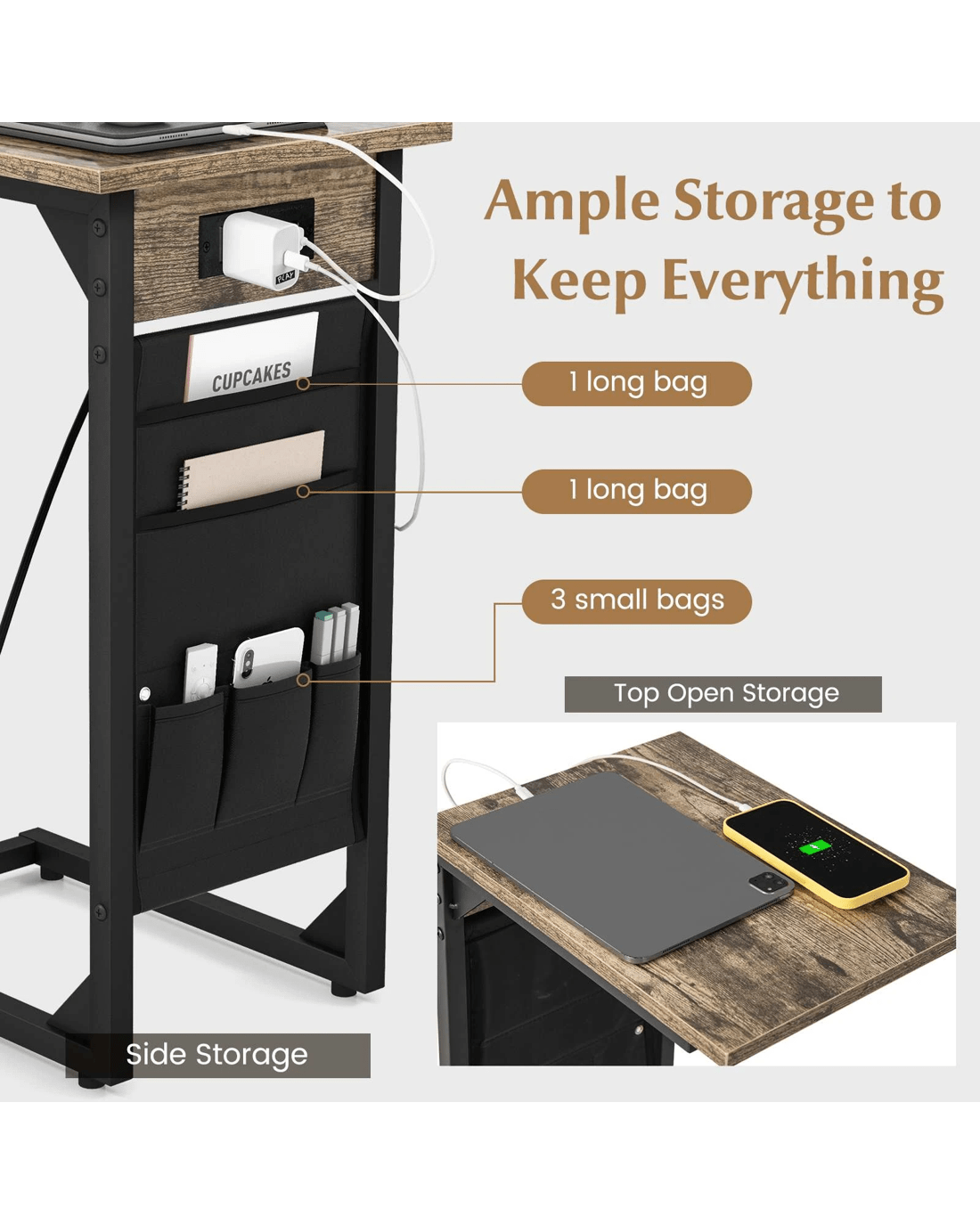 The side table with a 200cm power cord comes with a convenient charging station that can charge all your electronic devices, including 240V 10A outlet x 1 & 5V 2.1A USB port x 2. But that's not all - it also has a large side storage bag. You can put your phone, charger, or remote control in one long bag or three small bags. The C-shaped design facilitates sliding on the sofa or under the bed, allowing you to quickly access commonly used items while saving more space. According to your preferences, it can be used as a TV tray, snack table, or bedside table to increase convenience. In addition, with a metal frame and adjustable foot pads, you can ensure that the end table remains stable at all times. Finally, installation is an easy and detailed manual.