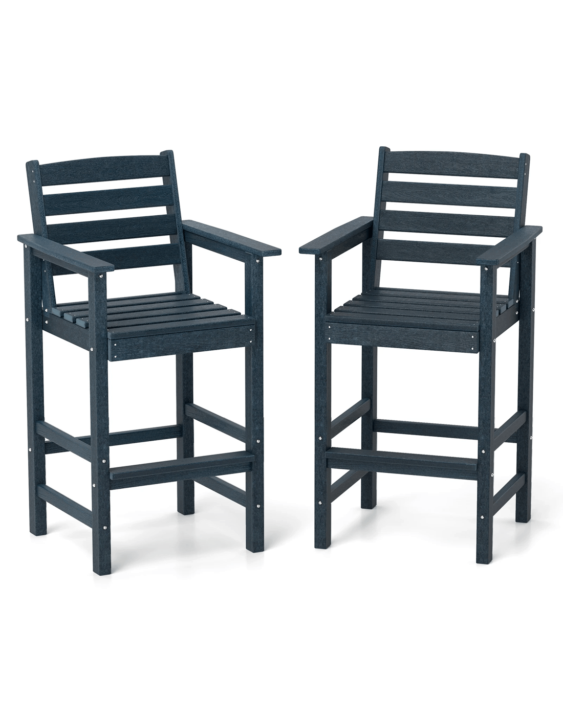 Discover ultimate outdoor comfort and timeless style with the Adirondack bar chairs.The 2 bar chairs are meticulously crafted from all-weather HDPE material and equipped with robust stainless steel screws, ensuring high stability and extended outdoor use. The faux wood texture and classic Adirondack design add an element of sophistication to any outdoor setting, making these high-top chairs perfect for use high bar tables. These 2 bar chairs with well-crafted details will elevate your outdoor spaces with both style and ease.
