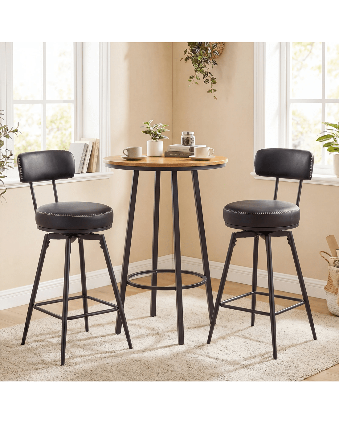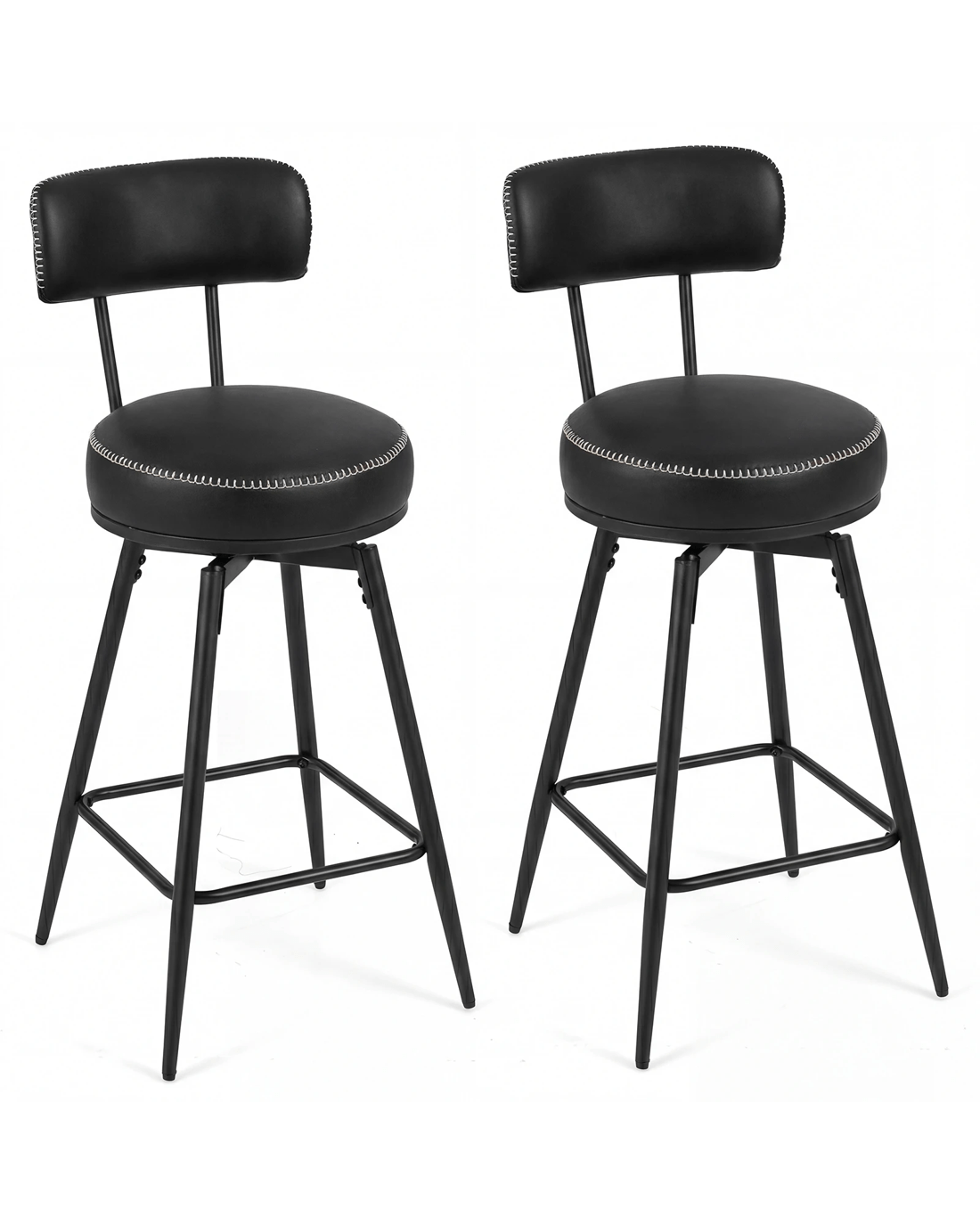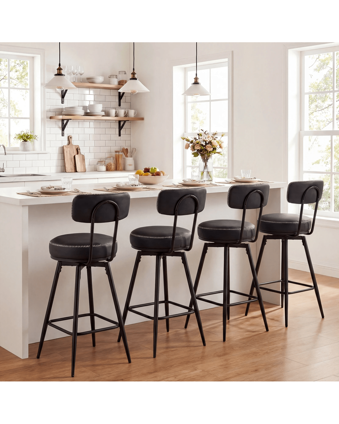 The kitchen island stools feature curved backrests and wide seats for natural ergonomic support. Built-in footrests reduce leg strain, allowing for relaxed sitting over long periods. In addition, the faux leather upholstery offers a soft, skin-friendly touch while also being long-lasting and easy to clean. These breakfast stools use 10 cm thick padded sponges to provide optimal comfort. Users benefit from smooth 360°swivel seats that enable easy access and enhance social interaction during gatherings. The barstools have a sturdy metal framework with reinforced X-shaped construction that supports up to 150 kg.
