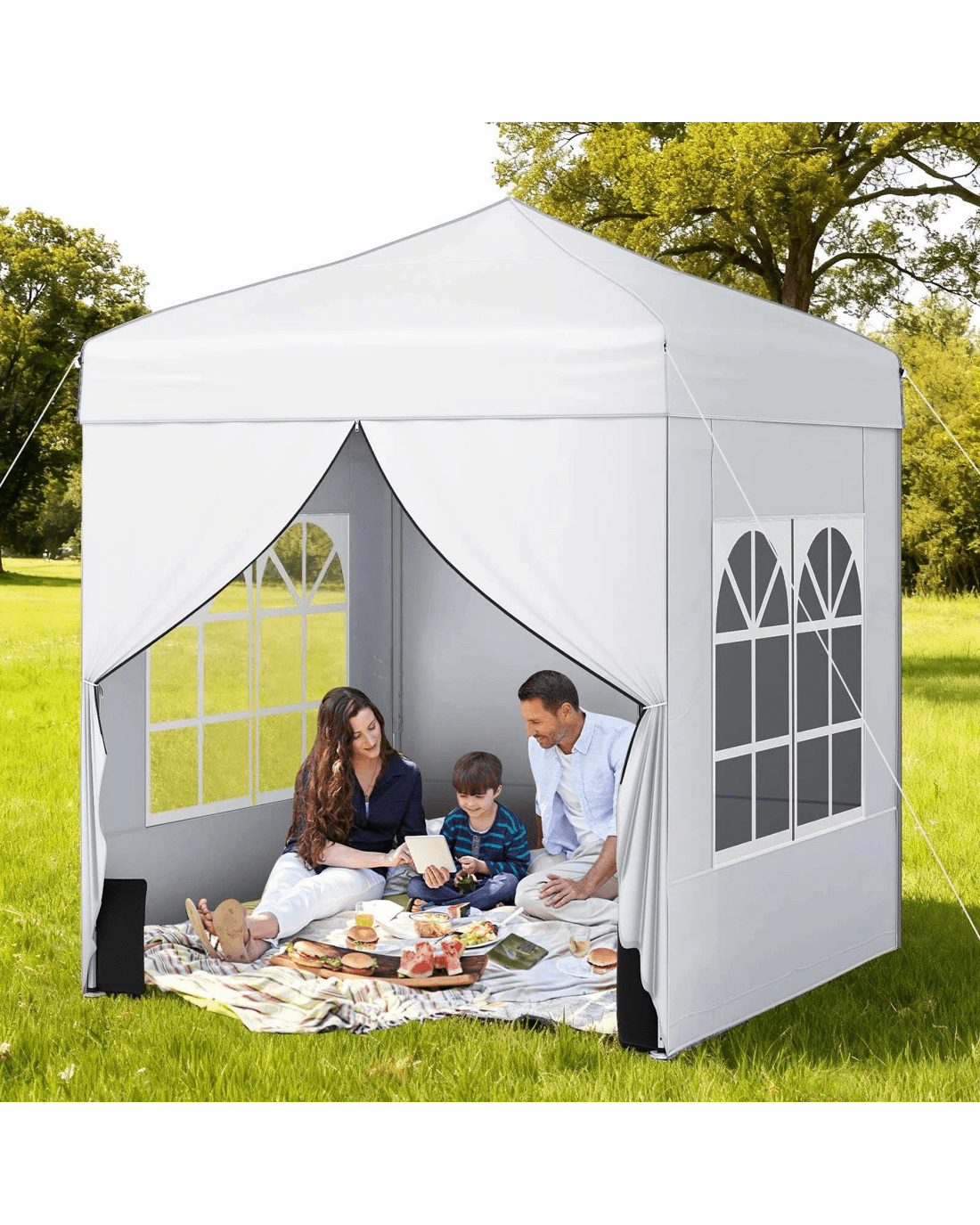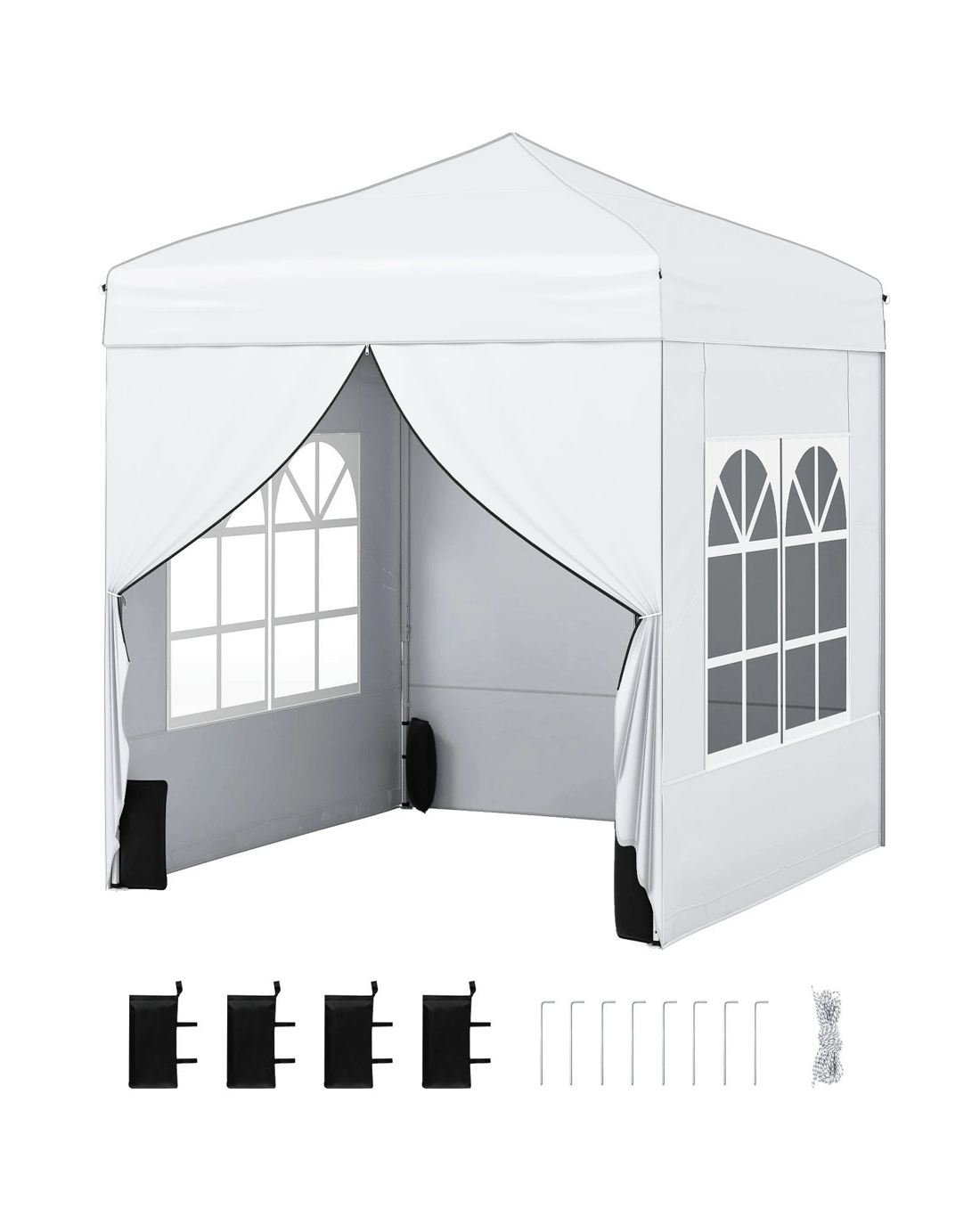 Our foldable and portable canopy tent measures 194 x 194 x 236-256 cm (L x W x H) and comes with 4 detachable sidewalls - 2 with zippered doors for easy entry and two with clear windows for airflow and light, designed for effortless outdoor shelter wherever you need it. Its robust truss carbon steel frame provides reliable support, while reinforced sandbags, ground stakes, and wind ropes secure the tent against unexpected breezes. The high-quality oxford cloth top features a protective silver coating, offering dependable sun and weather protection for outdoor gatherings, backyard parties, and vendor events. Easy to transport with a wheeled storage bag and quick to set up without tools, this canopy is a practical addition to any outdoor activity.
