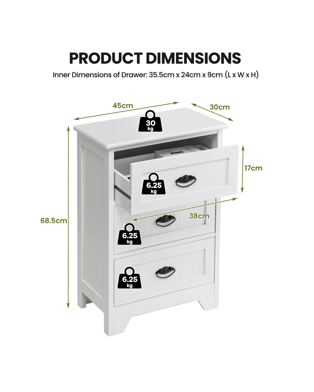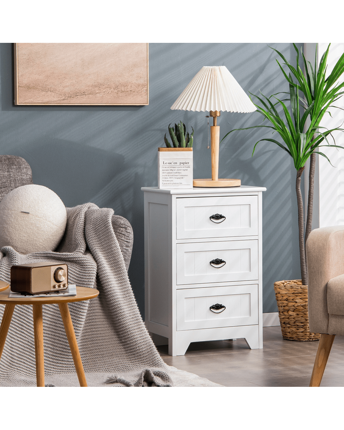 The bedside table with 3 drawers is a good addition to store bedtime essentials and your private items. Meanwhile, it has a spacious tabletop for vases, alarm clocks, chargers and more. Put the end table in your bedroom, living room or study, you can enjoy your leisure life with everything by you side. What's more, the sofa side table is not only functional, but also attractive to decorate your space. The exquisite handles highlight the design concept, catering you taste of vintage style. And the nightstand also has a sturdy construction, which is sure to serve you for long. The premium painted MDF material prolong the service life while ensuring hassle-free maintenance.