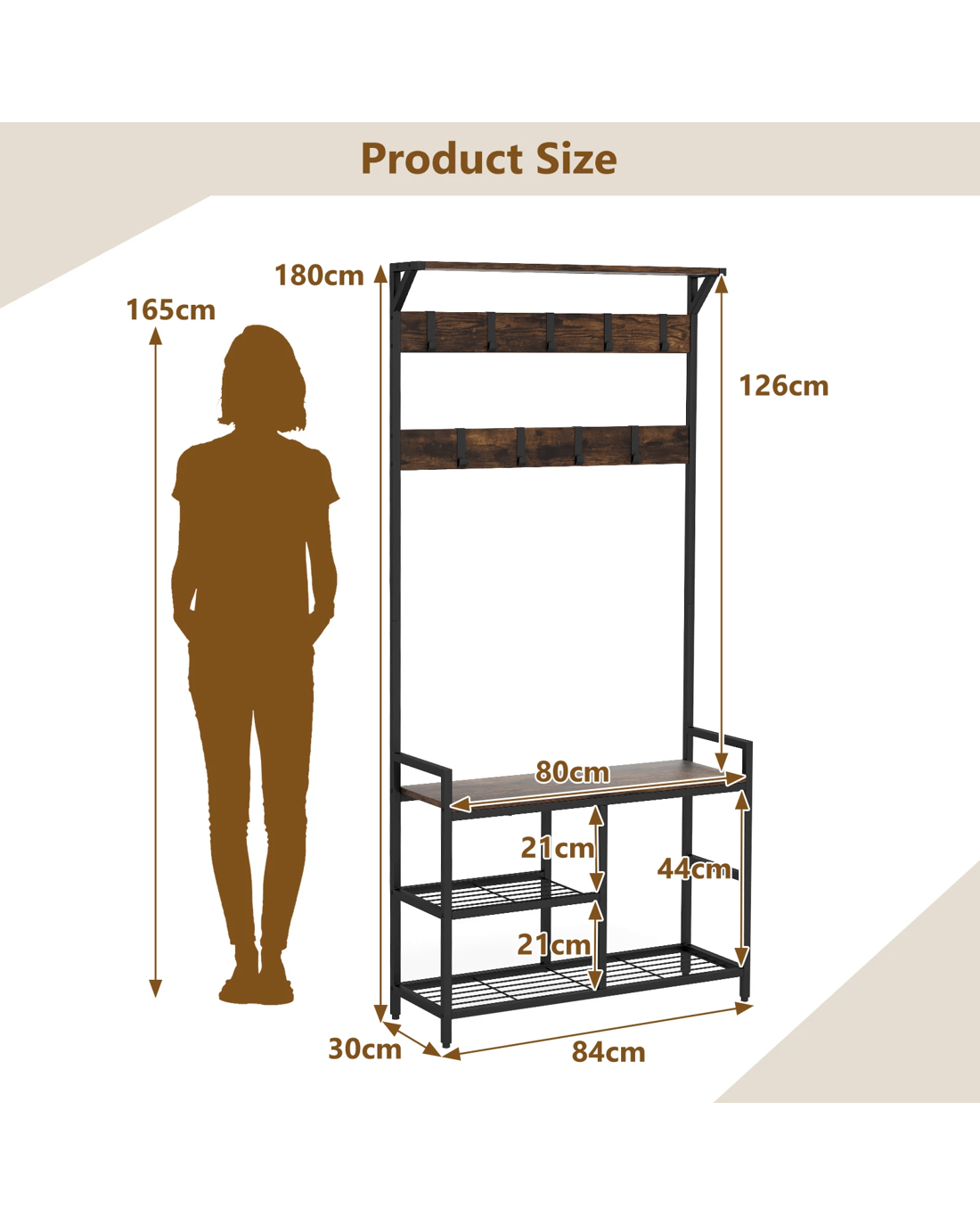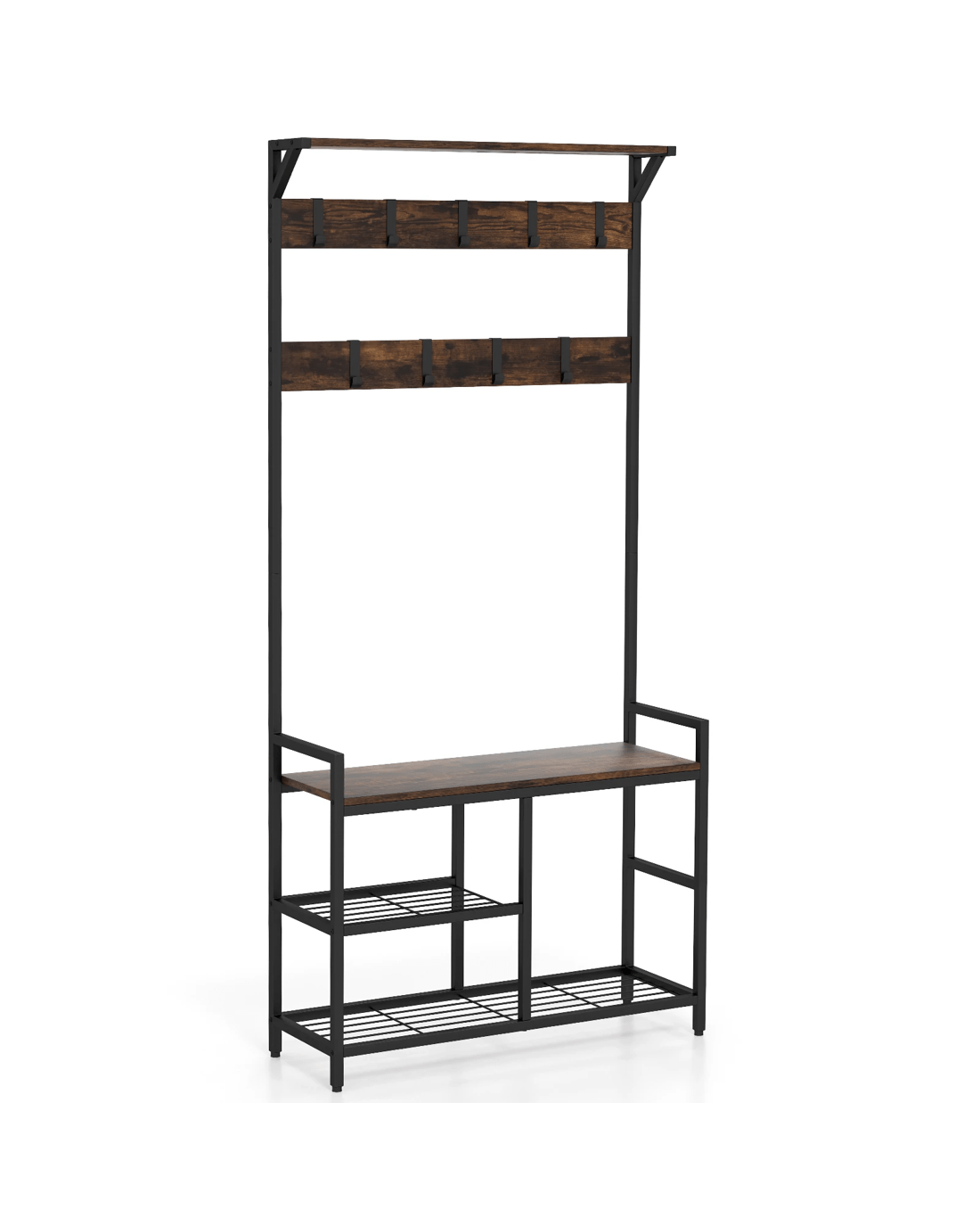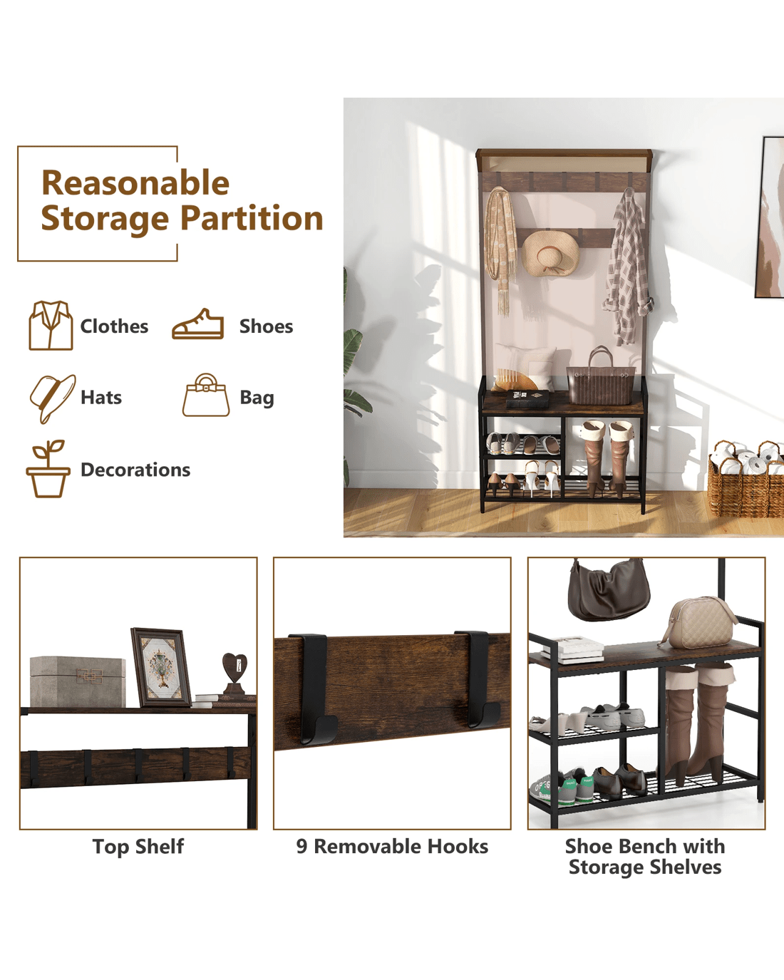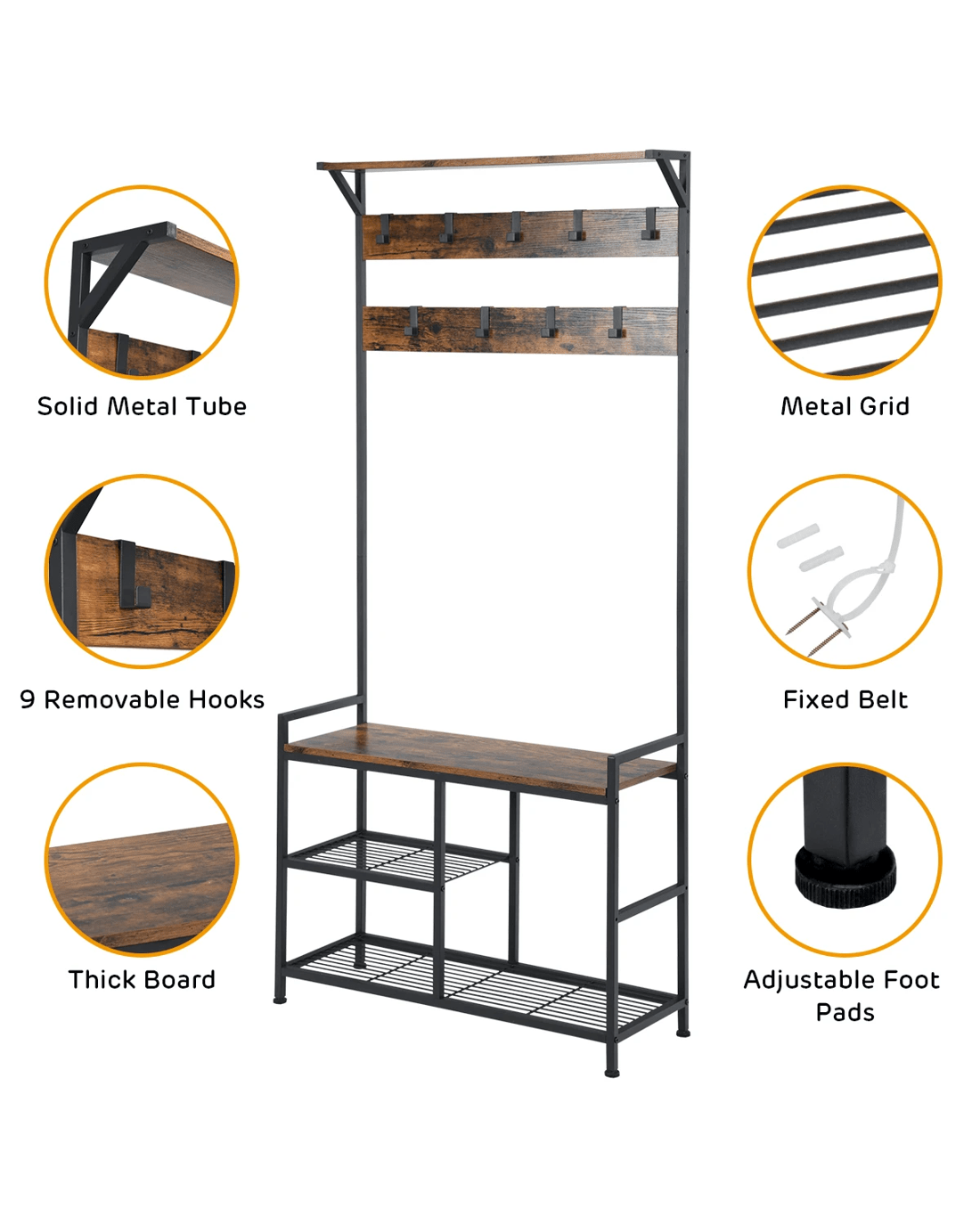 Such a multipurpose coat rack will surely make your life more convenient. There is a top shelf for decorations, 1 bench for convenient shoe changing, and varied mesh storage shelves for placing shoes. Additionally, 9 removable hooks are perfect for hanging items of different sizes. Considering security use, the coat rack is equipped with anti-toppling device for better stability. This 3-in-1 industrial coat rack combines aesthetic beauty with reasonable storage partition, making it ideal for entryway, living room or bedroom.