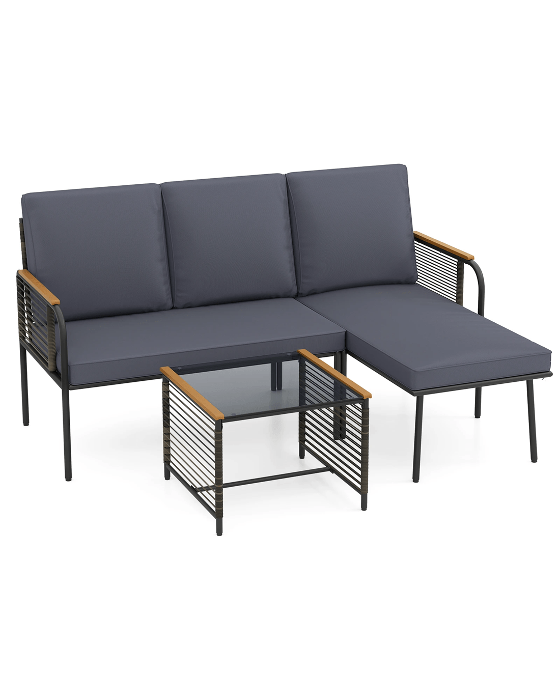 Crafted from sunproof and breathable PE rattan, the 2-seat sofa and chaise lounge offer both elegance and longevity. Soft, elastic cushions with removable covers provide exceptional comfort and easy maintenance. The tempered glass side table adds functional charm, secured by suction cups for stability. Perfectly designed for backyard, garden, or porch, this robust 3-piece patio furniture set invites you to unwind and enjoy meaningful outdoor moments.