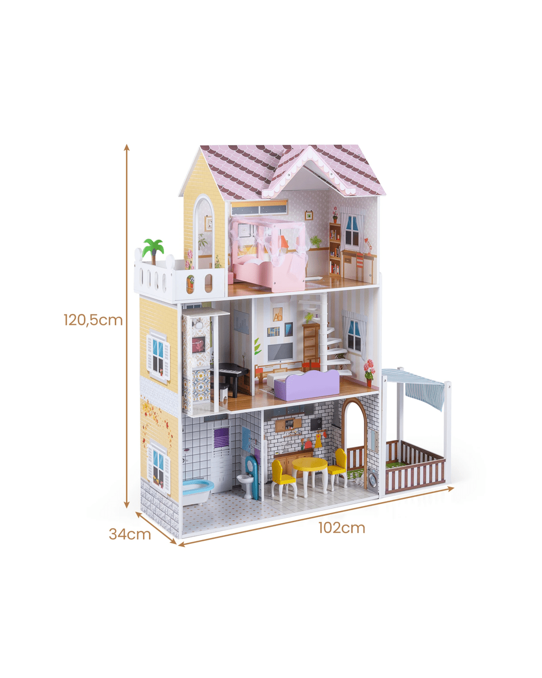 This wooden dollhouse offers a detailed and engaging 3-story design, perfect for little ones aged 3 and up to explore creative pretend play. Its open-concept layout includes multiple rooms such as a bedroom, balcony, piano room, living room, bathroom, kitchen, and garden, providing diverse settings for imaginative storytelling and role-playing. The dollhouse comes with furniture accessories that allow little ones to arrange and customize their family home scenes. security comes first. The combination of sturdy construction and smooth finishes ensures reliability and durability. Its thoughtful features and detailed rooms make it a versatile toy that supports hours of imaginative play.