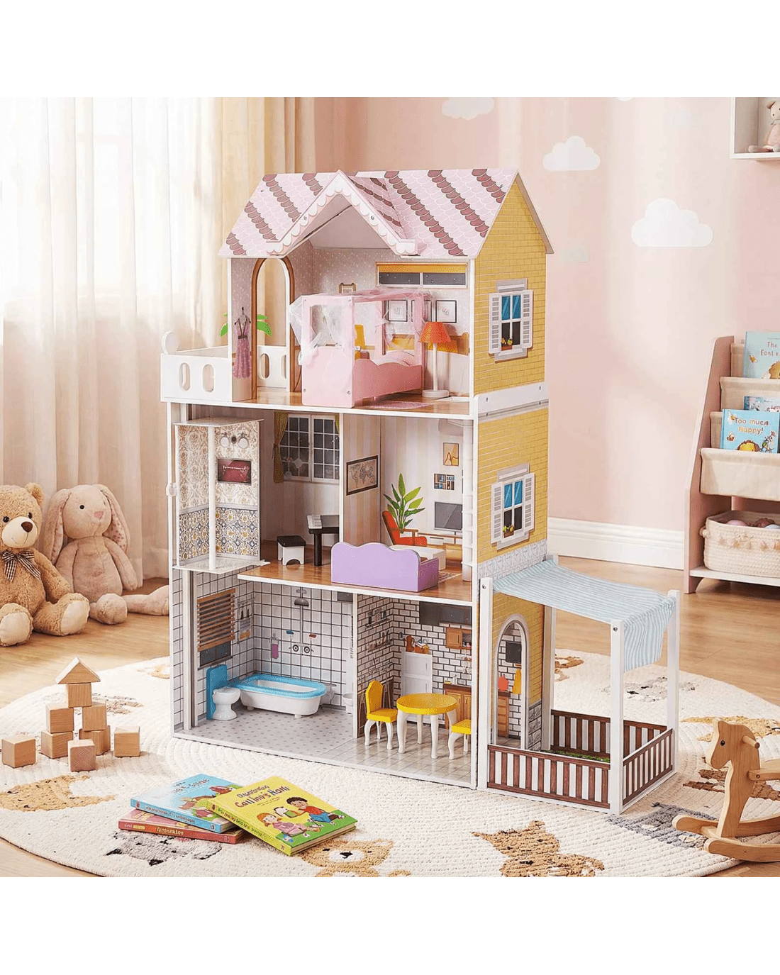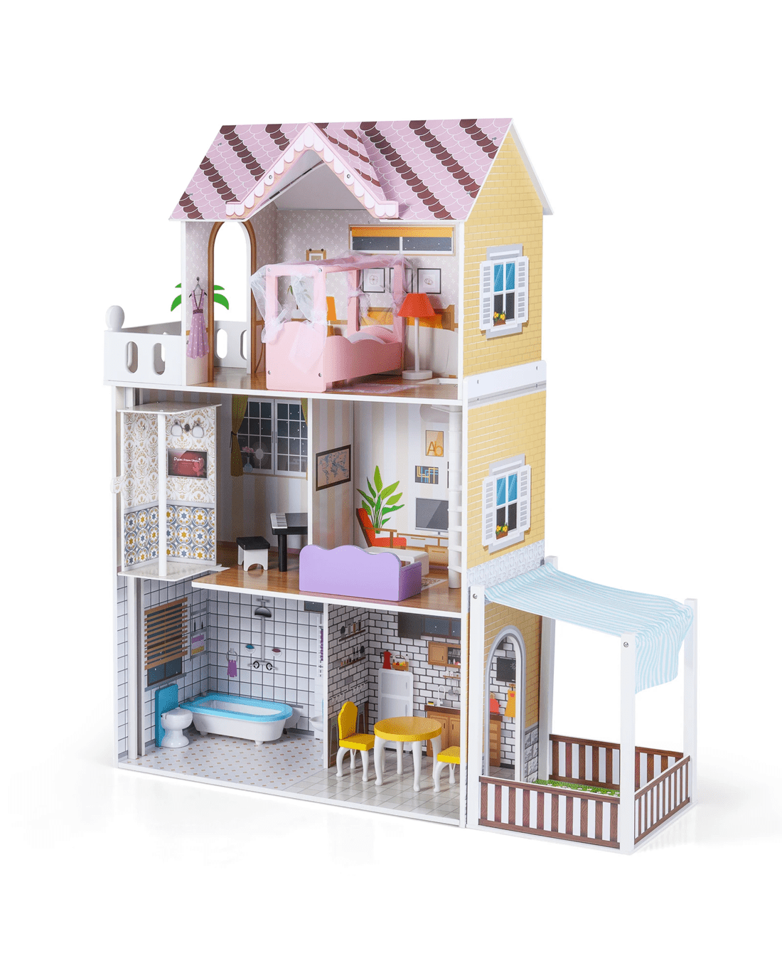 Costway 3-Story Pretend Dollhouse Family DIY Play House - Pink