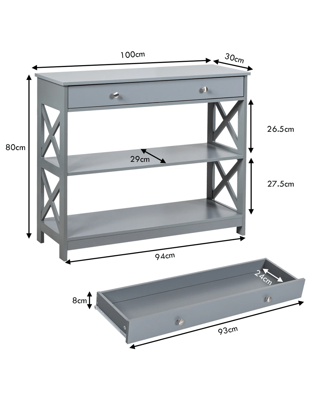 Designed with the spacious table, the large drawer and 2 storage shelves, this wooden sofa table comes with ample storage space for your belongings, such as key, sunglasses, photo frame and more. Made of solid MDF with odorless painting finish, this premium entryway table is durable and stable to hold up to 95kg. Measuring with 110cm x 30cm x 80cm (L x W x H) in dimension, this 3-tier console table will make a timeless addition to your living room, hallway and entryway, keeping your home clean and tidy.