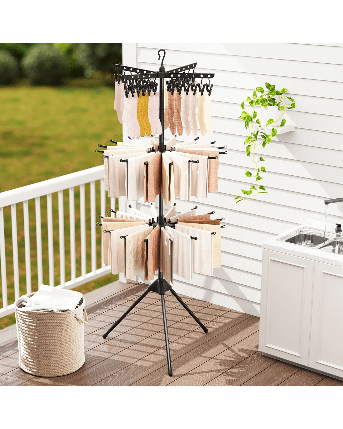 Standing at 178cm, this 3-tier laundry drying rack offers ample space to cater to a variety of drying needs. It is equipped with 24 removable clips and 32 rods that accommodate socks, towels, little ones bibs, underwear and more. The 360° rotatable arms allow you to access and organize your laundry with ease. Additionally, this drying rack features a detachable top equipped with a hook for versatile use. 3 sturdy metal legs offer high stability while the windproof buckles help secure your towels in place. Thank to the foldable design, this drying stand is easy to store and takes up little space when not in use.