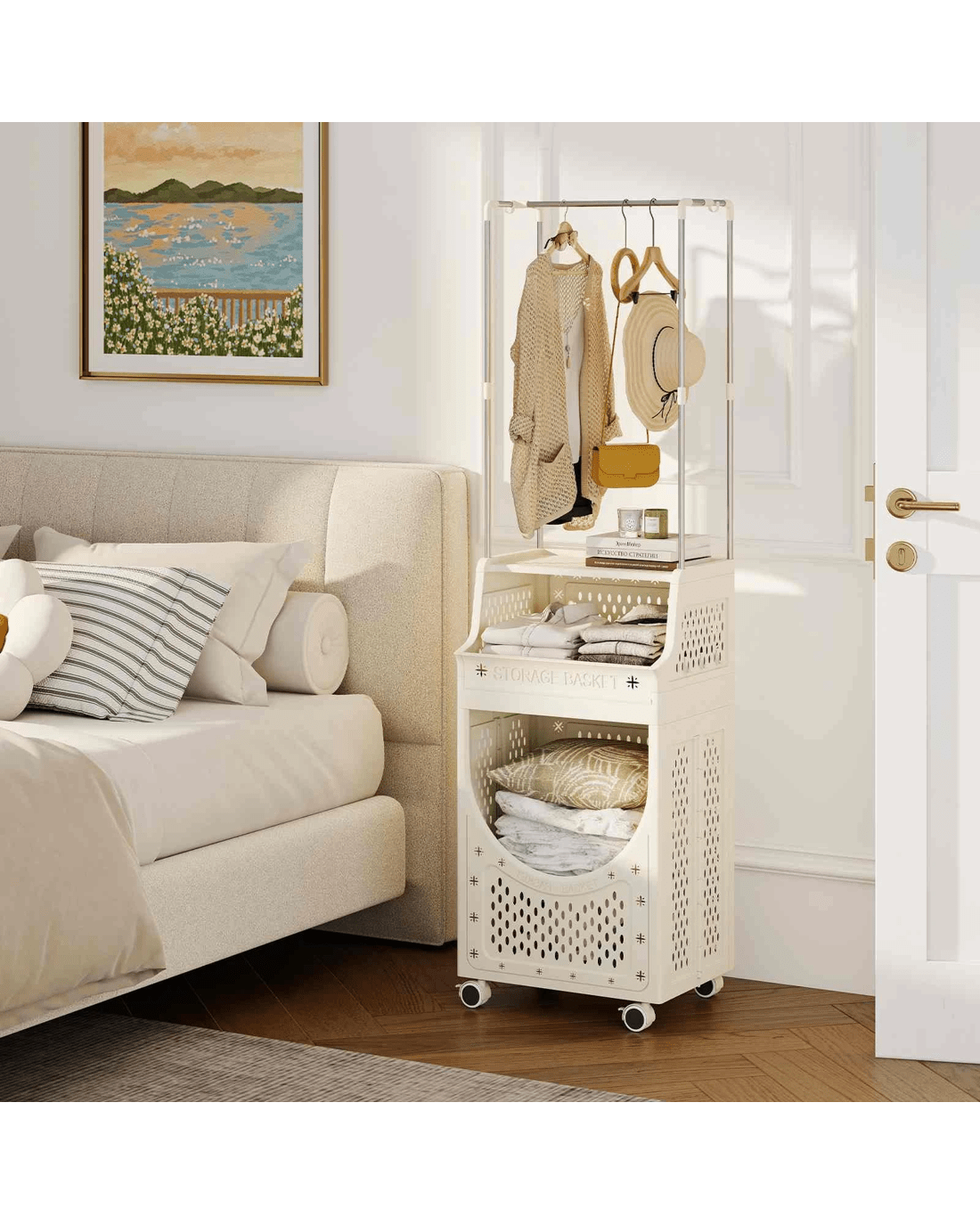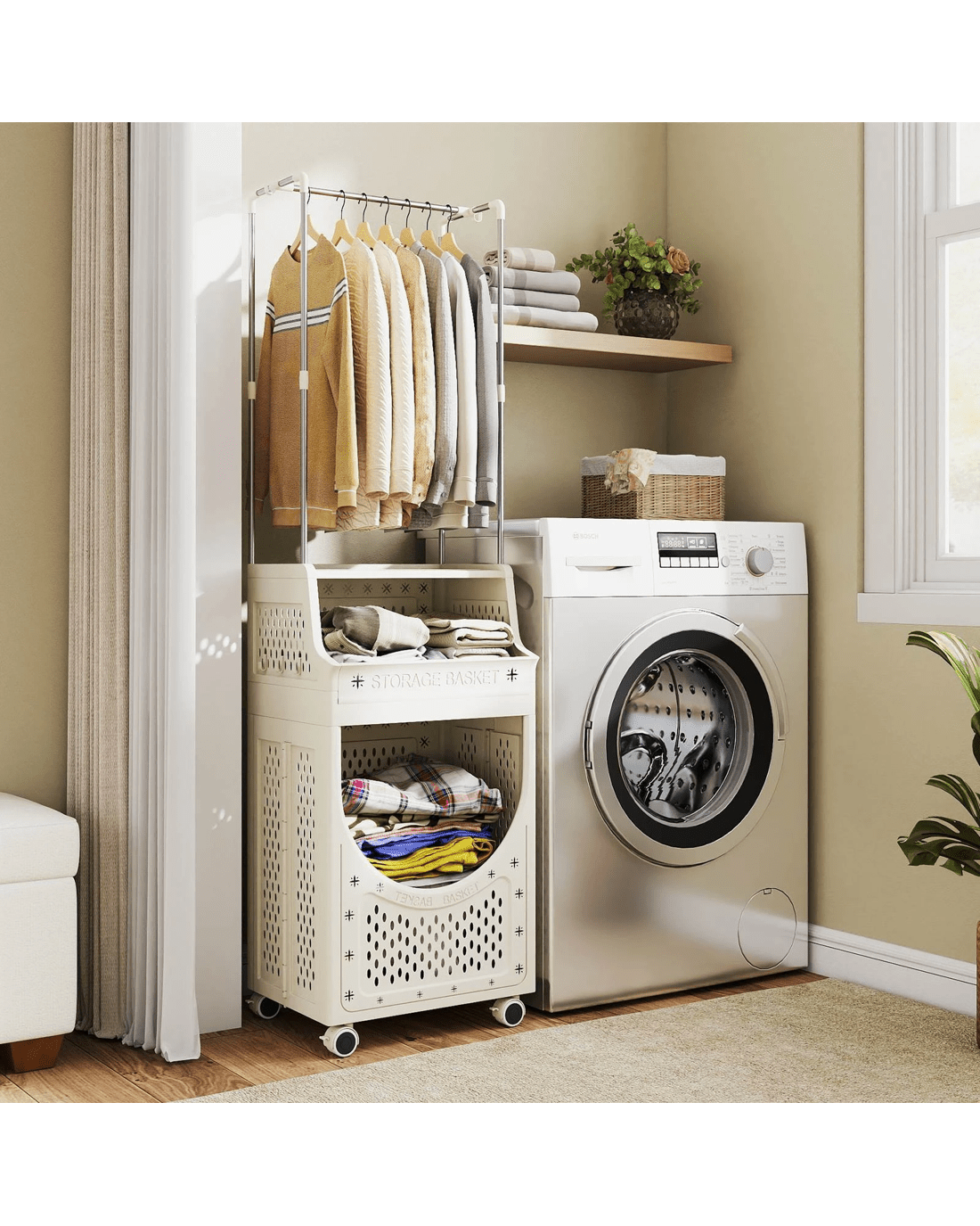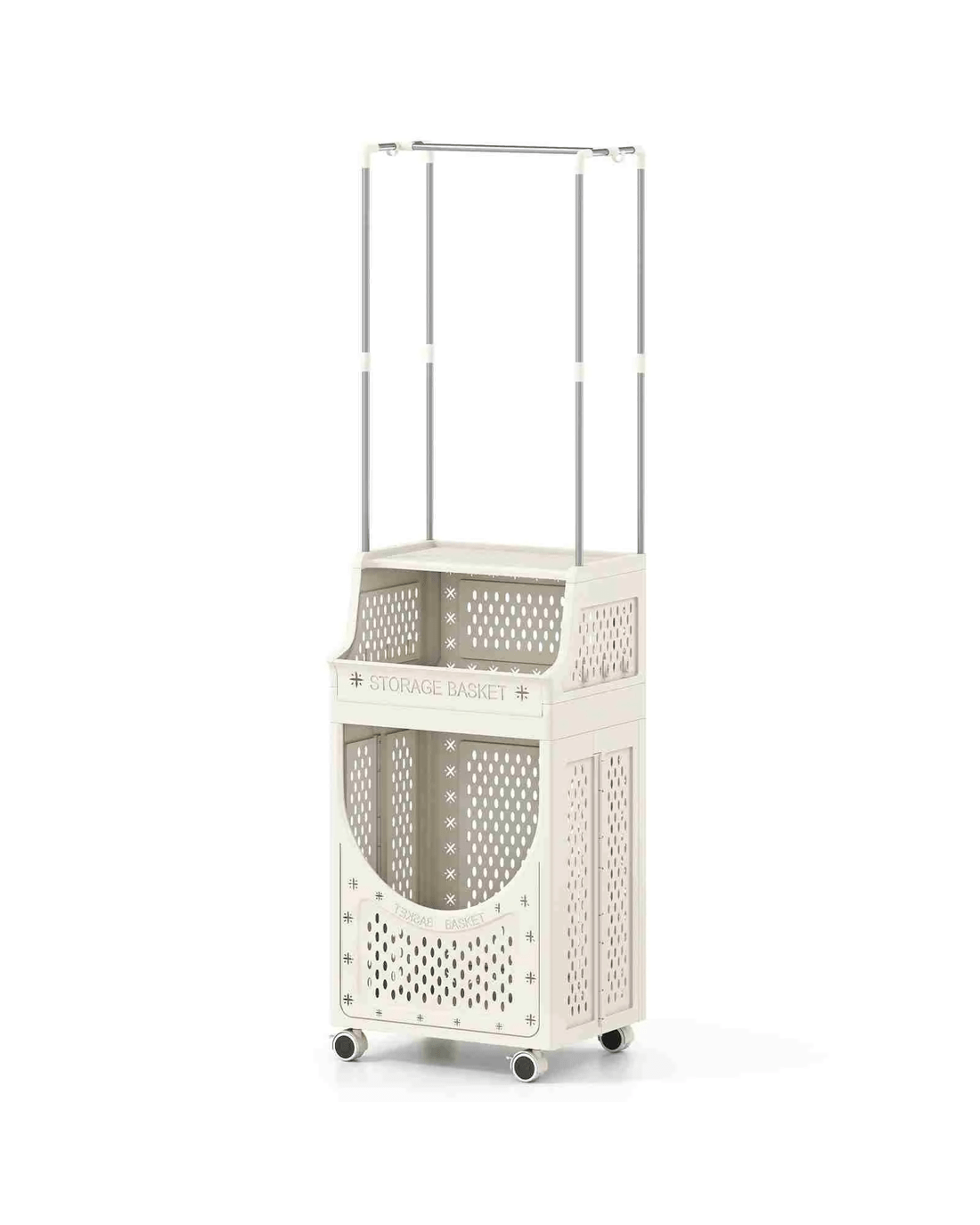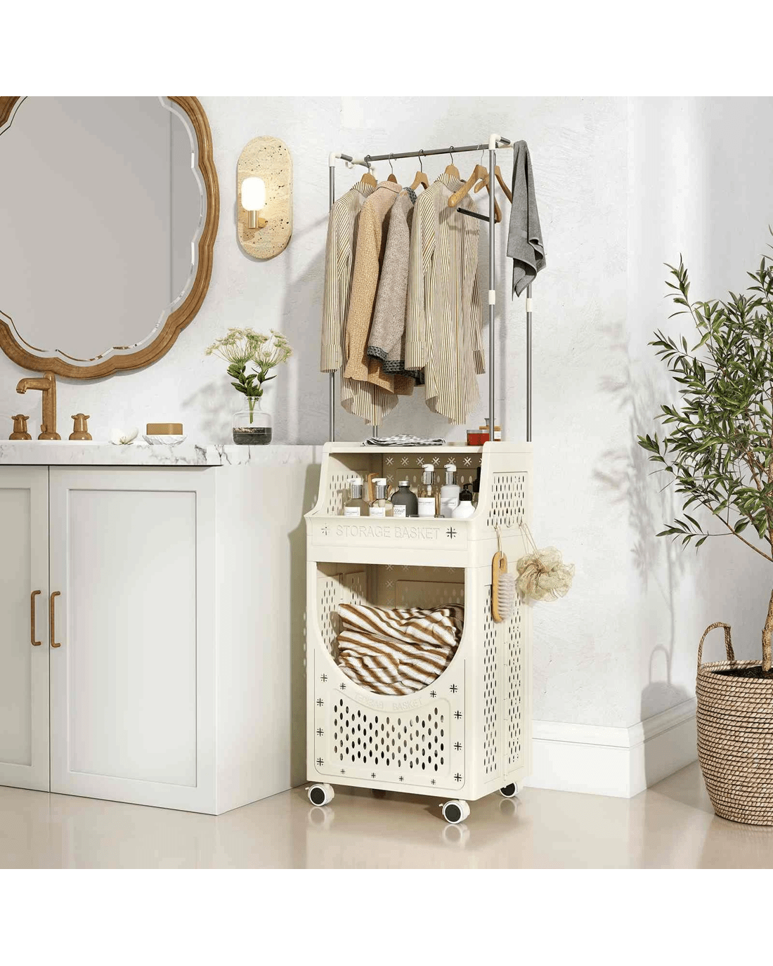 This 2-in-1 laundry cart combines a hanging bar for air-drying clothes, a spacious hamper and a basket for garments, socks or blankets, along with a top shelf for detergents. Plus, 8 extra hooks holds towels or brushes with ease. The tool-free assembly lets you unfold and secure it in seconds, and it collapses flat for compact storage. With 4 universal wheels (2 lockable), it glides effortlessly between rooms and stops exactly where you need it. Besides, raised baffles and ventilated design keep items secure and fresh. Simplify laundry day with this versatile 2-in-1 cart!
