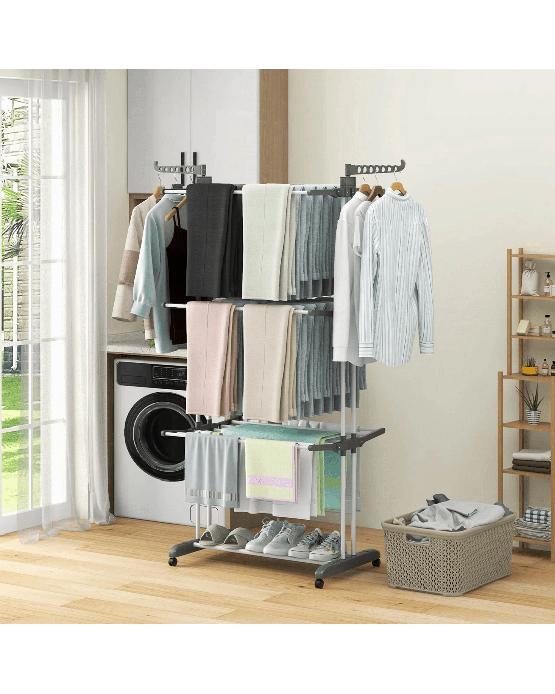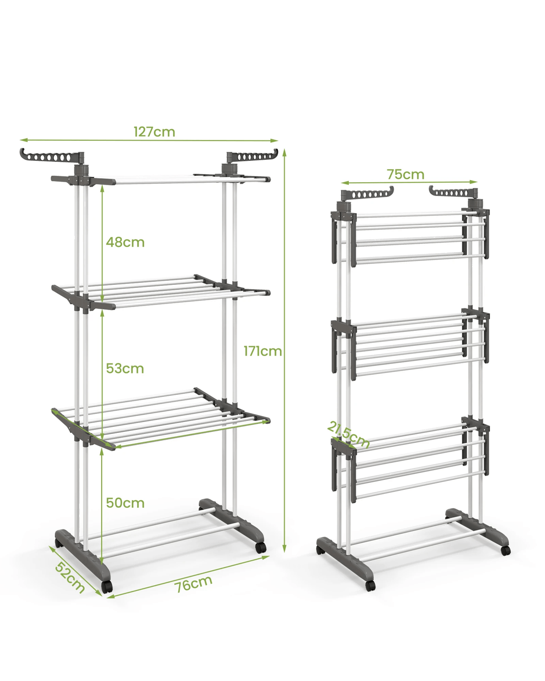 3 tiers of large drying space with 24 hanging rods