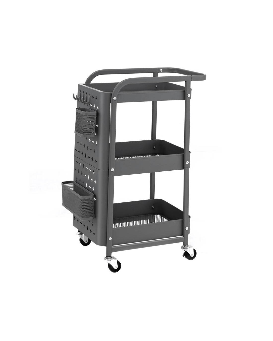 The utility cart with space-saving and tiered design doesn’t occupy too much floor space while bringing ample storage space to your home and office. The 3 mesh shelves can hold various sundries. Besides, the detachable pegboards are equipped with 2 bins and 4 hooks, providing you with a DIY area for personalized organization. The powder-coated carbon steel ensures great stability and durability. With 4 universal casters, you can easily move the cart from room to room. Moreover, 2 of the wheels can be locked in place to avoid sudden movement.