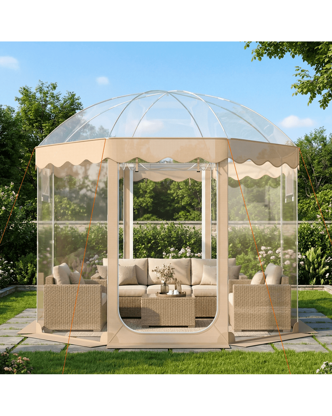 Our spacious 305 x 305 cm clear bubble tent boasts a spacious 9 m2 interior and a 210 cm peak height, which is suitable for 8-10 people, offering a 540° clear view while allowing natural lights in. Its all-season design features thick PVC and rip-resistant 210D Oxford fabric with a waterproof PU coating, making it a dependable winter tent that shields against rain, wind, and harmful sun rays. Engineered with robust fiberglass rods, 8 wind ropes, 16 glow-in-the-dark stakes, and 4 sandbags, this outdoor igloo dome stays steady and secure, even in challenging weather. 2 large roll-up doors with smooth zippers and 2 mesh windows maximize ventilation, ensuring this tent is always ready for backyard parties, camping, or any outdoor adventure
