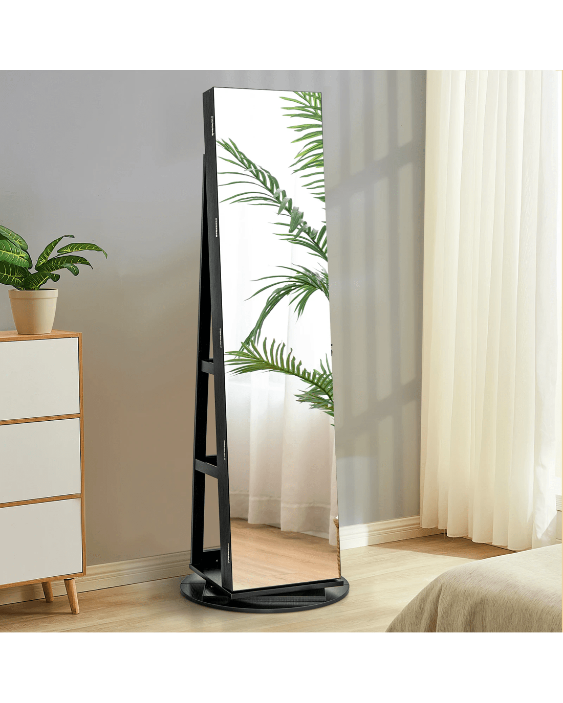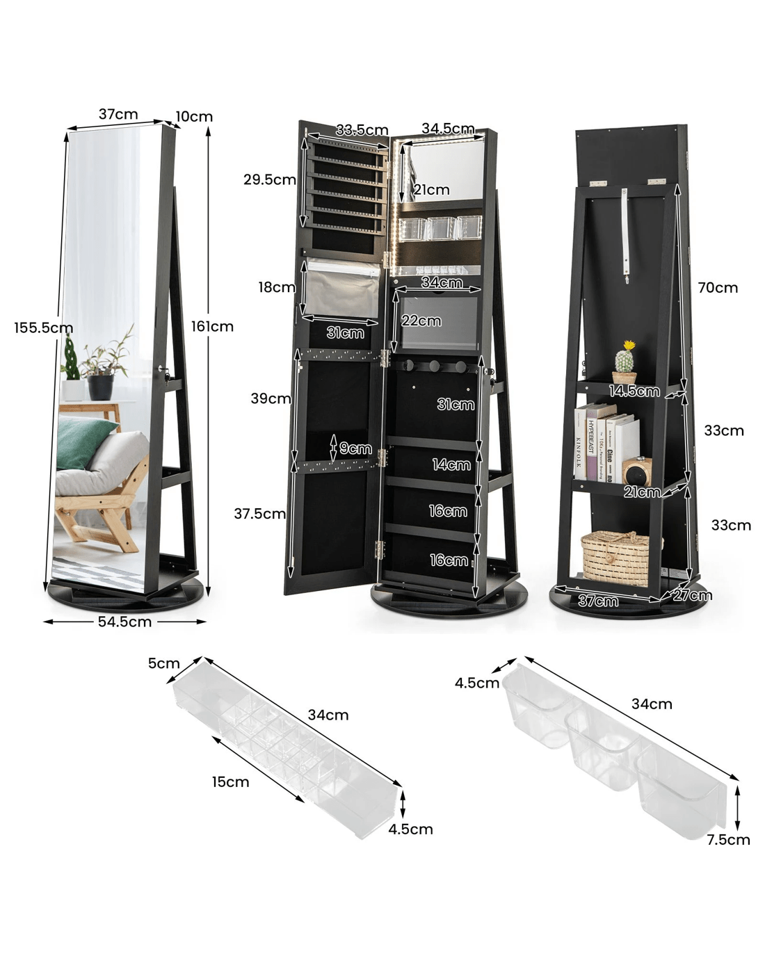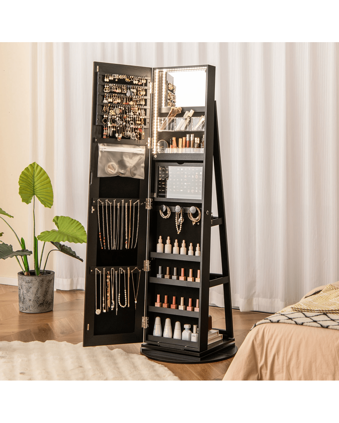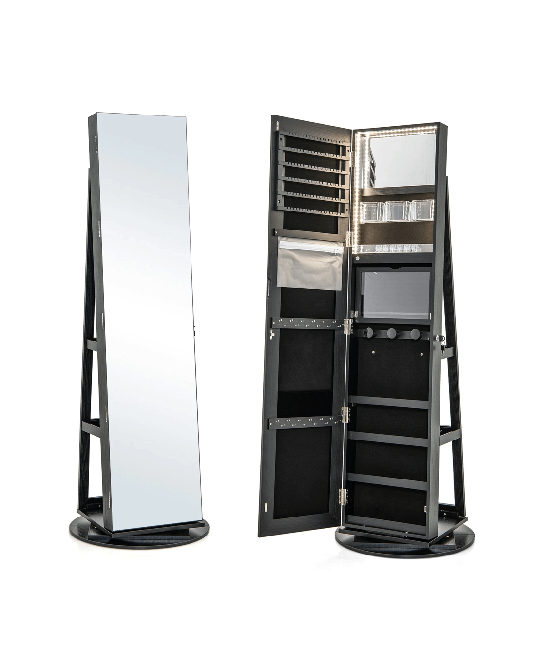 Costway 360° Rotating LED Jewellery Cabinet Full Length Mirror Armoire Makeup Cabinet - Black