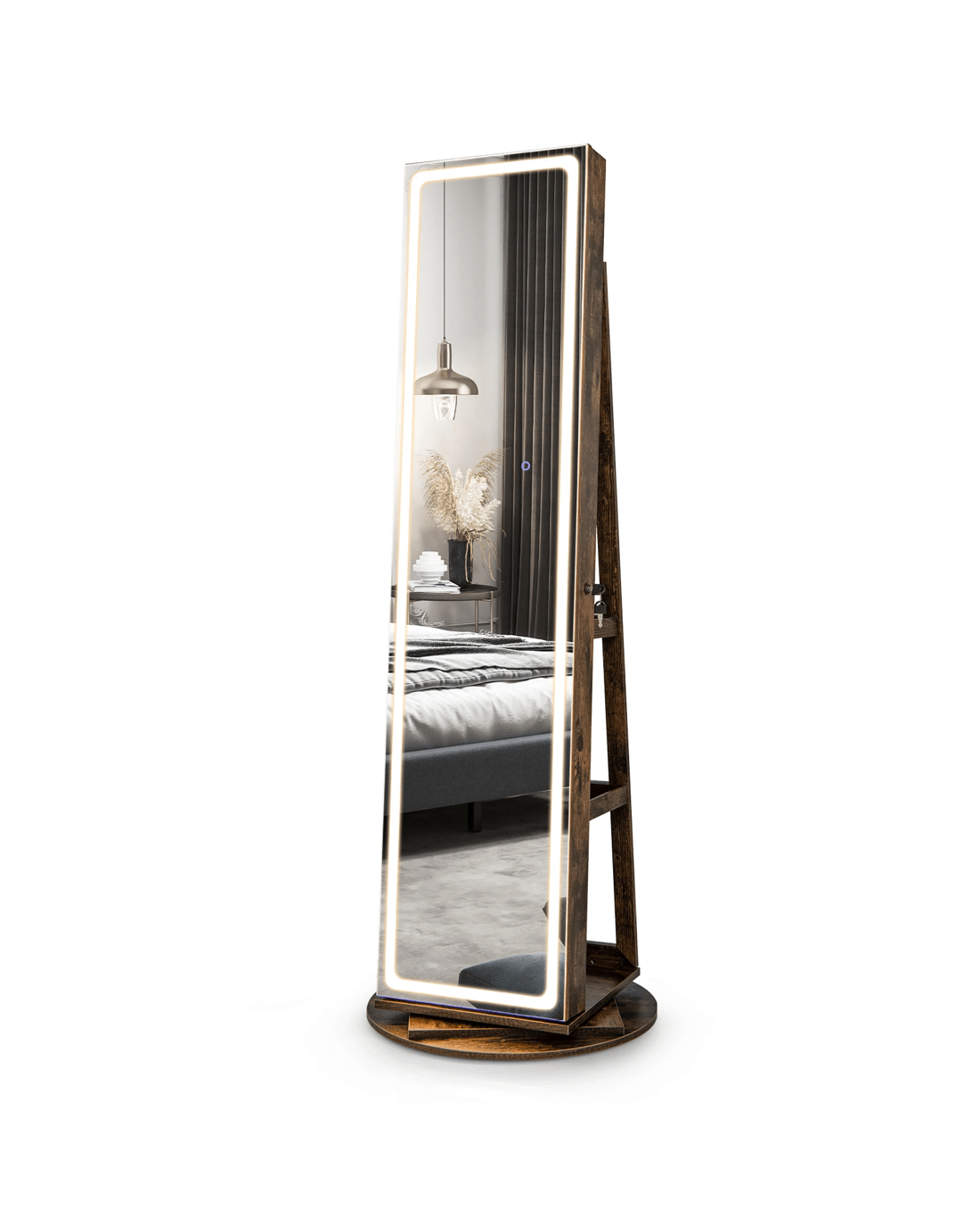 Costway 360° Swivel Jewellery Cabinet LED Mirror Jewelry Cupboard w/Storage Shelves - Brown