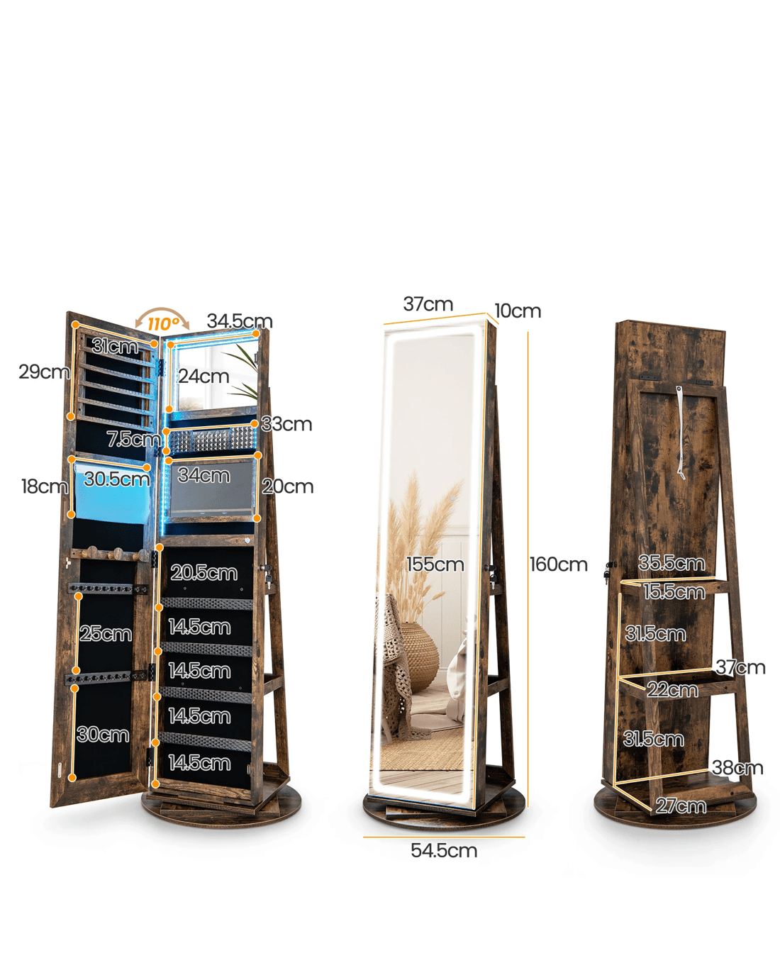 3-in-1 design: full-length mirror + jewelry cabinet + storage shelves